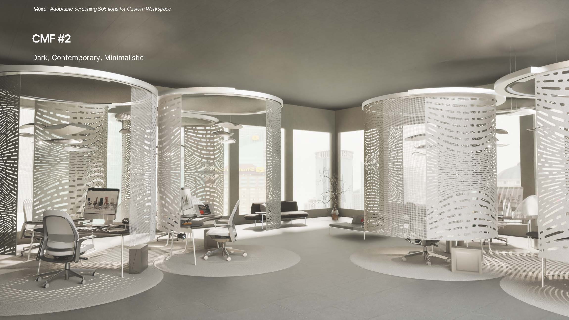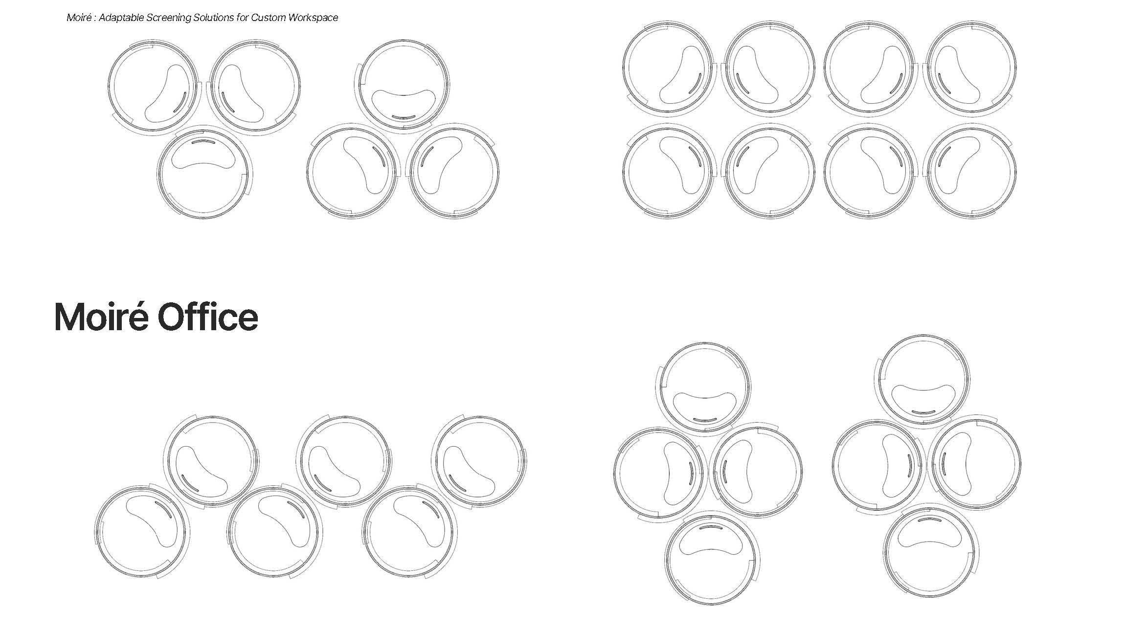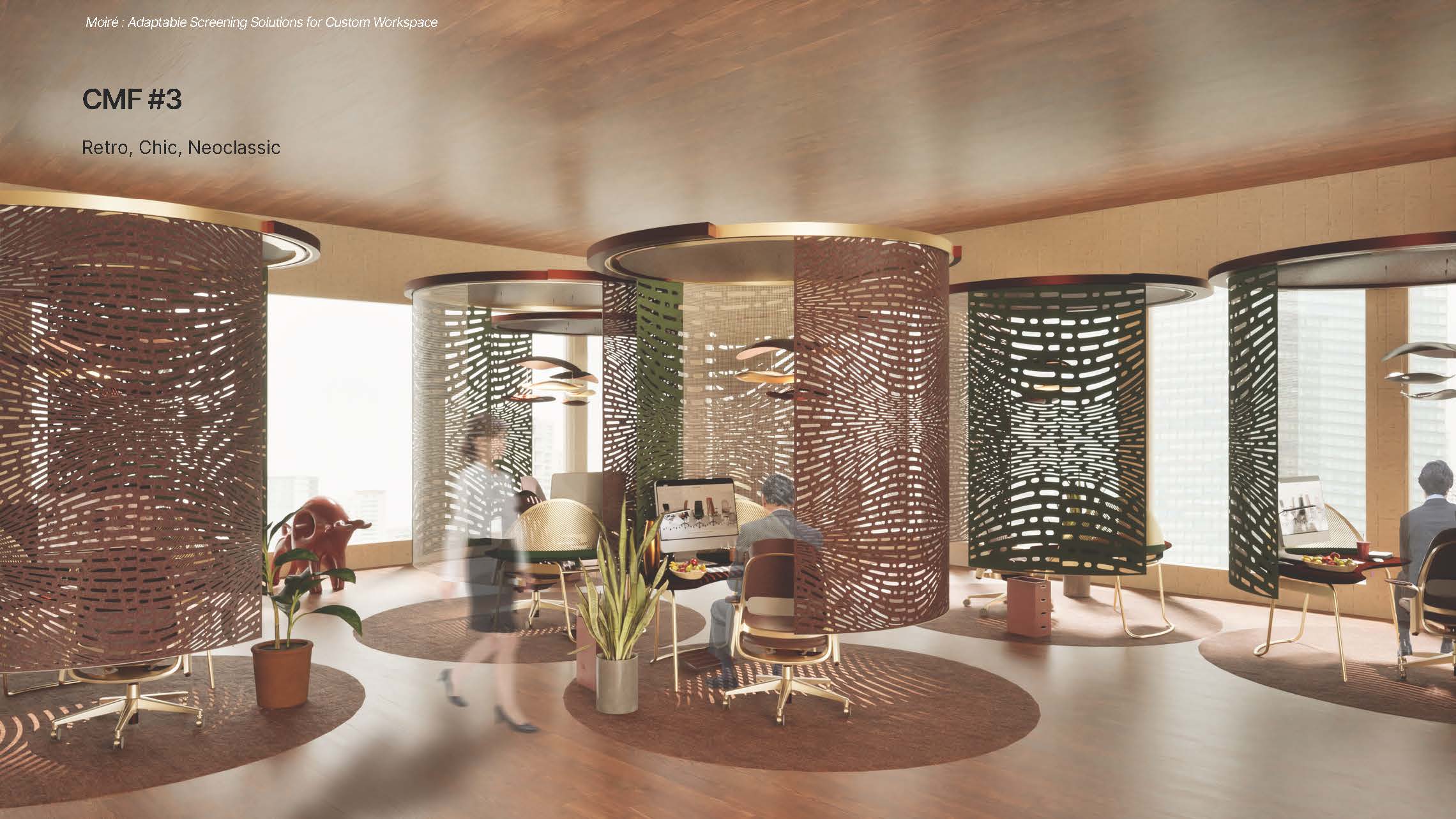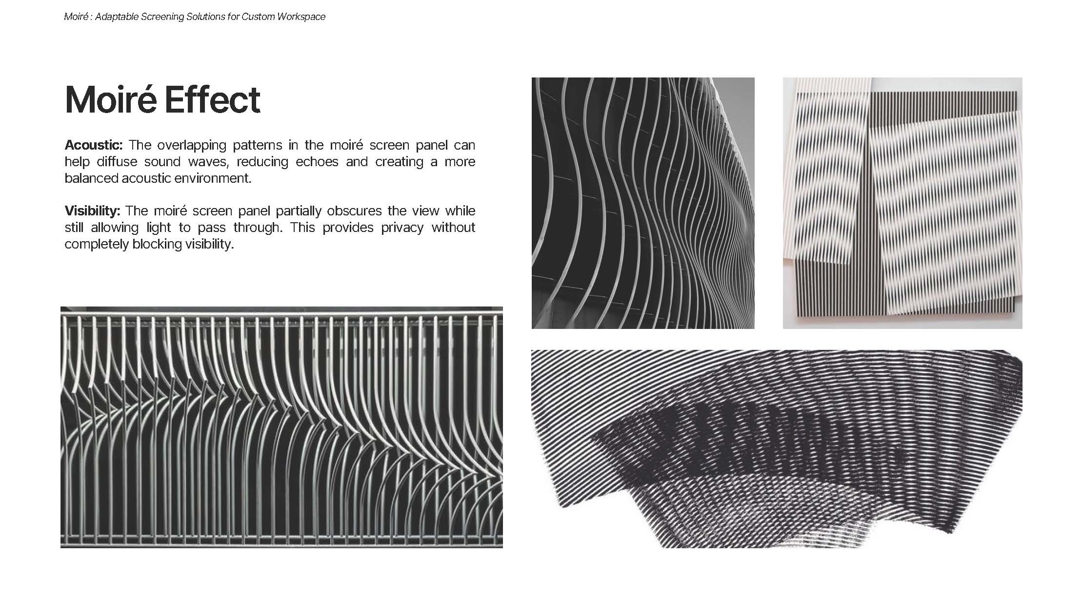The Moiré design series empowers users to customize their workspaces. It enhances visual and acoustic separation through furniture, lighting, and spatial design by offering adjustable solutions using overlapping moire patterns for varying degrees of privacy.