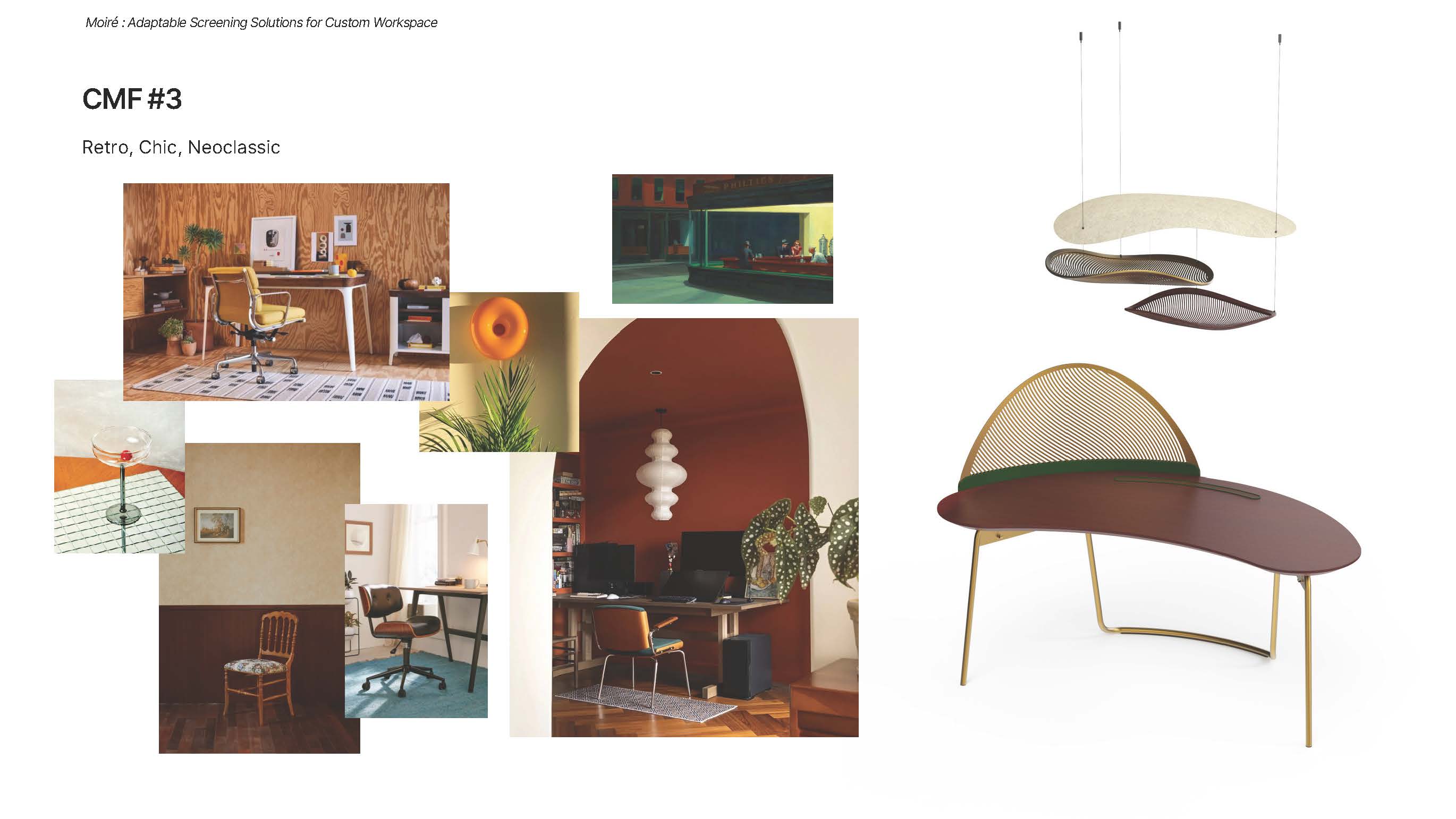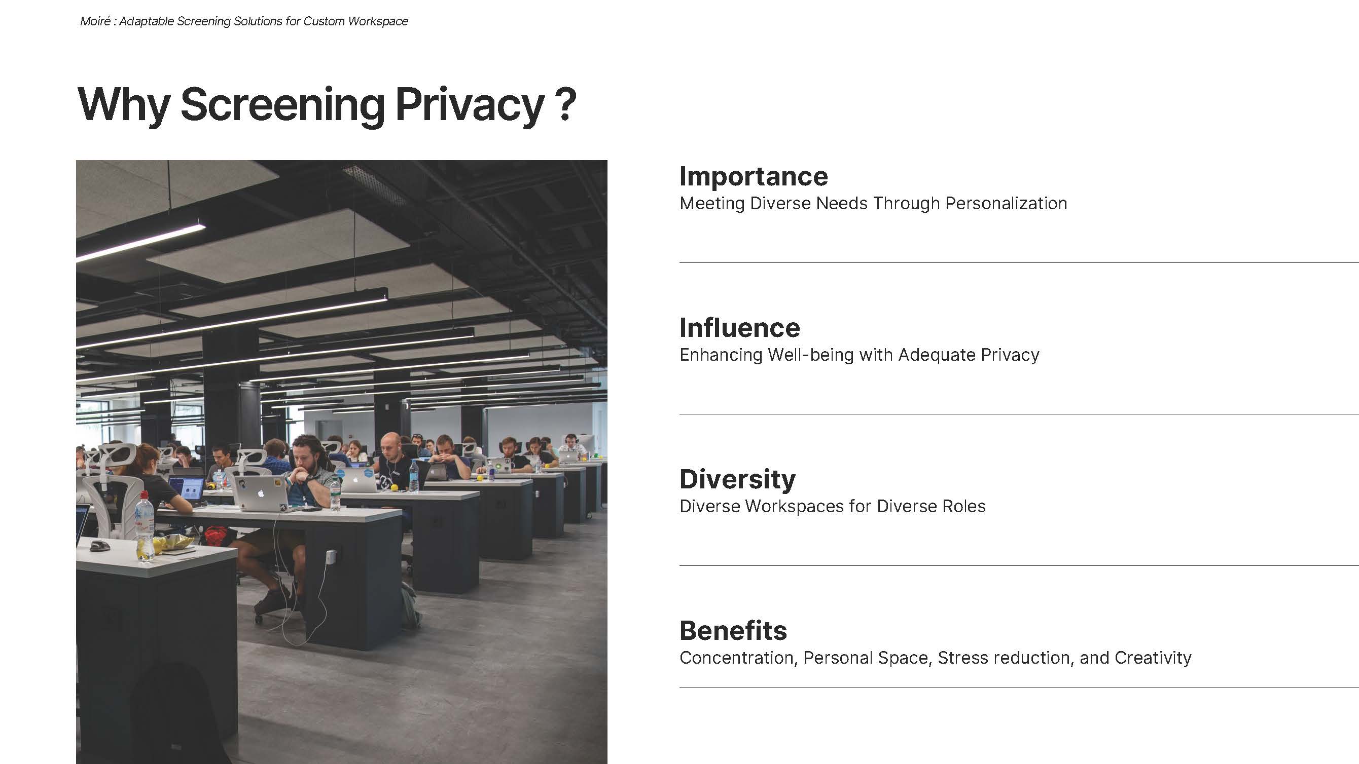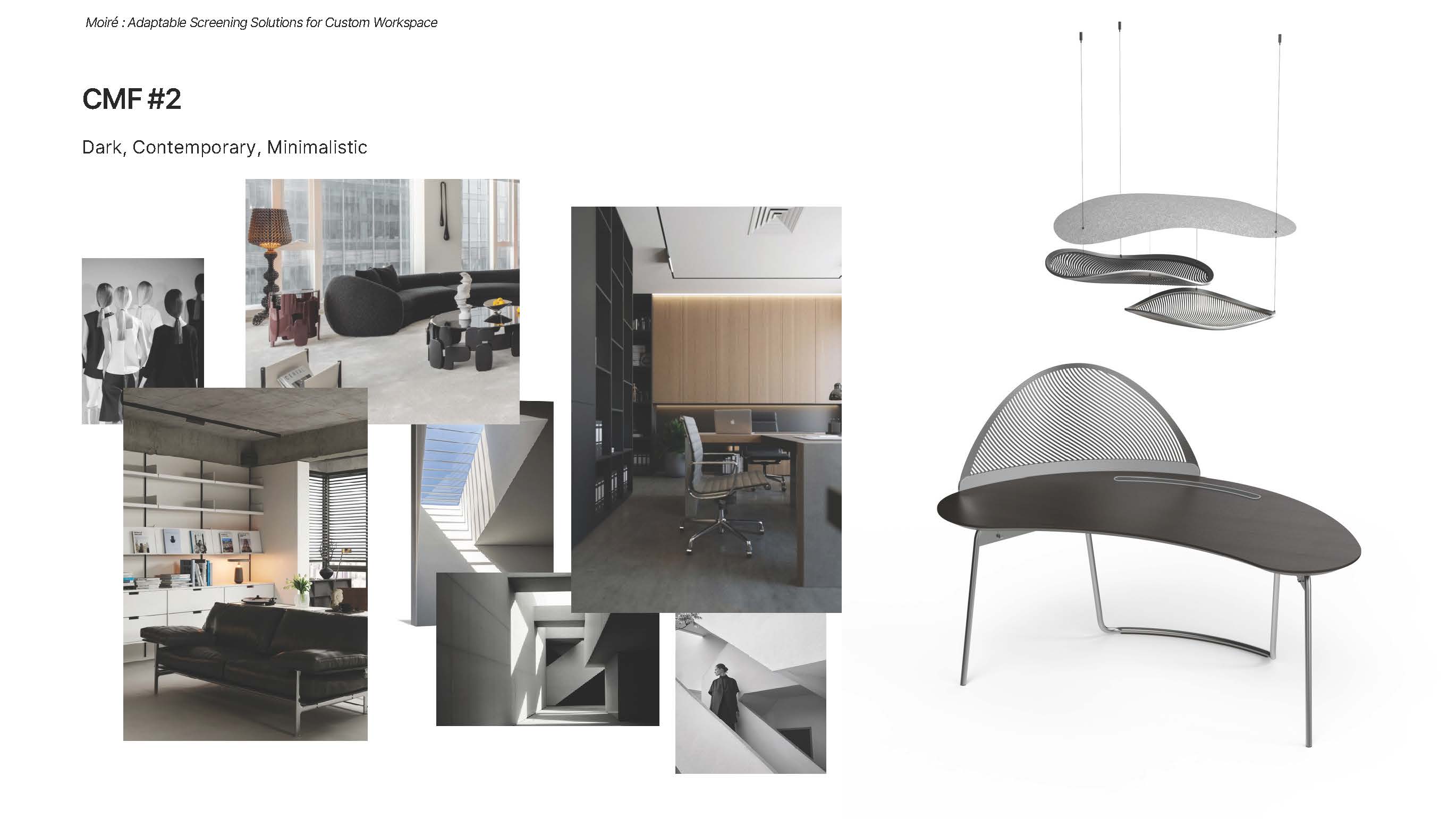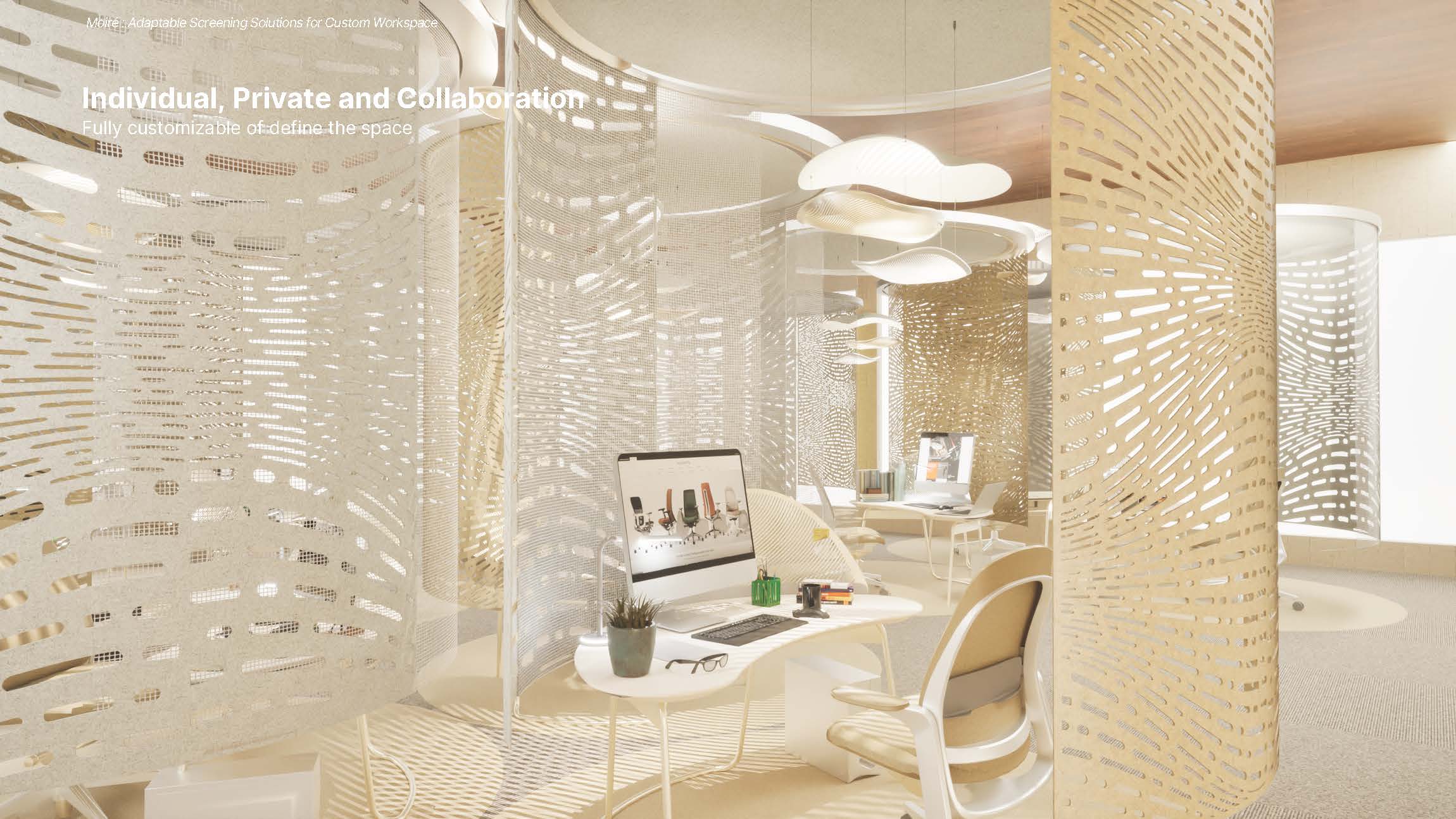 The Moiré design series empowers users to customize their workspaces. It enhances visual and acoustic separation through furniture, lighting, and spatial design by offering adjustable solutions using overlapping moire patterns for varying degrees of privacy.