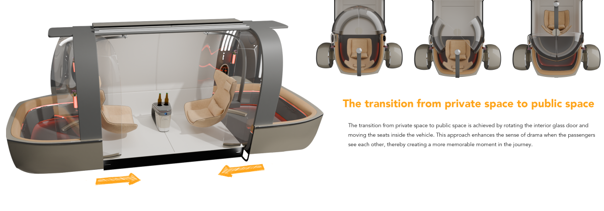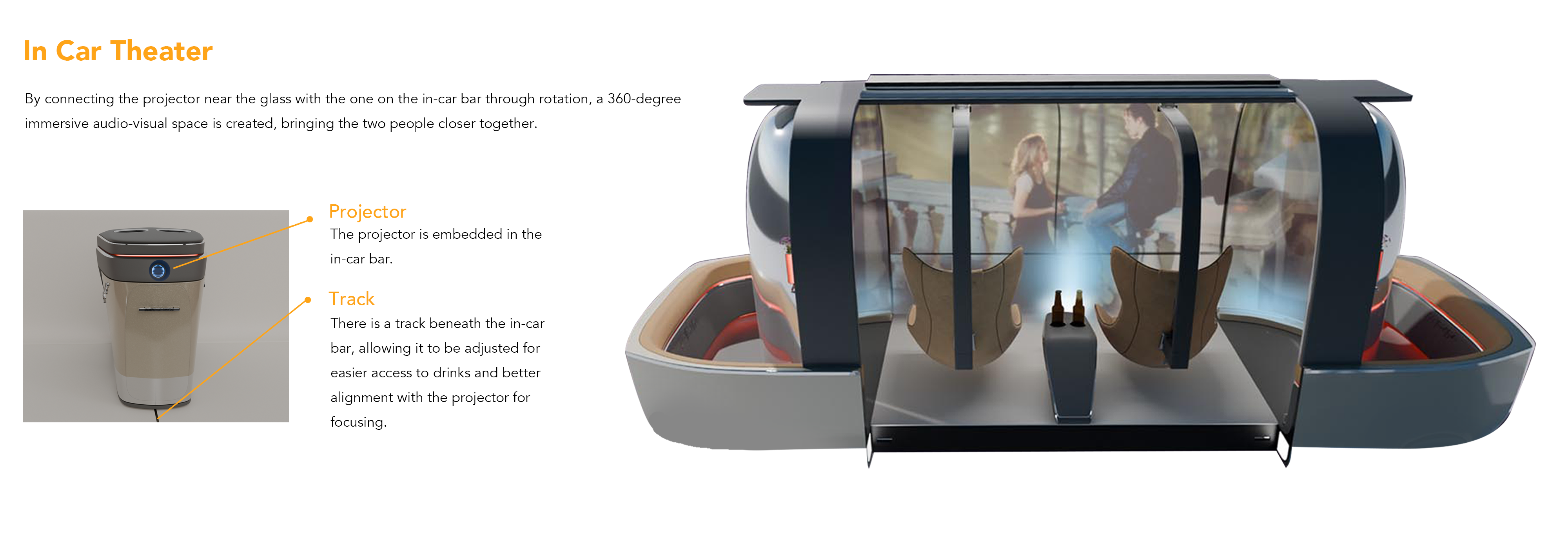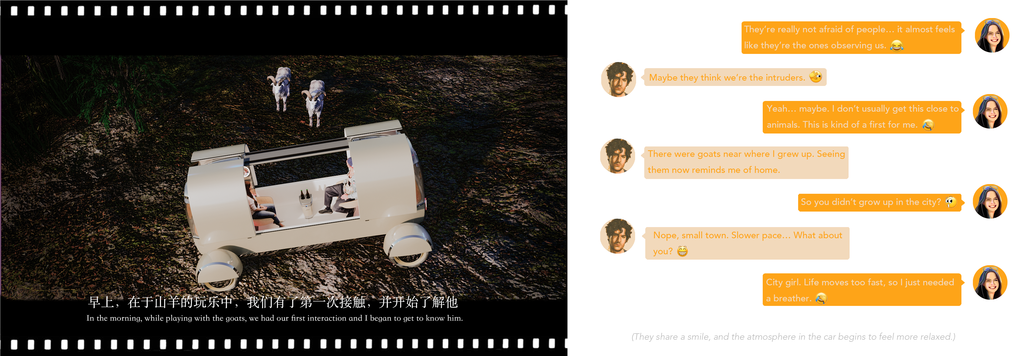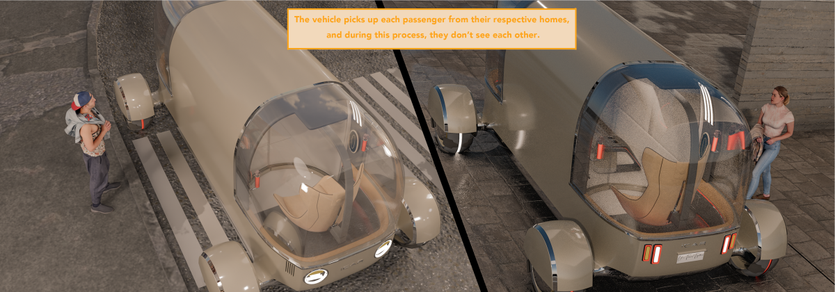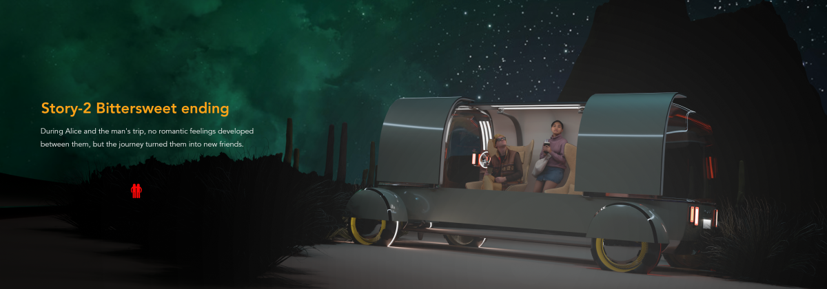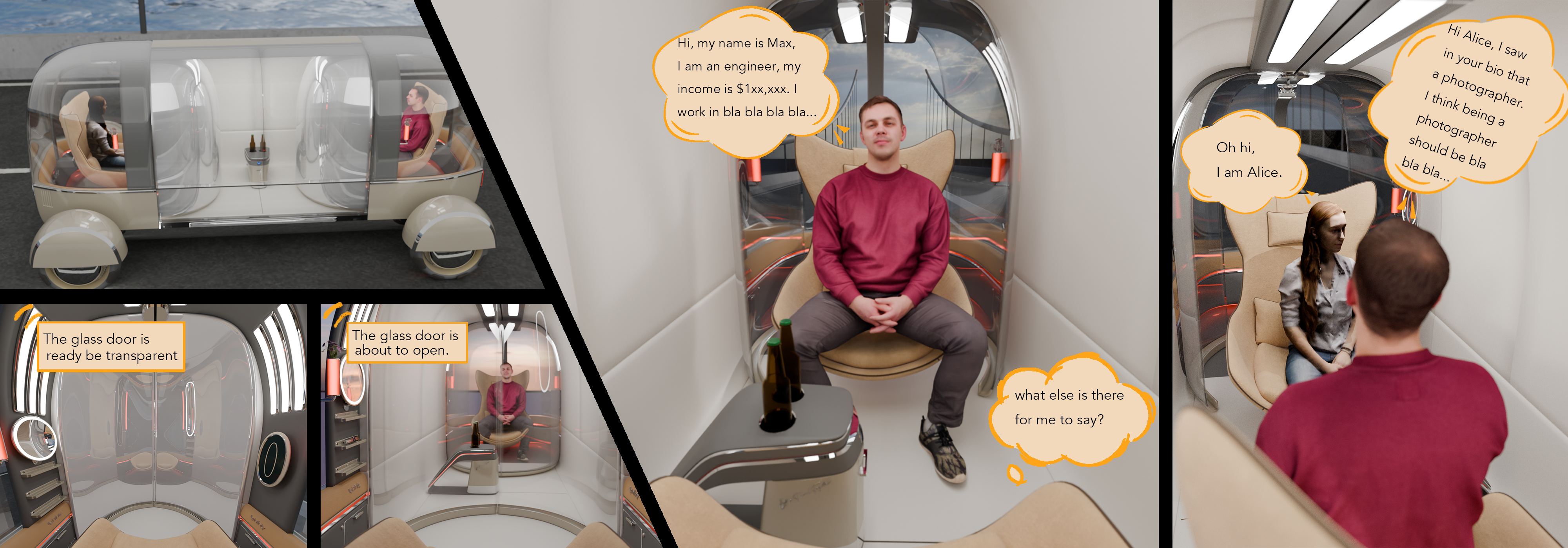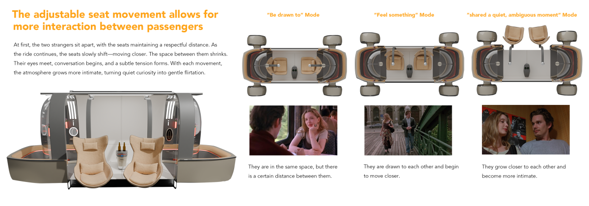 Inspired by the film Before Sunrise, this concept envisions an autonomous vehicle designed specifically for a one-day shared journey between two strangers. Through a thoughtfully arranged itinerary, the service creates opportunities for them to discover each other’s personalities, interests, and stories in a natural, unforced way. They may find that similar interests don’t necessarily lead to mutual attraction; they may simply enjoy the day as companions, become friends, or even develop a romantic connection. All of these outcomes are possible within the unique environment of this one-day travel experience.