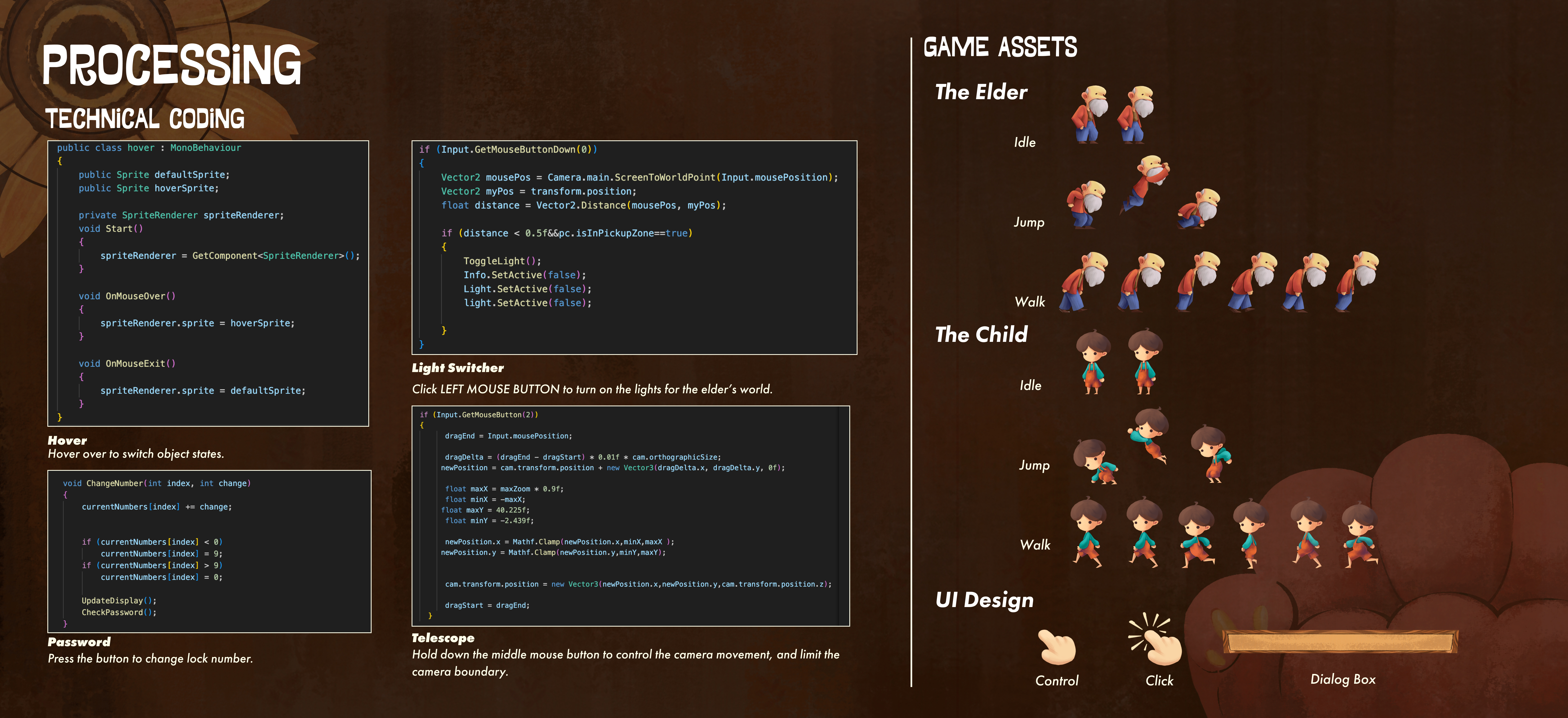Echoes of Wonder is a 2D puzzle-platform game that explores how true aging comes from losing curiosity, not growing older. Players control a curious child whose actions revive the fading world of an elder. Racing against time, they uncover clues to guide each other to the sunflower that symbolizes curiosity. As puzzles are solved, the elder’s world becomes vibrant again, showing that curiosity is the key to staying youthful.