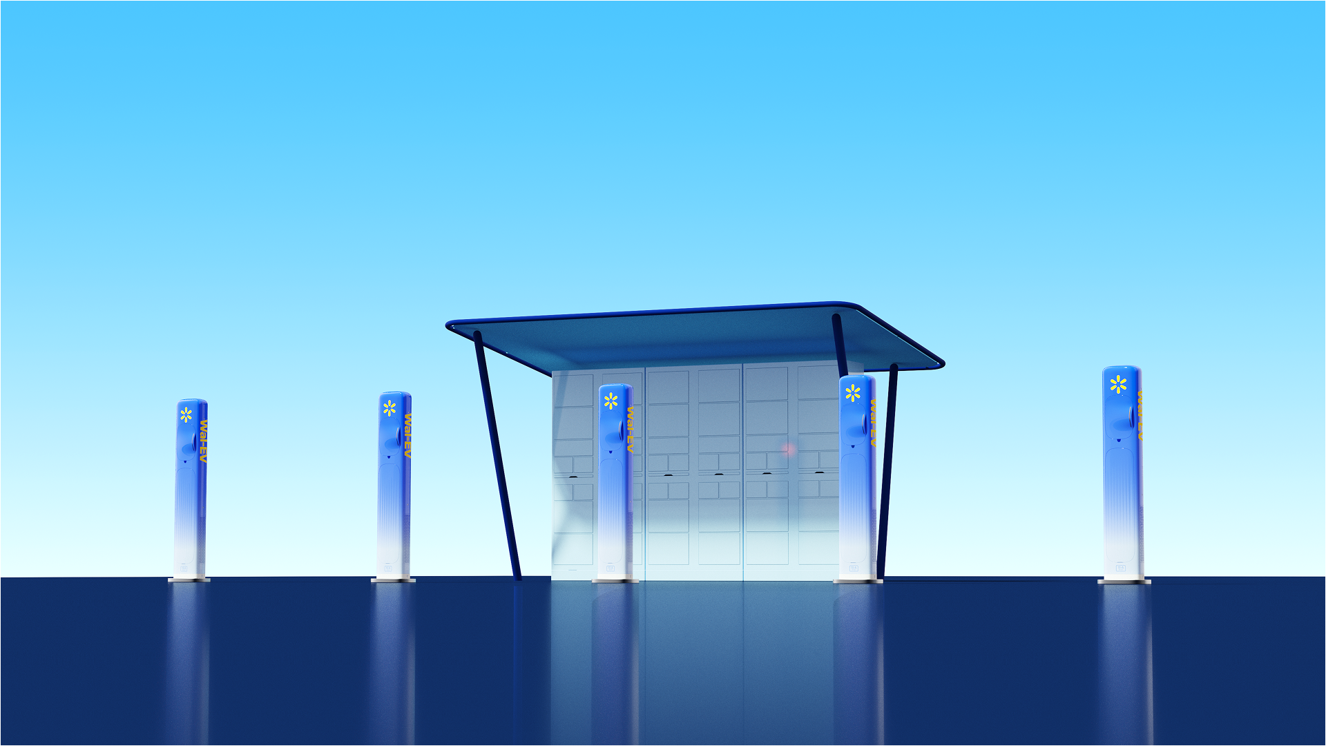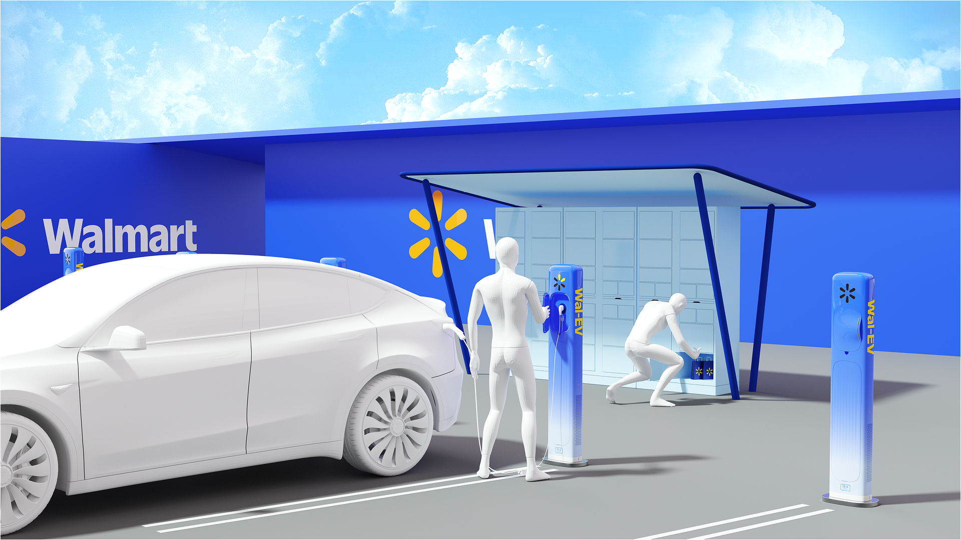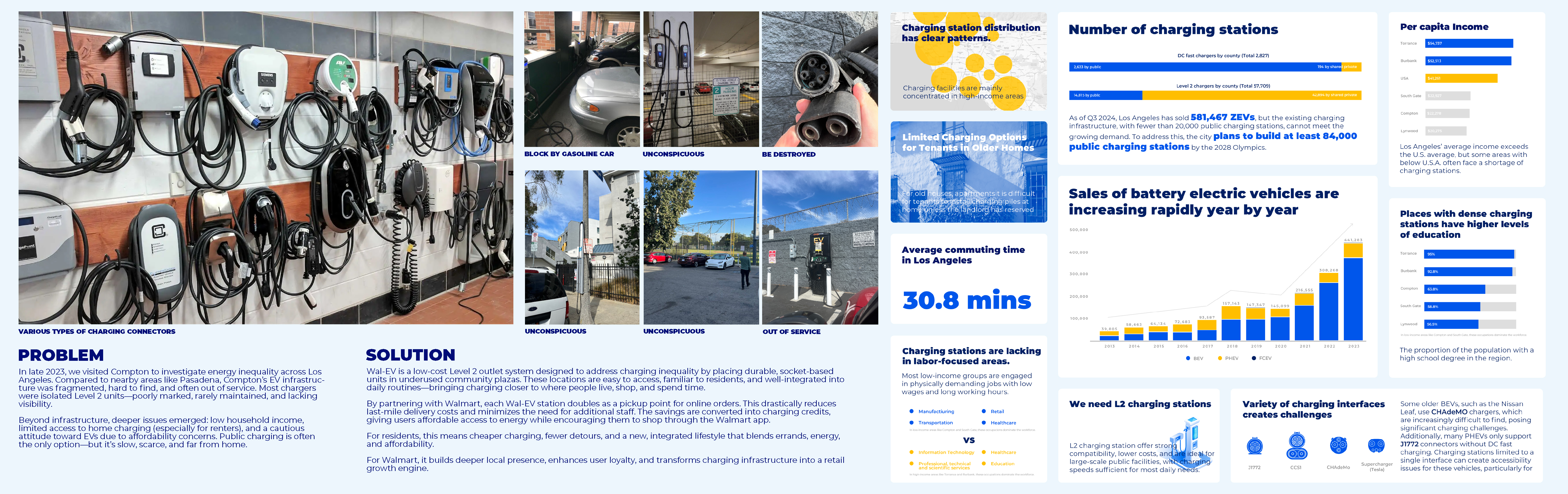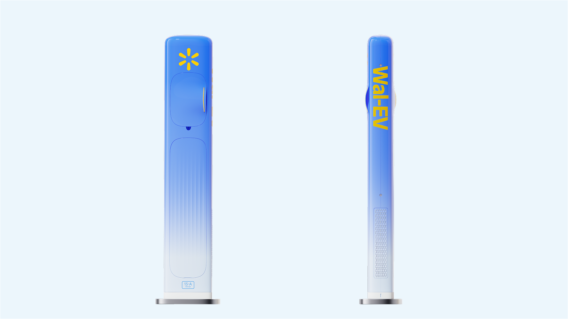 Wal-EV is a community-focused EV charging system designed for underserved neighborhoods, using low-cost Level 2 outlets deployed by Walmart to reduce infrastructure costs, reward shoppers, and integrate clean energy access into everyday retail experiences.