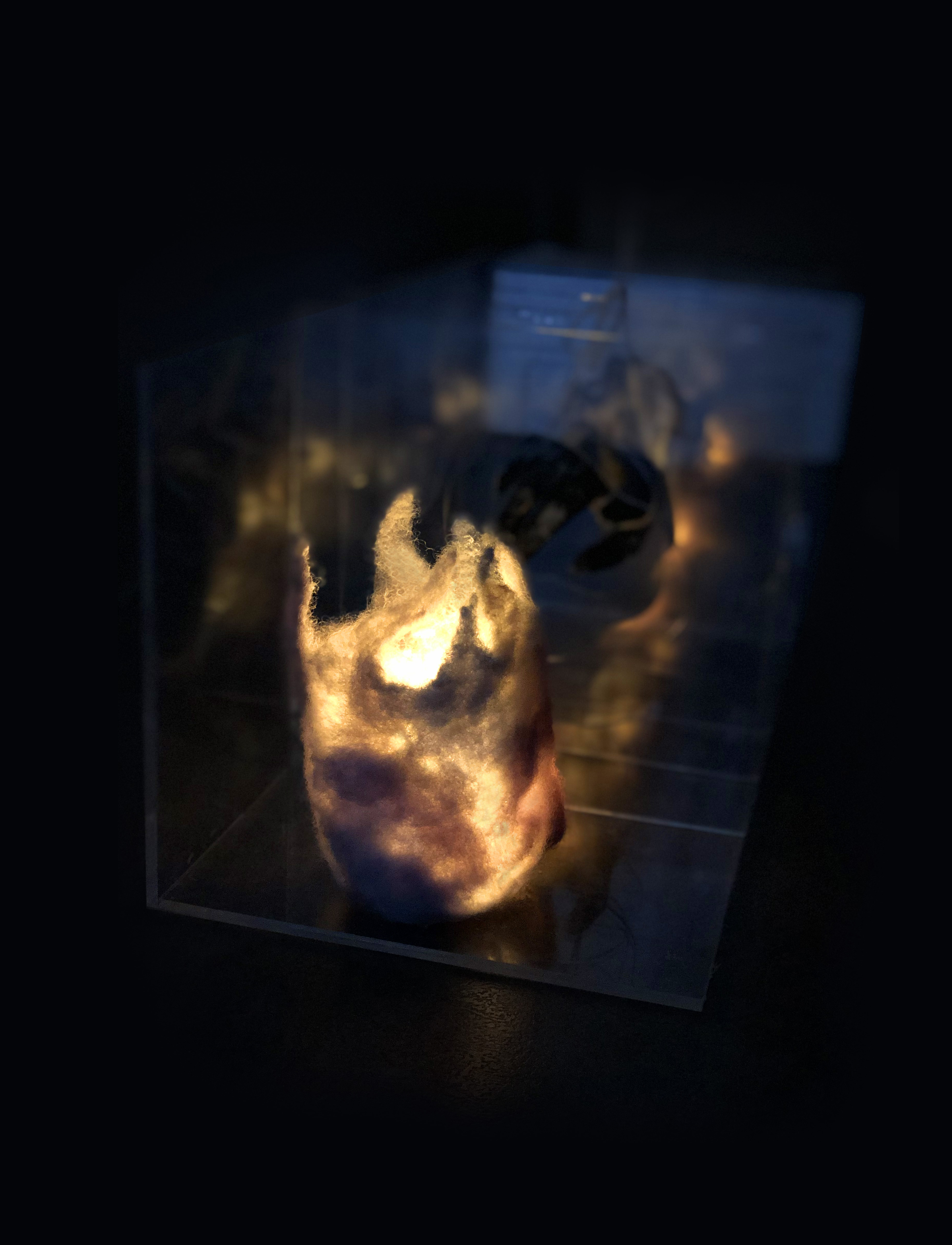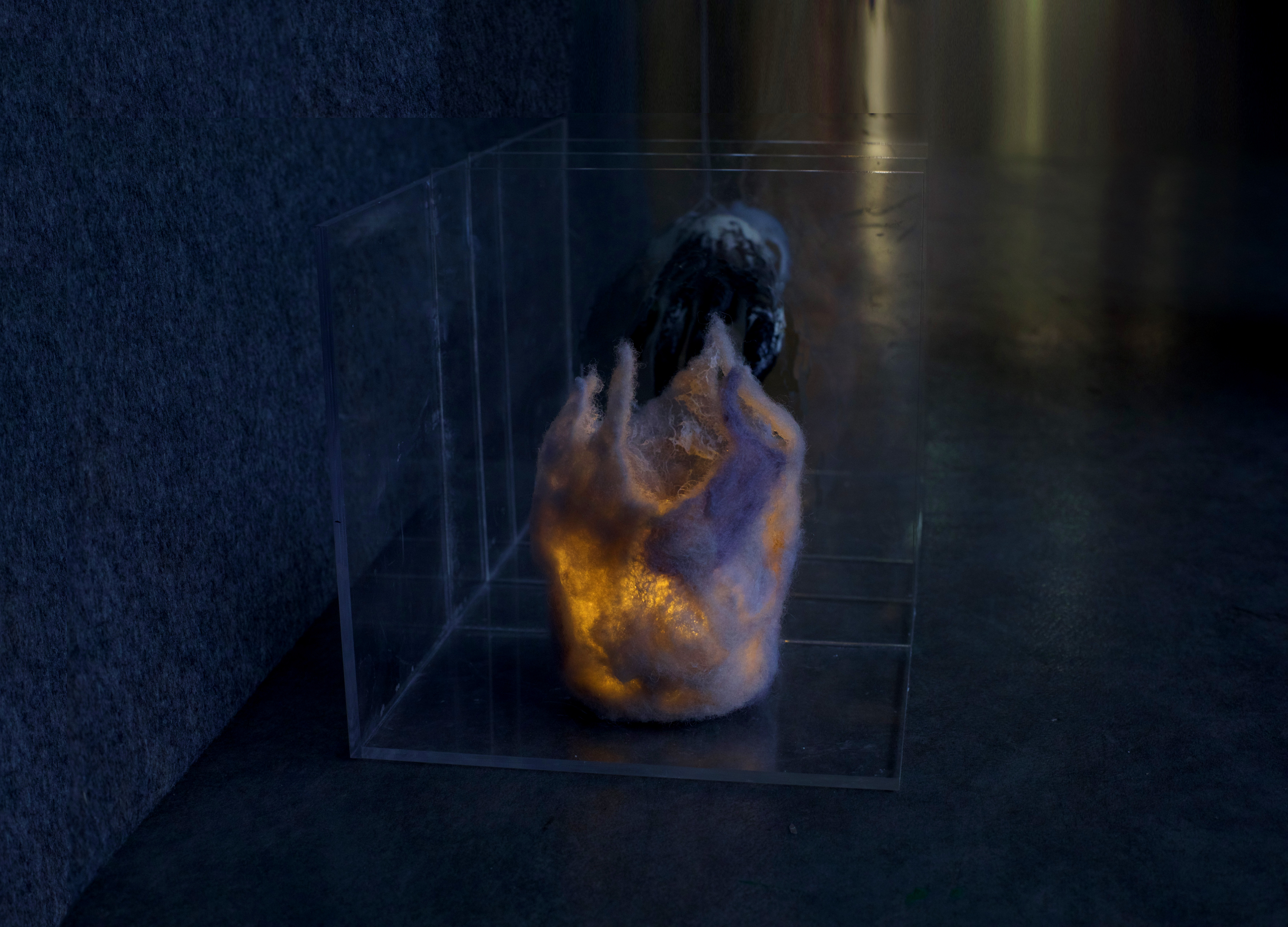 Everyone is eager to establish a close relationship with others. But they don’t realize that a close relationship also brings harm to both sides of the relationship. Intimacy is like fire. When you are close to it, it makes you feel warm. If you get too close, it will burn you. A warm yellow lamp is installed in the felt that simulates the shape of fire, symbolizing intimacy. Black paint sprayed on a waxy hand is a sign of injury in an overly intimate relationship.