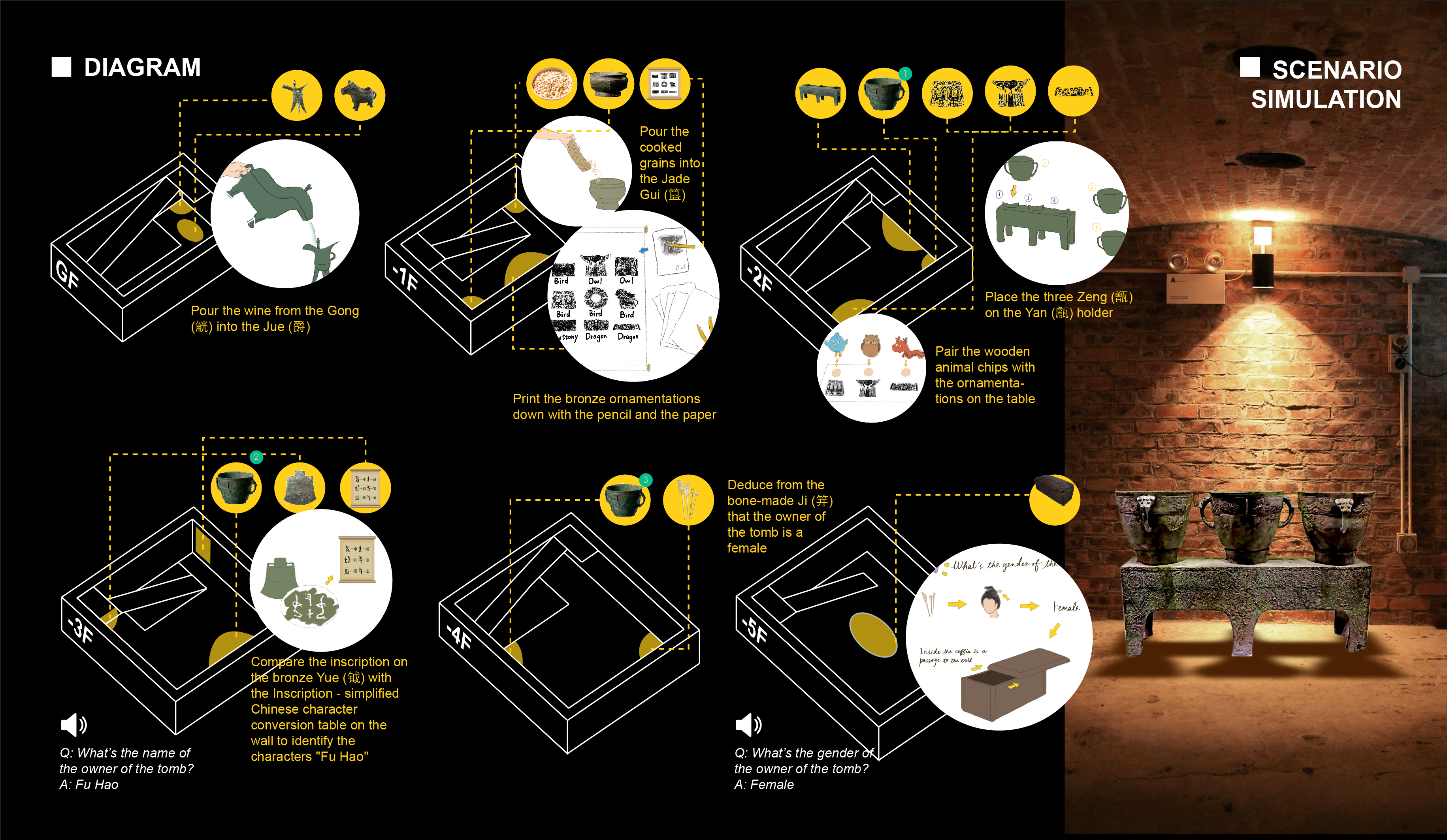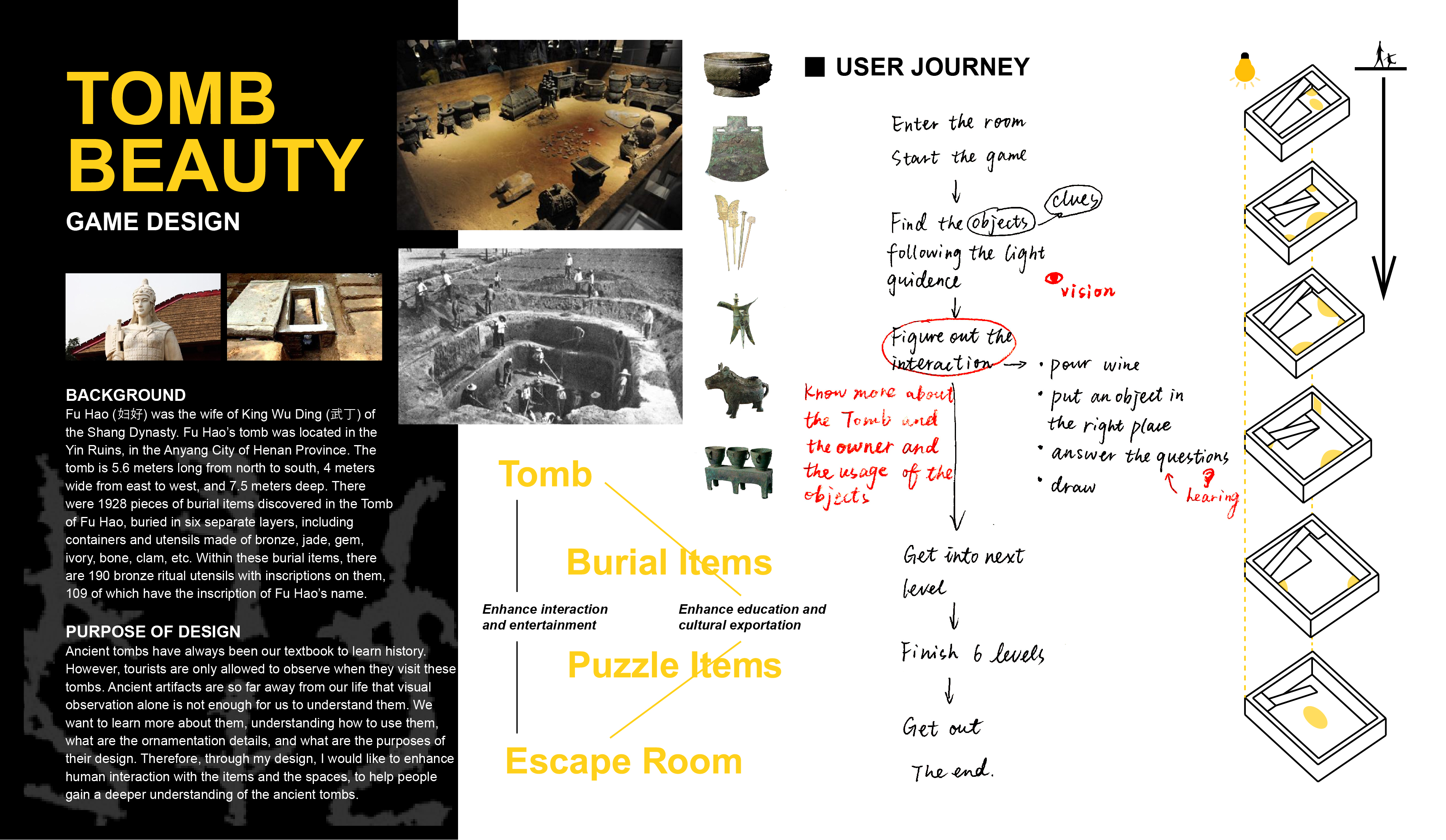 Ancient tombs have always been great resource to learn history. However, ancient artifacts are so far away from our life that visual observation alone is not enough to understand them. We want to learn more about them, understanding how to use them, what are the ornamentation details, and what are the purposes of their design. Therefore, through my design, I would like to enhance human interaction with the items and the space to help people gain a deeper understanding of the ancient tombs.