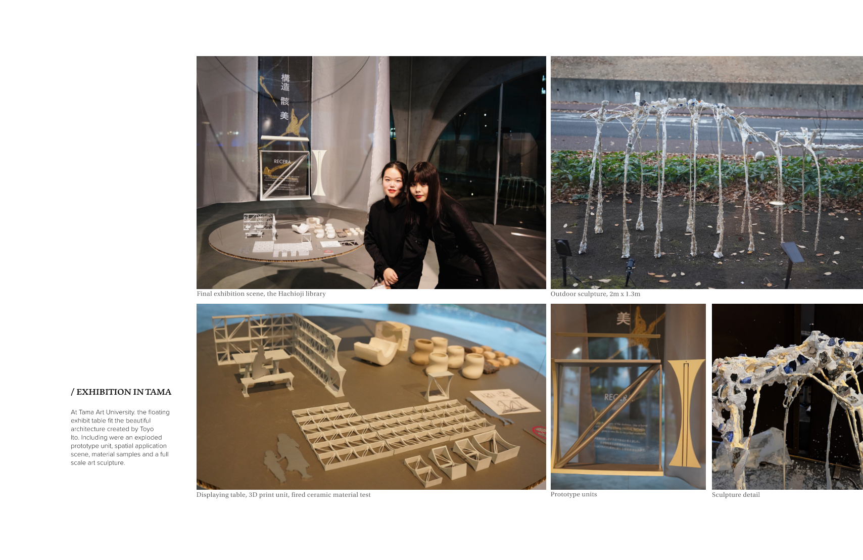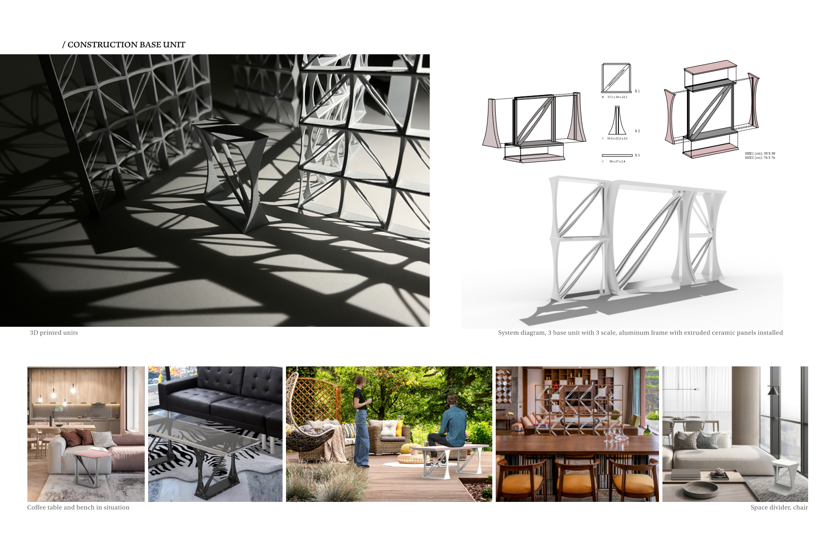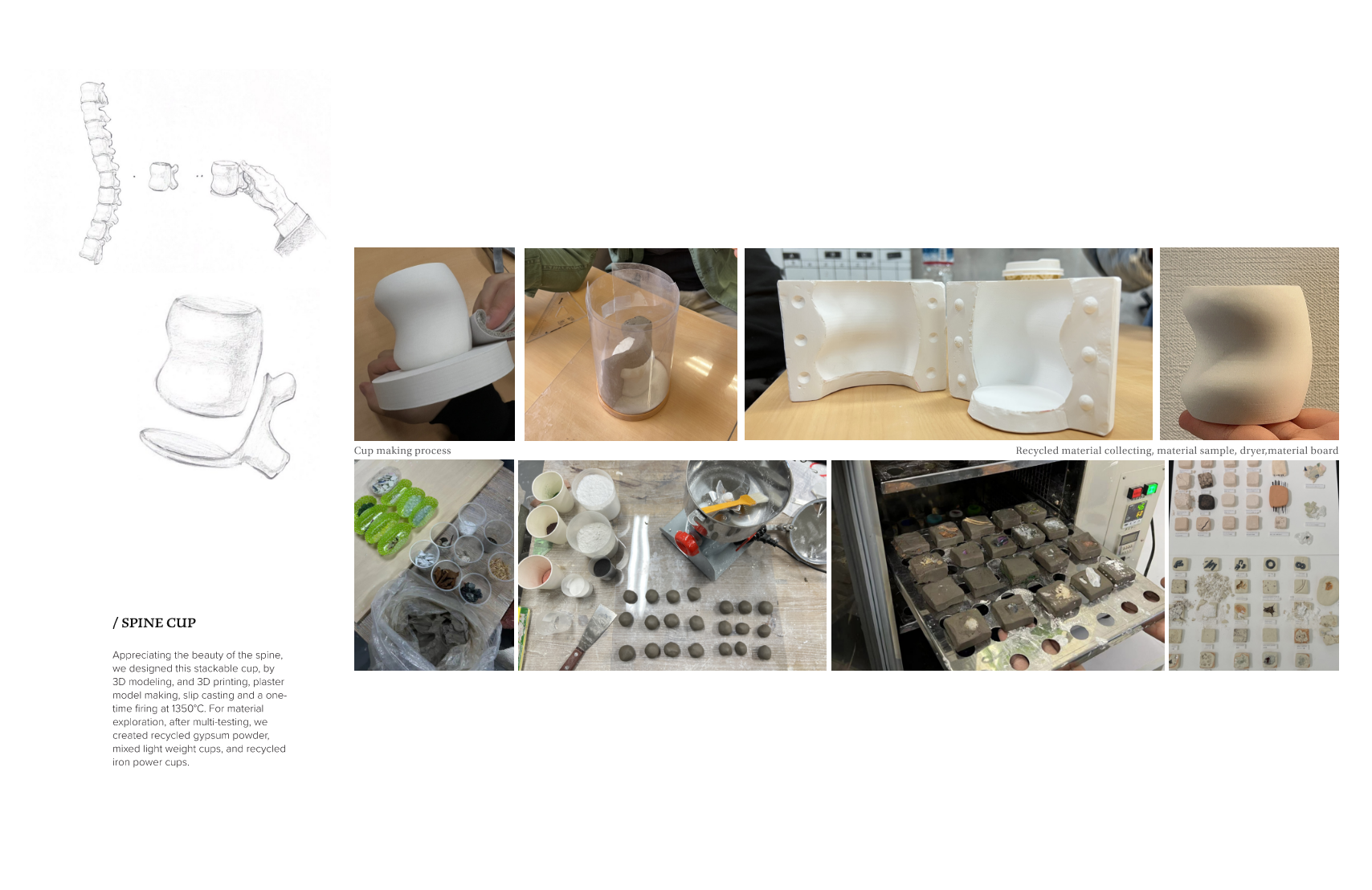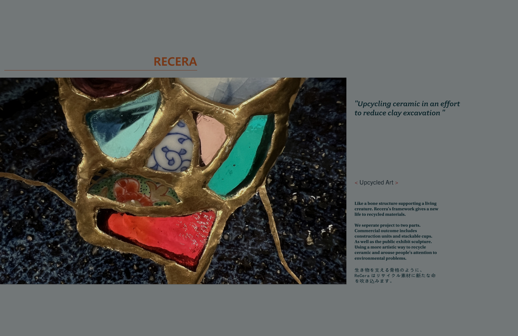 Like a bone structure supporting a living creature. Recera's framework gives a new life to recycled materials. We seperate project to two parts. Commercial outcome includes construction units and stackable cups. As well as the public exhibit sculpture. Using a more artistic way to recycle ceramic and arouse people's attention to environmental problems.