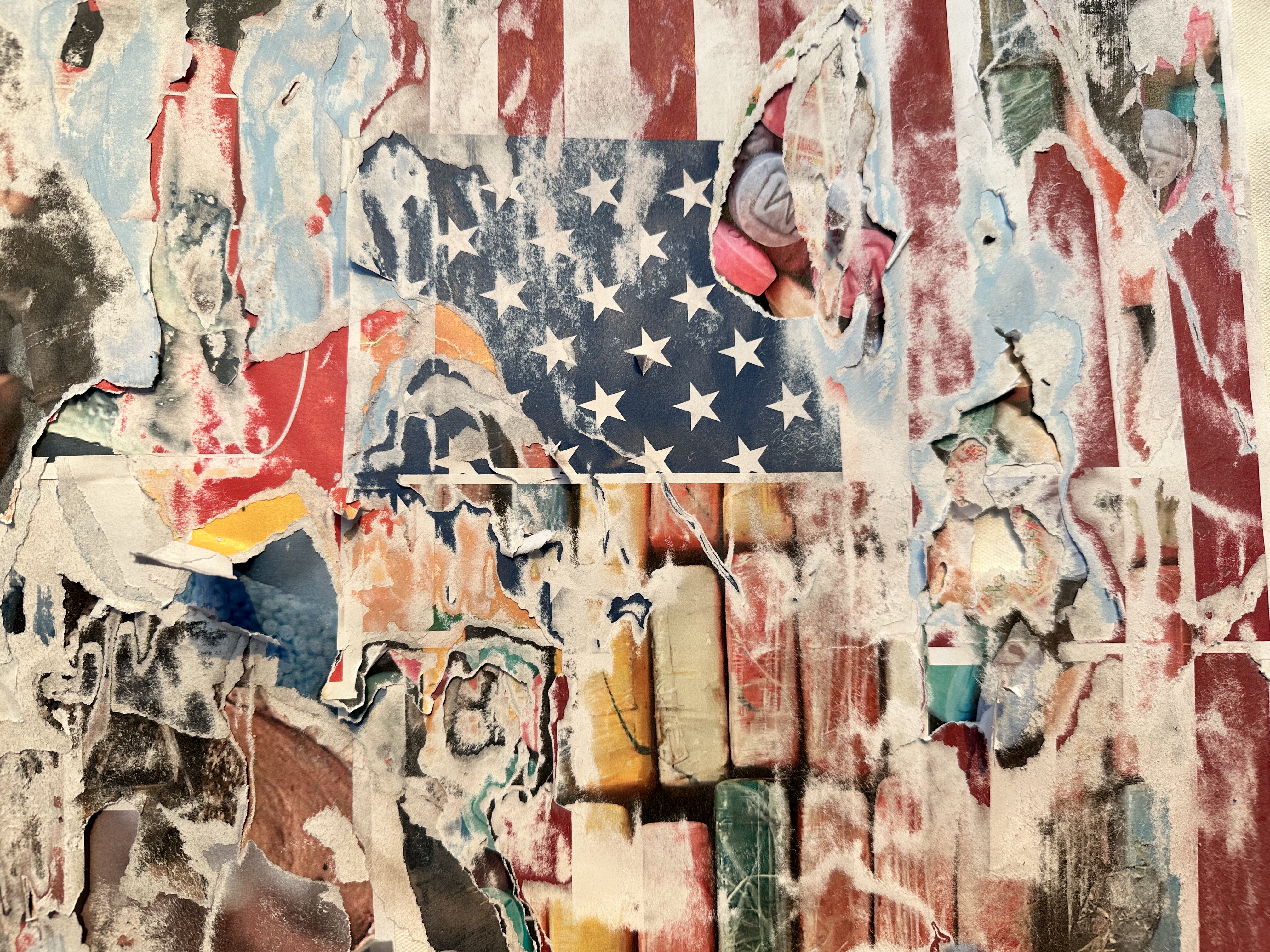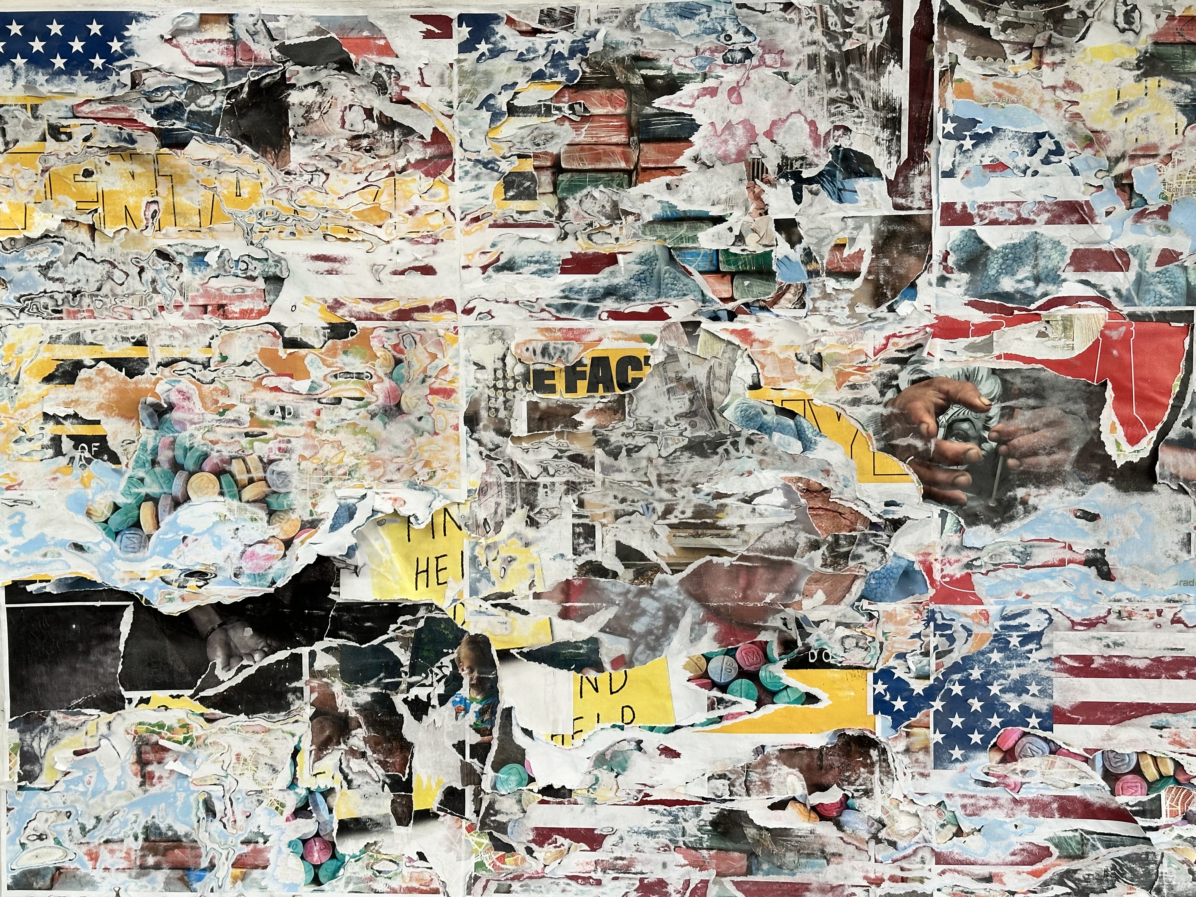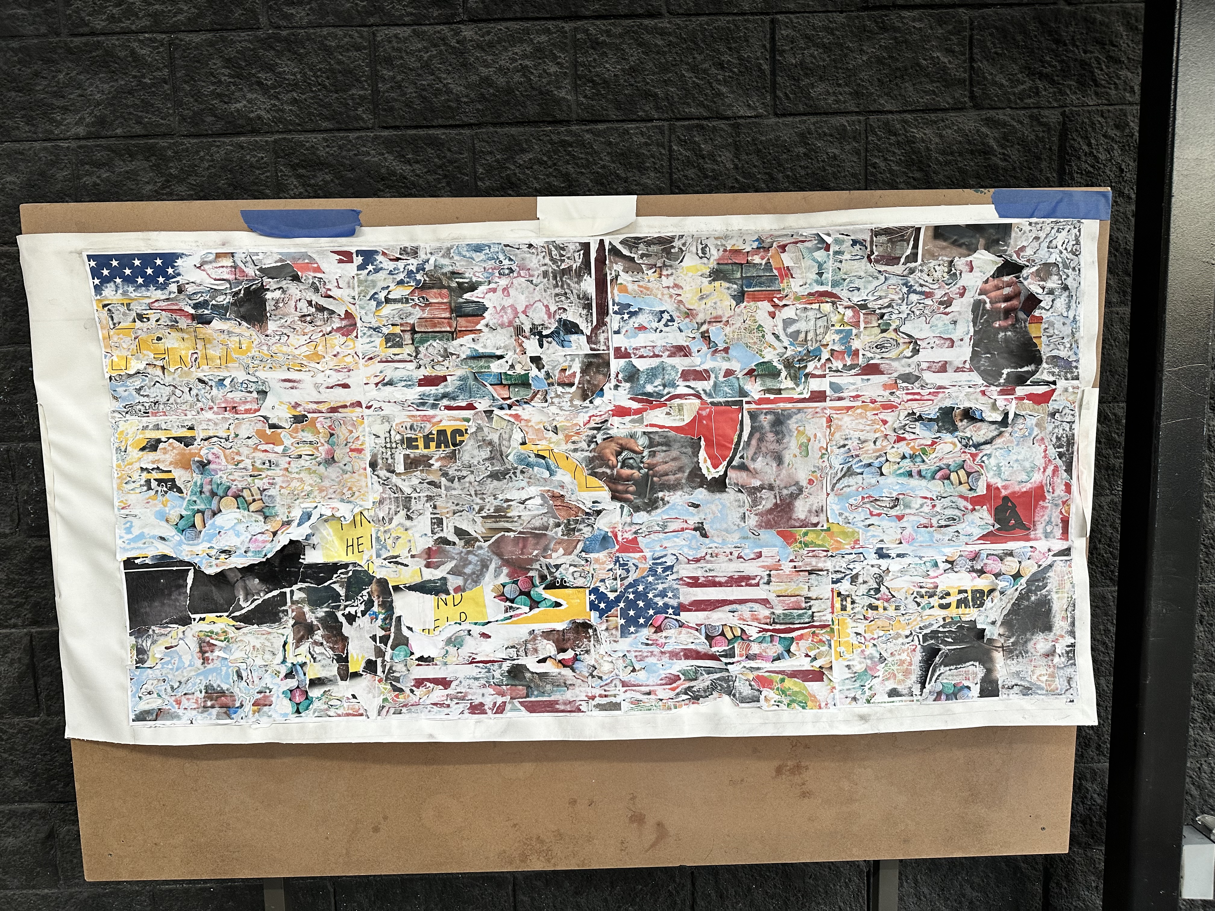 This is a similar collage process used in the first slide. It was my last project for collage 1. The goal was to talk about the fentanyl and drug crisis in america currently. The prompt was to talk about things that kept us up at night, and as a recovering drug addict this is what sits at the forefront of my consciousness. Using a similar process of sanders.