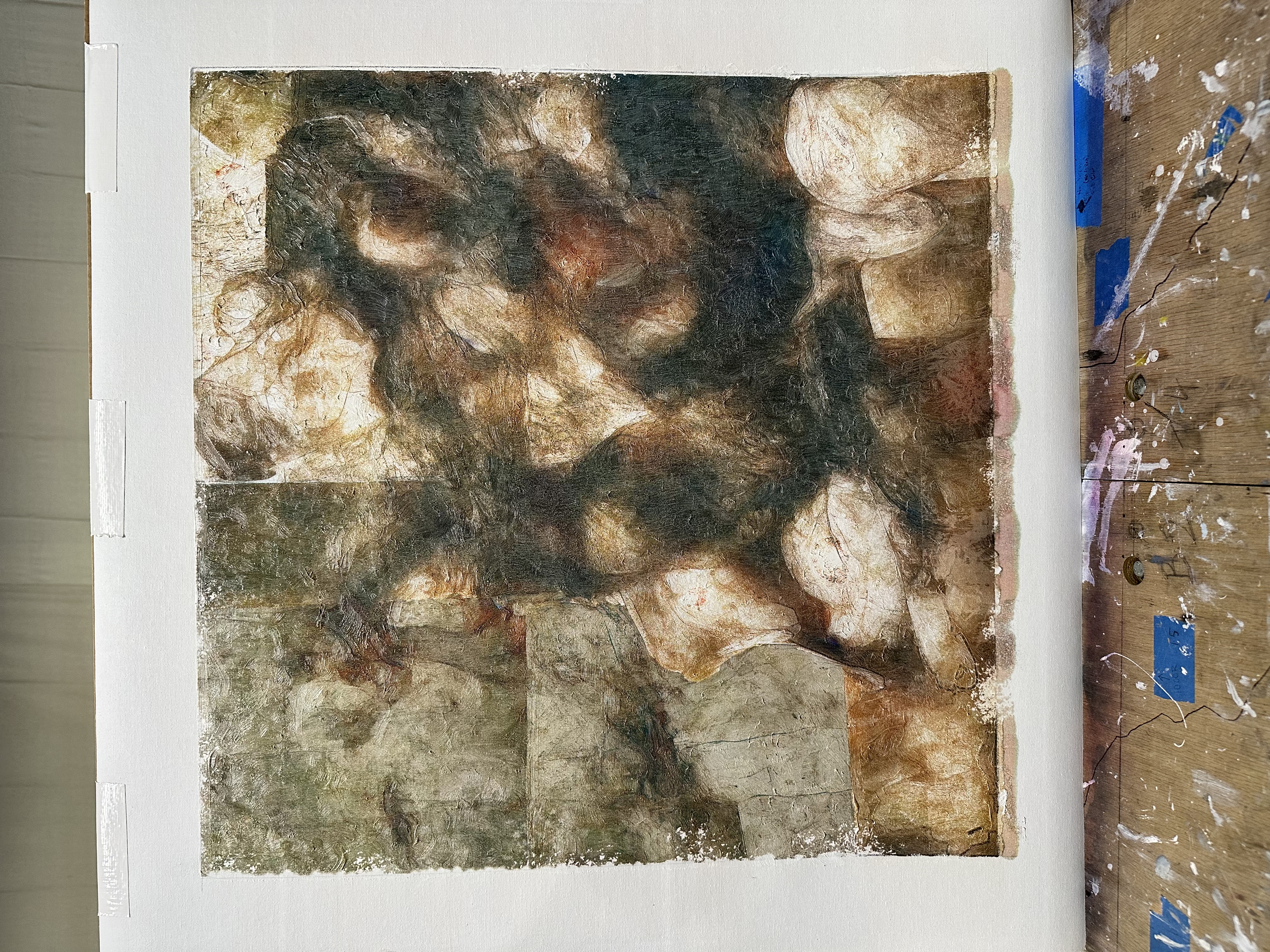 My personal work I’ve been working on the for the last year and a half. Using machine learning and hackable industrial printing techniques we have found a way to paint with machines. The printers are able to print in oil based inks that have oil pigment in them. This is one of our first samples and tests of what it’s going to be a 6ft by 6ft painting.