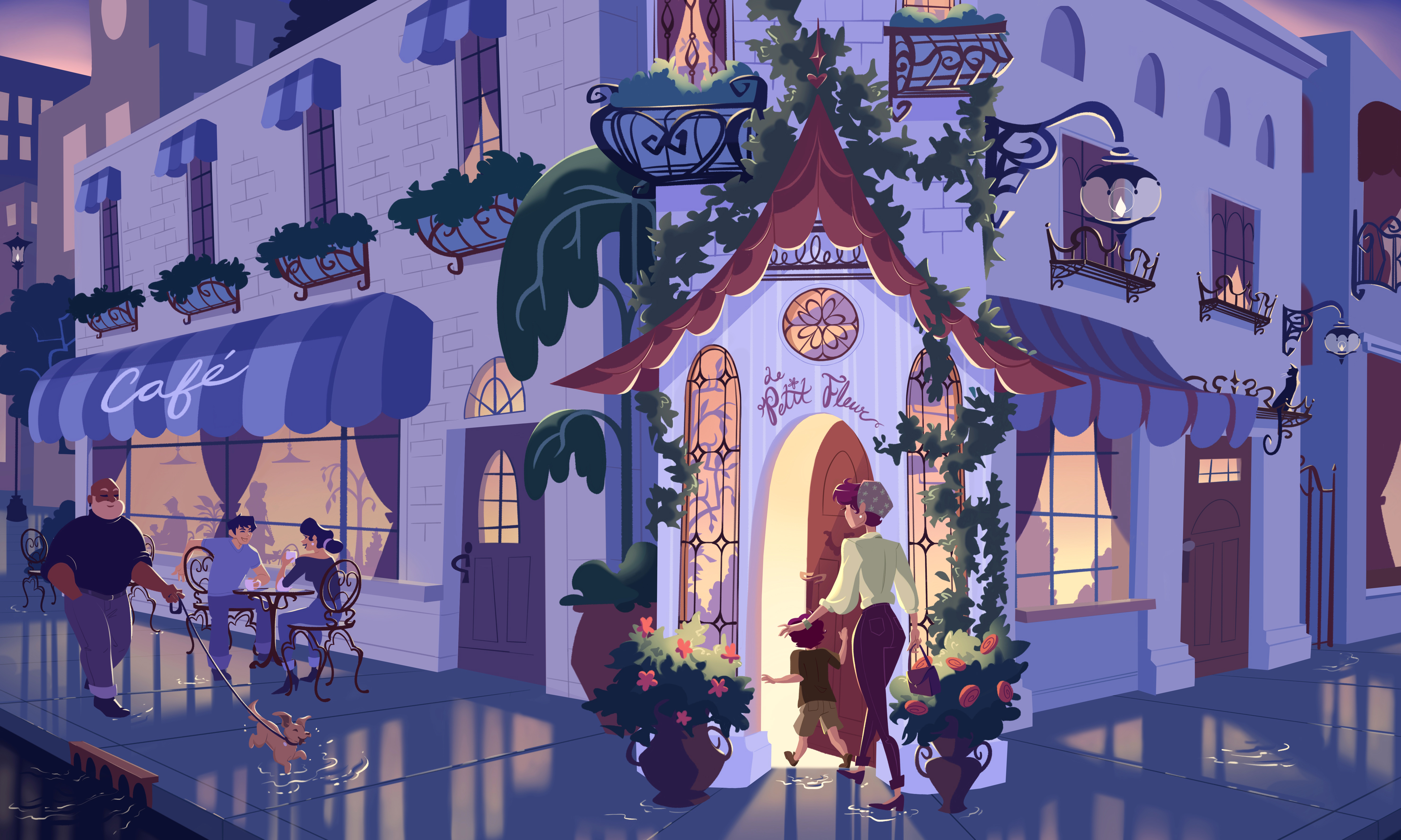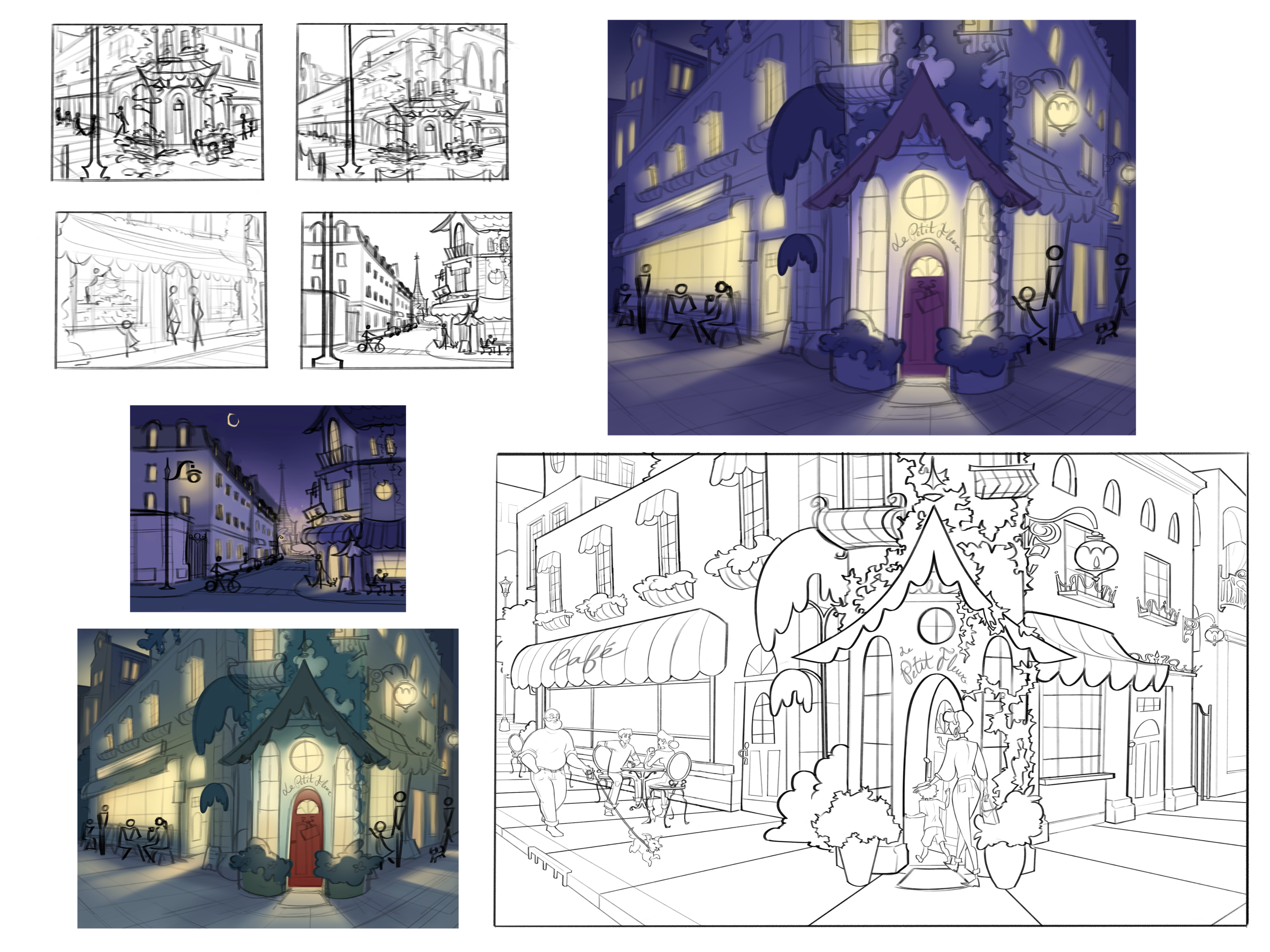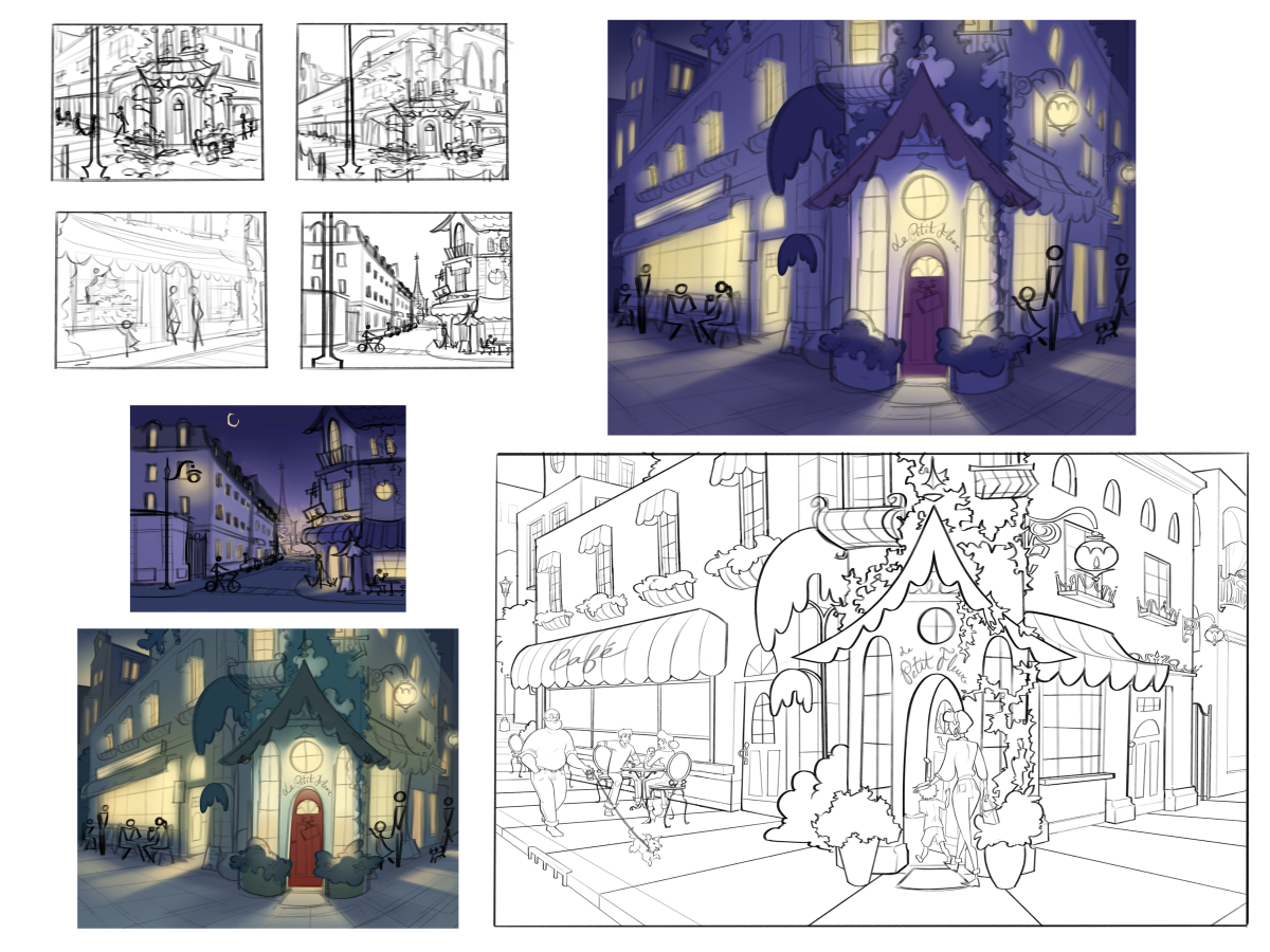 The second project was based in the style of both Pascal Campion and Cartoon Network's Foster's Home for Imaginary Friends. With this combination of styles, we were tasked to paint a post-rain evening street scene in Paris, with the focal point placed on a specific storefront, and including at least three characters.