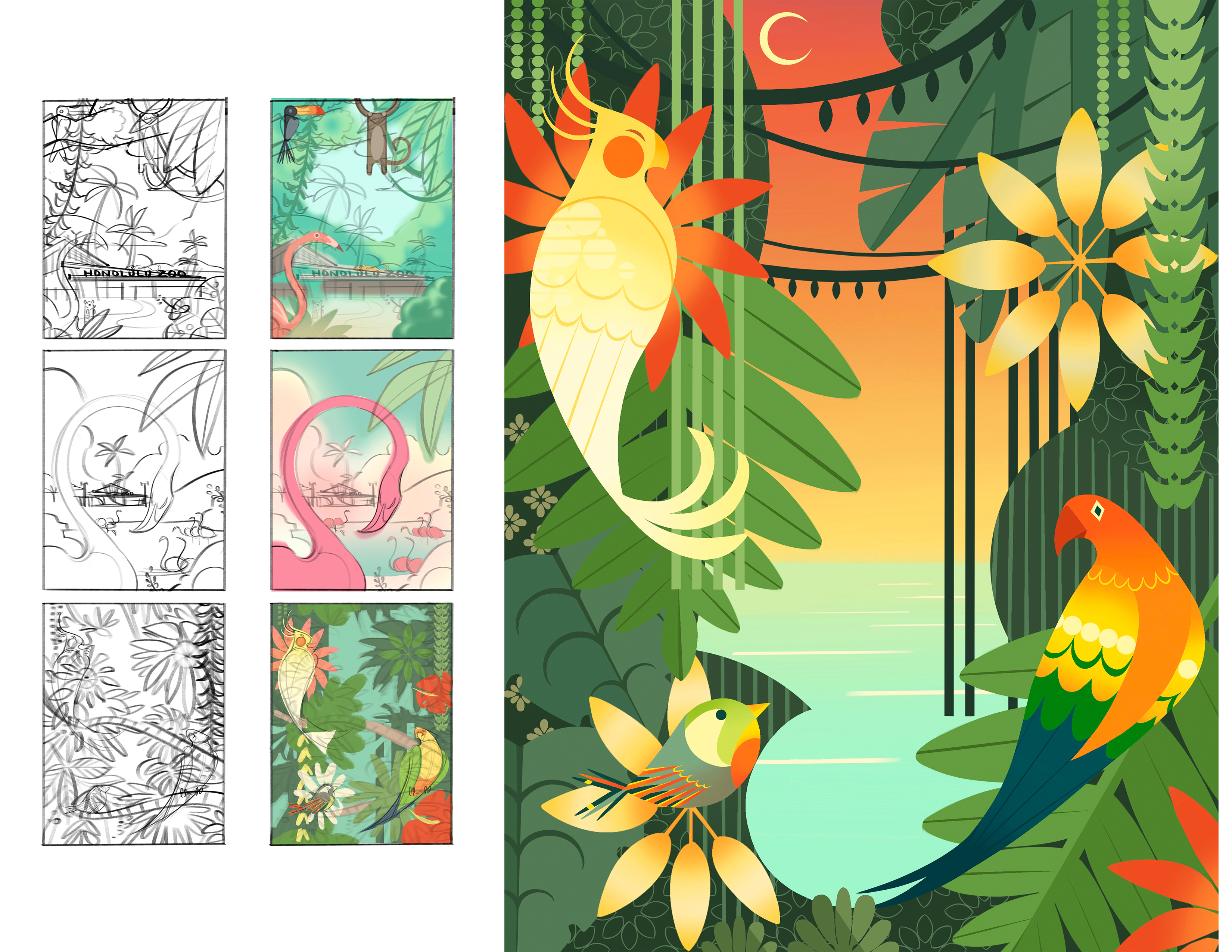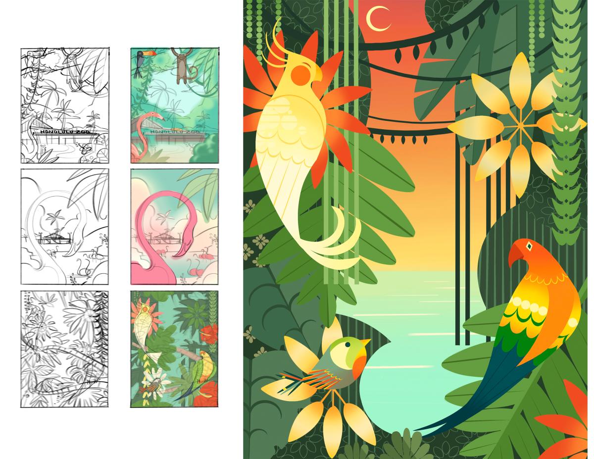 The first project was focused on creating a travel poster for the Honolulu Zoo in the graphic style of Charley Harper.