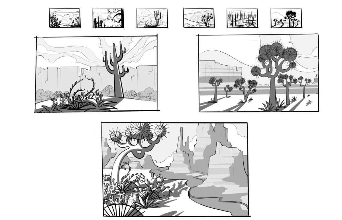 The outline for the third illustration was to create an afternoon desert scene in the style of Eyvind Earle, with the focal point being on a group of desert plants.