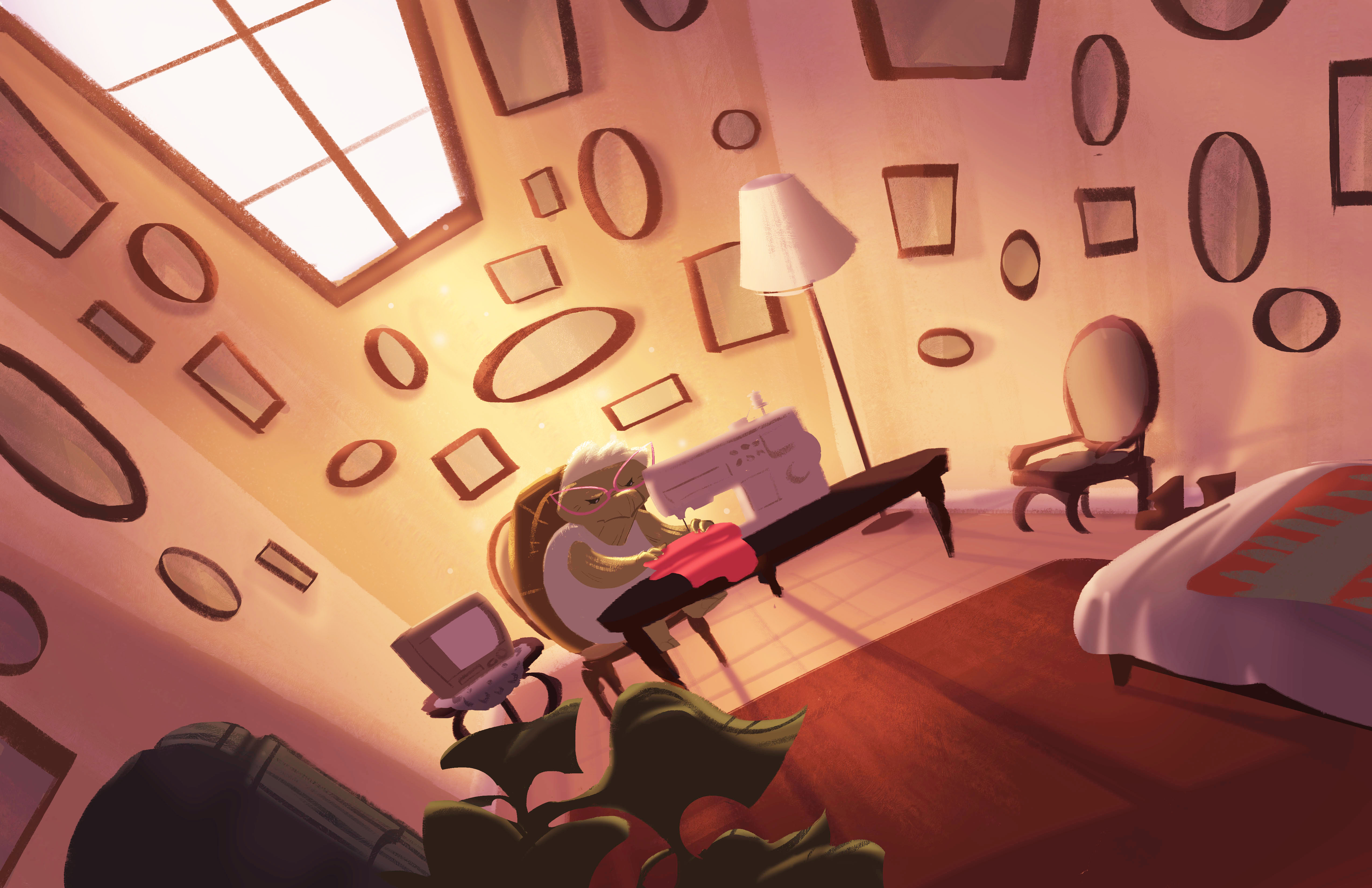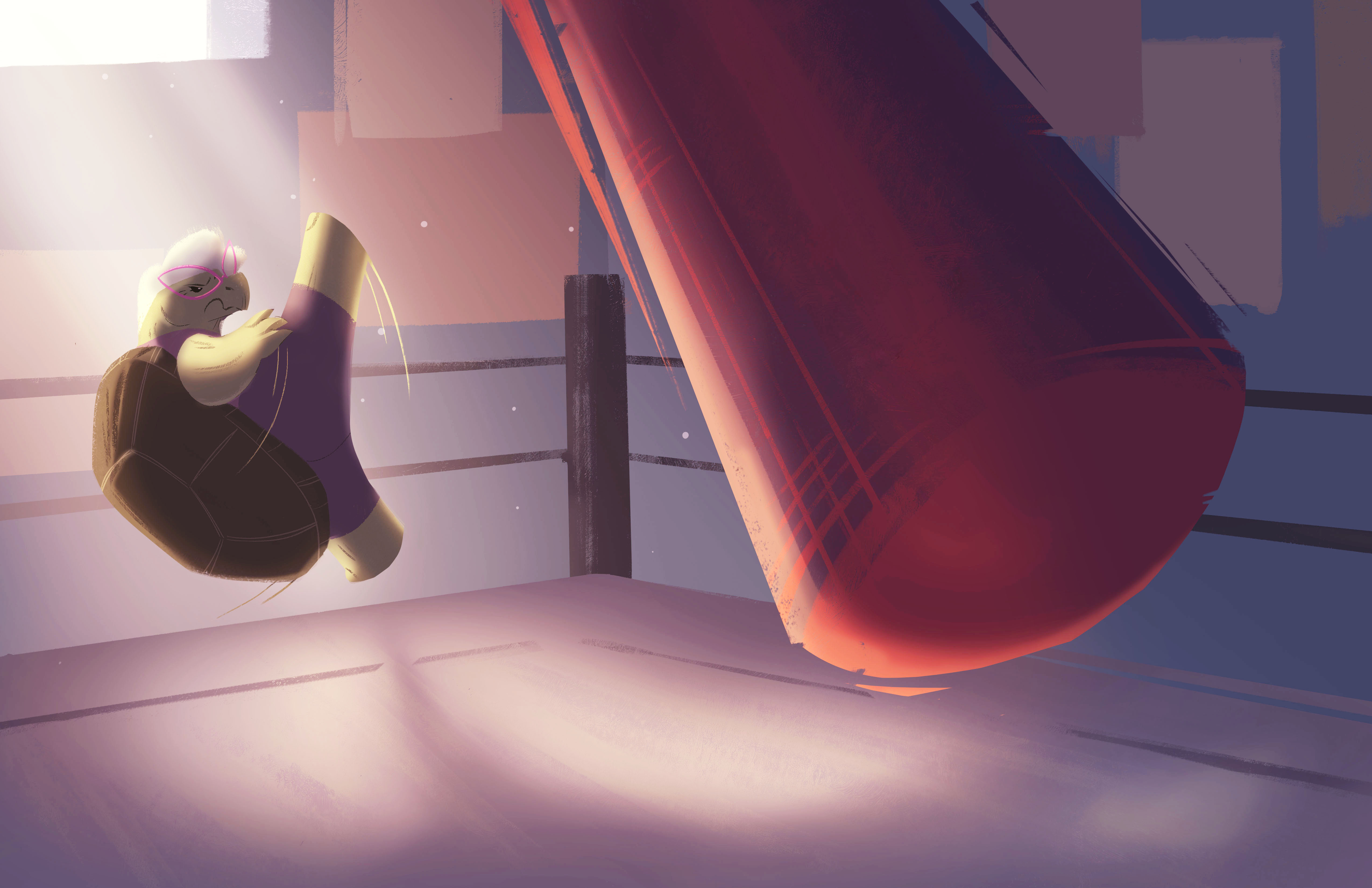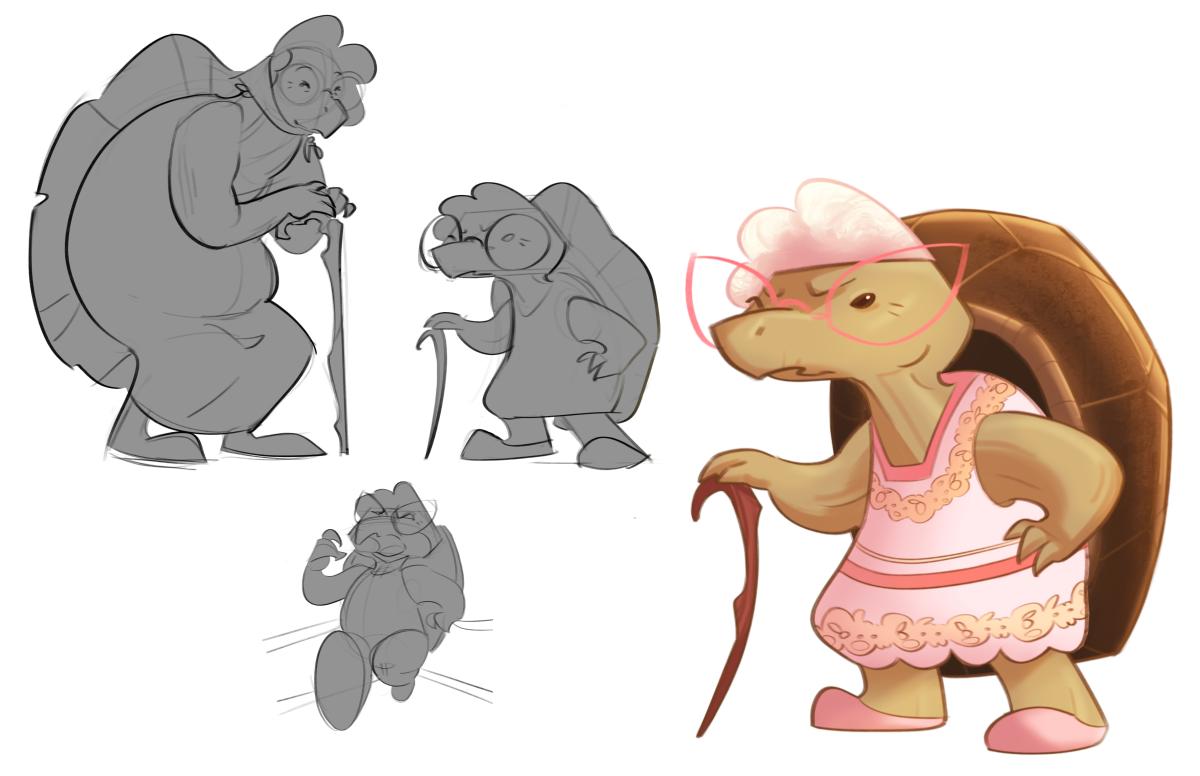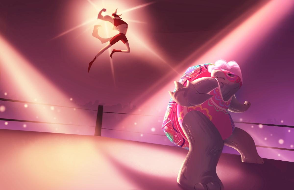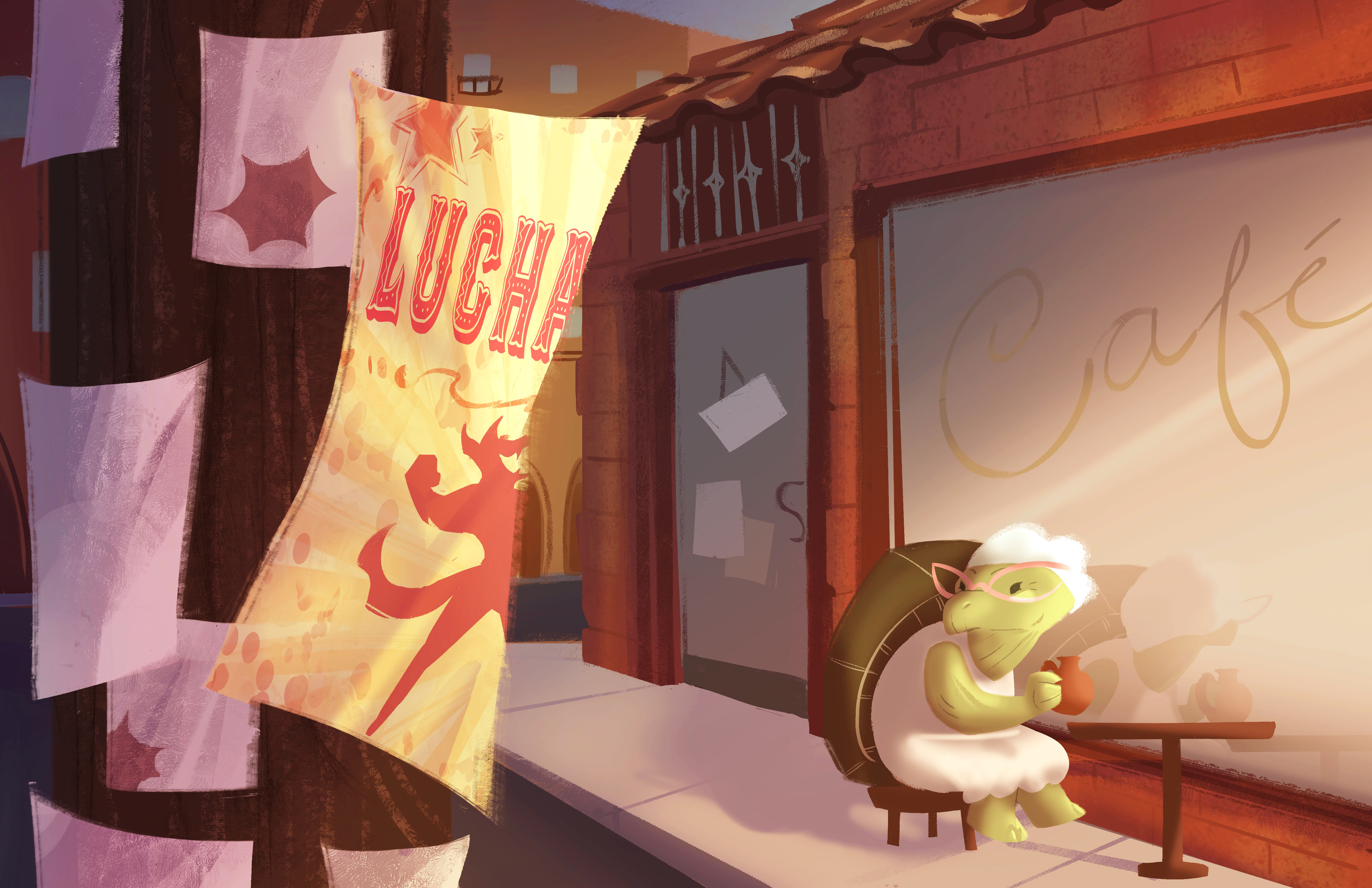 The outline given was to create a full visual development project based on five story beat paintings of an original IP, which could then be pitched after the course of five weeks. I chose to create a story surrounding a small, elderly turtle and her journey to become the luchadora she always dreamt of being.