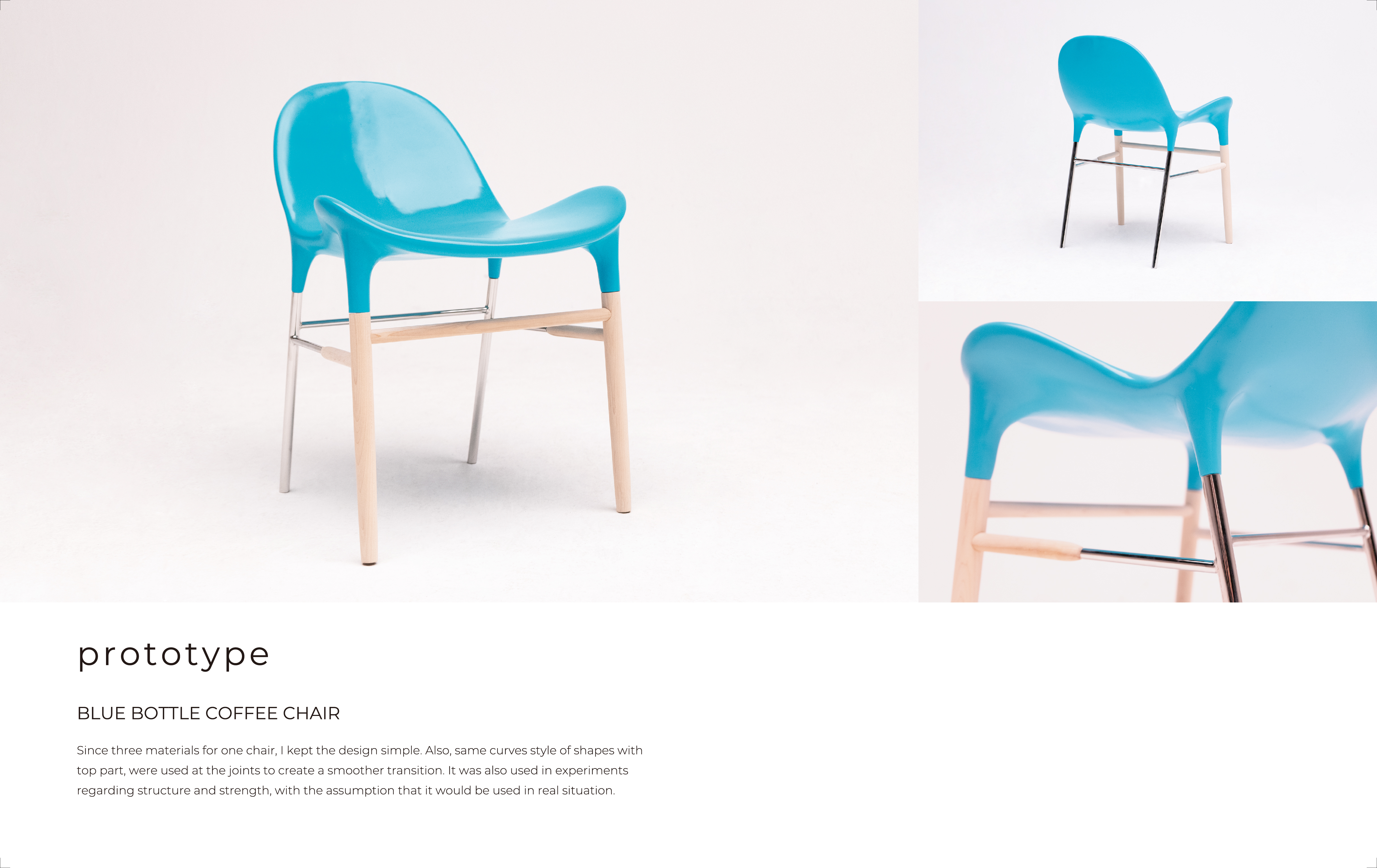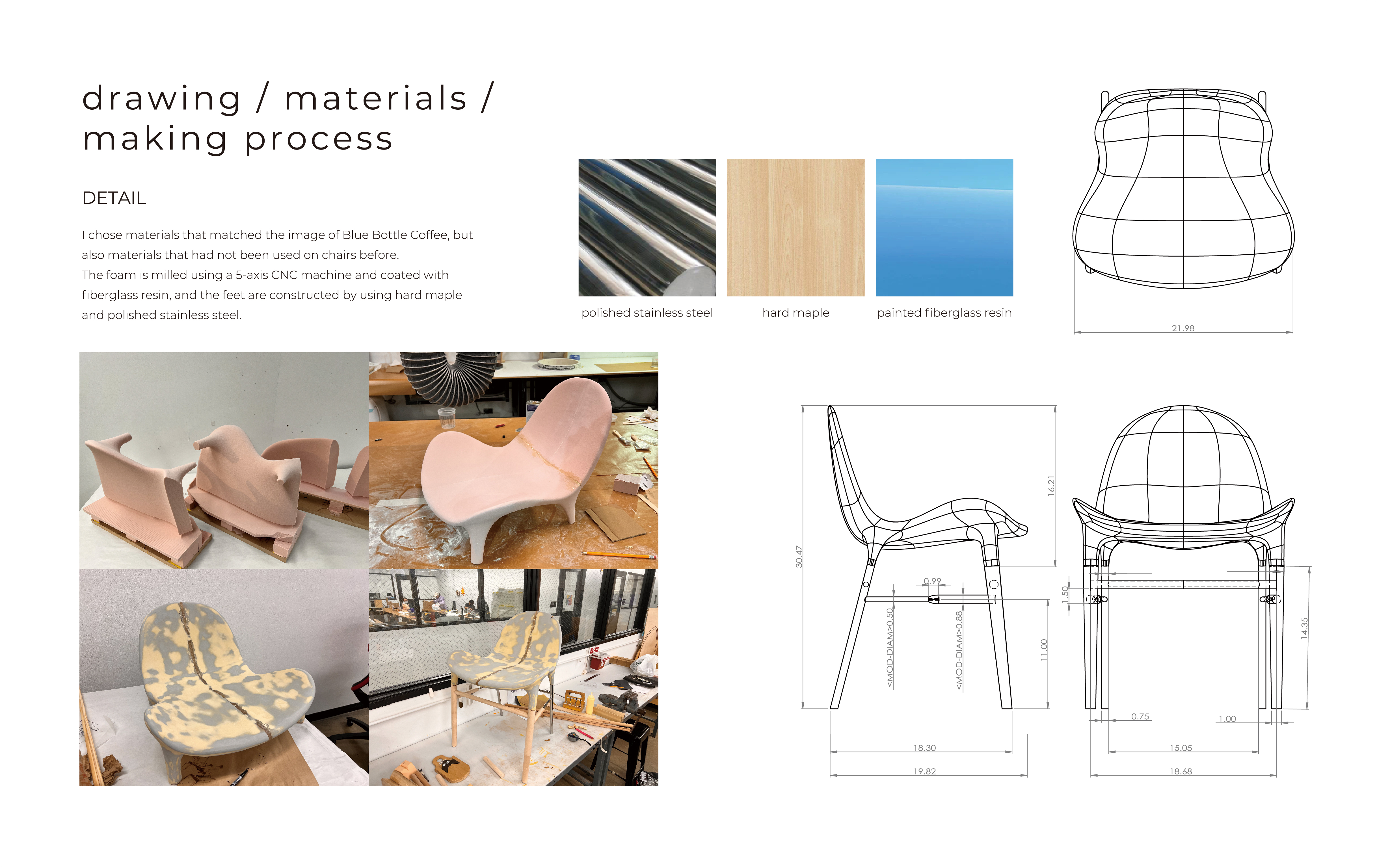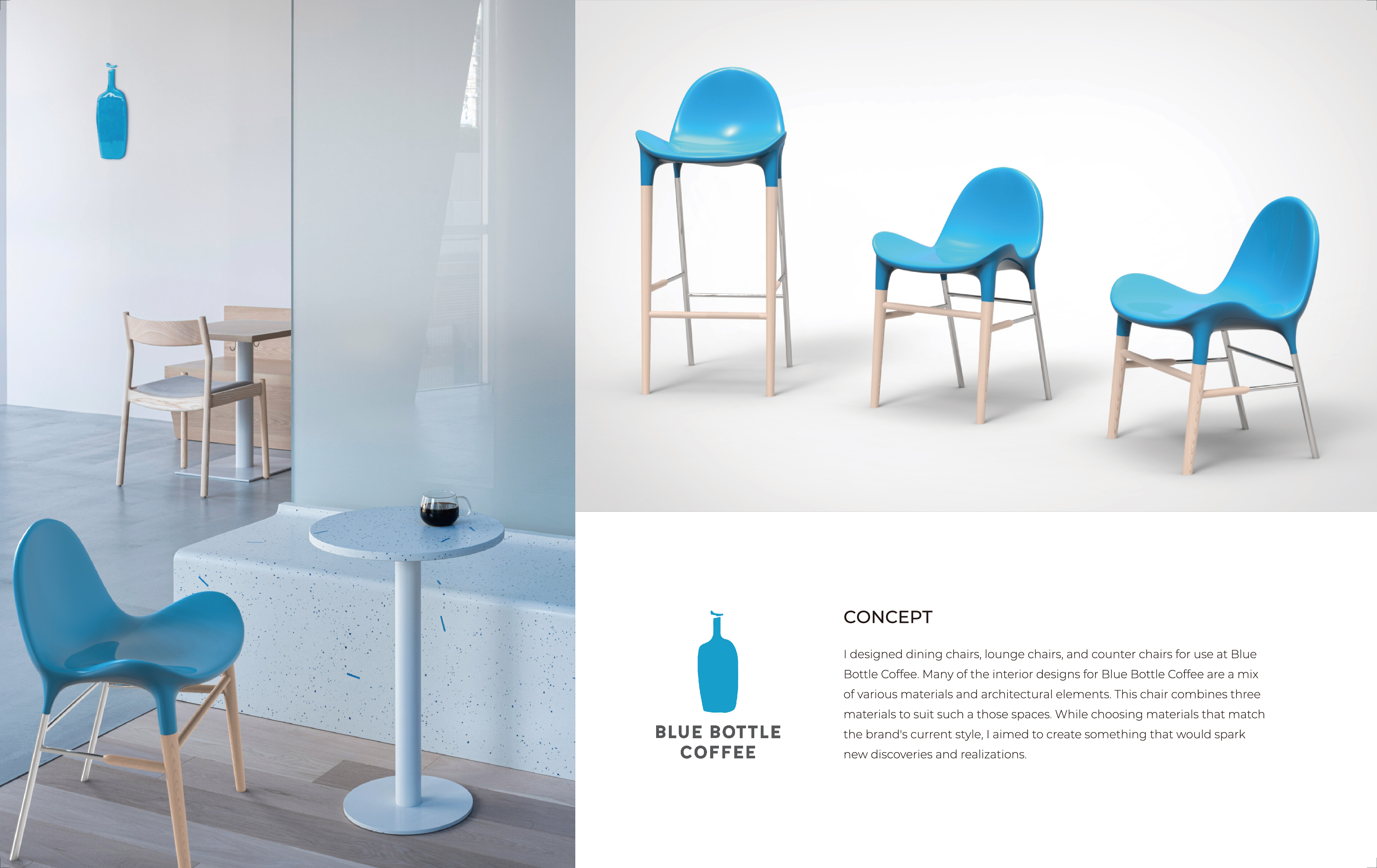 I designed dining chairs, lounge chairs, and counter chairs for use at Blue Bottle Coffee. Many of the interior designs for Blue Bottle Coffee are a mix of various materials and architectural elements. This chair combines three materials to suit such a those spaces. While choosing materials that match the brand's current style, I aimed to create something that would spark new discoveries and realizations.