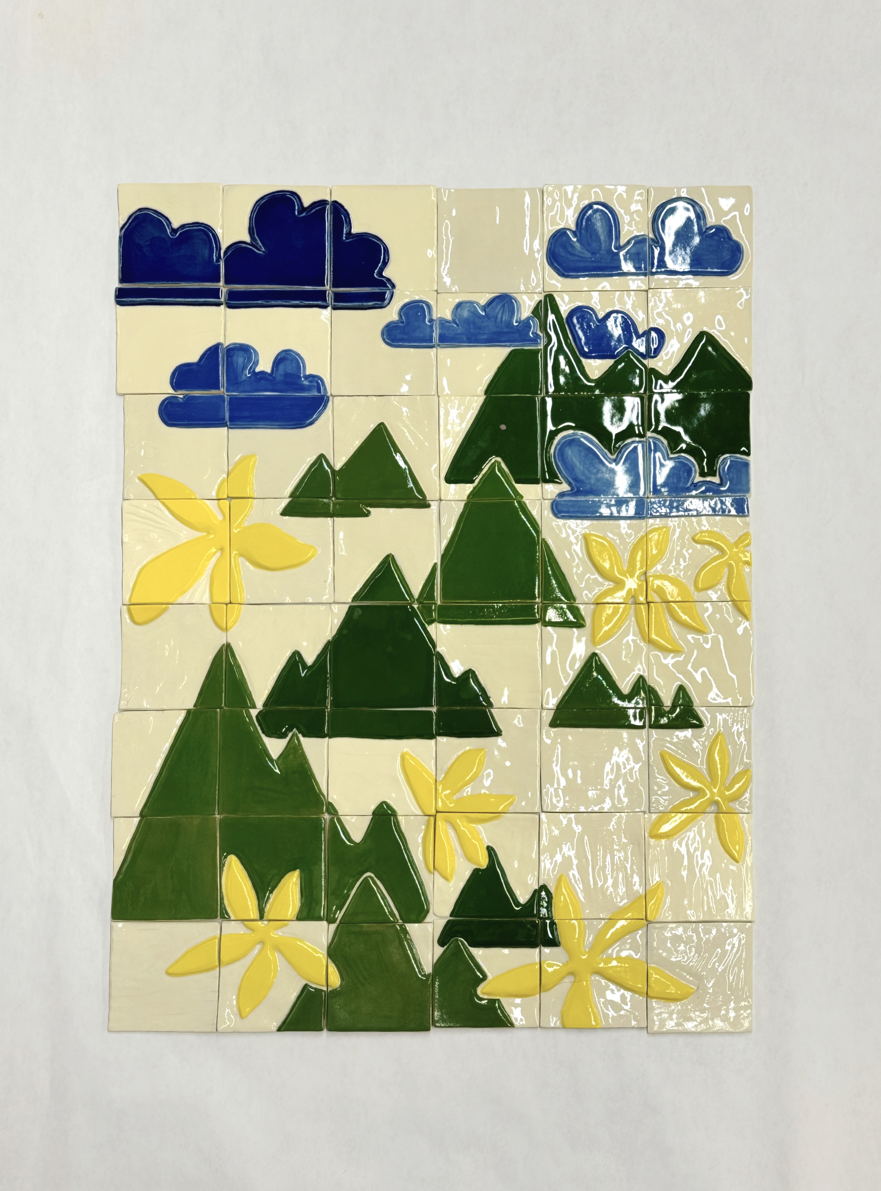 A set of 48 handmade 4x4 ceramic mosaic tiles inspired by my childhood memories of hiking on the seoraksan mountain in Korea. This project seeks to capture the scenic landscapes we passed, with bright yellow gaenari flowers symbolizing the joy and happiness of my early years.