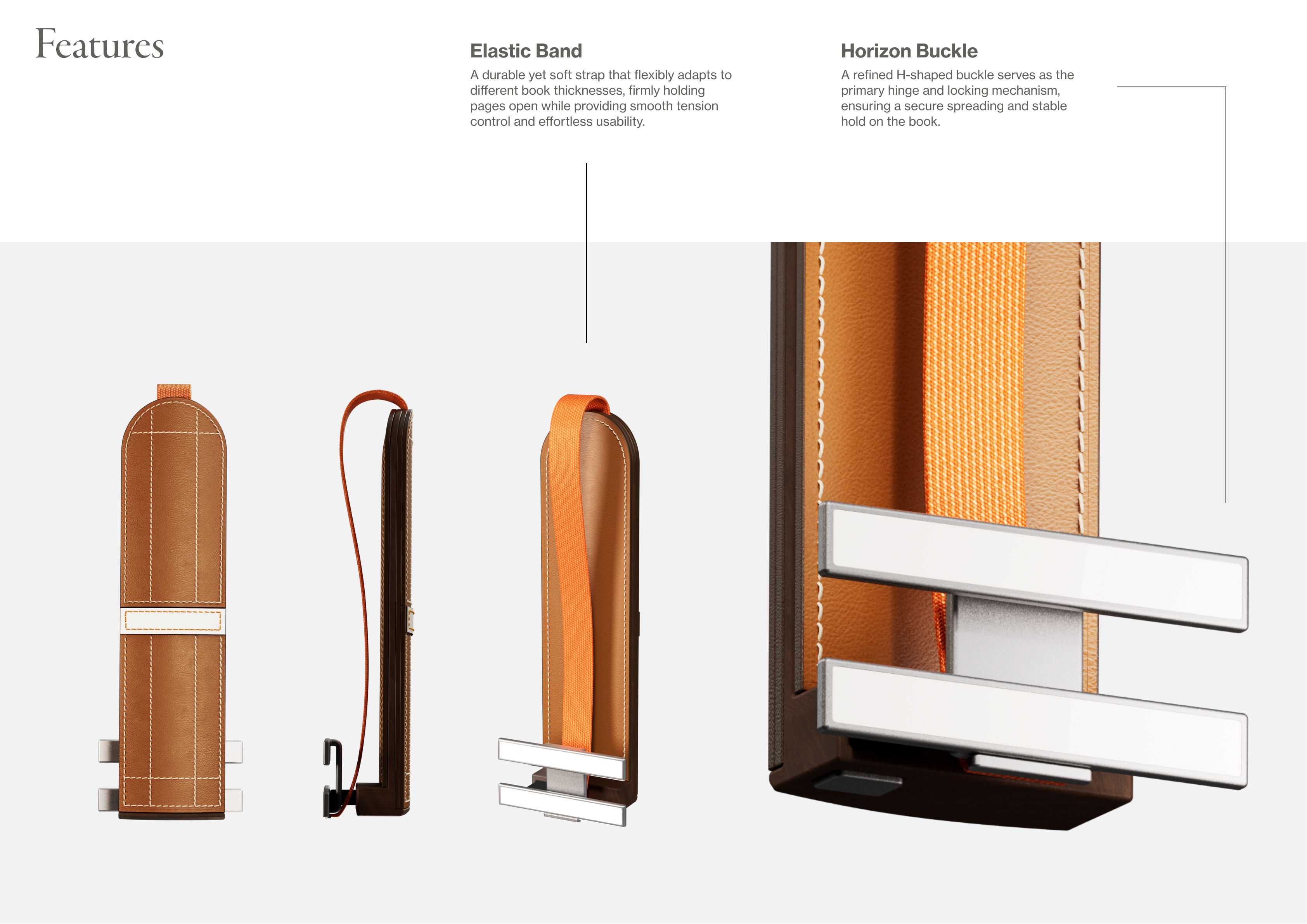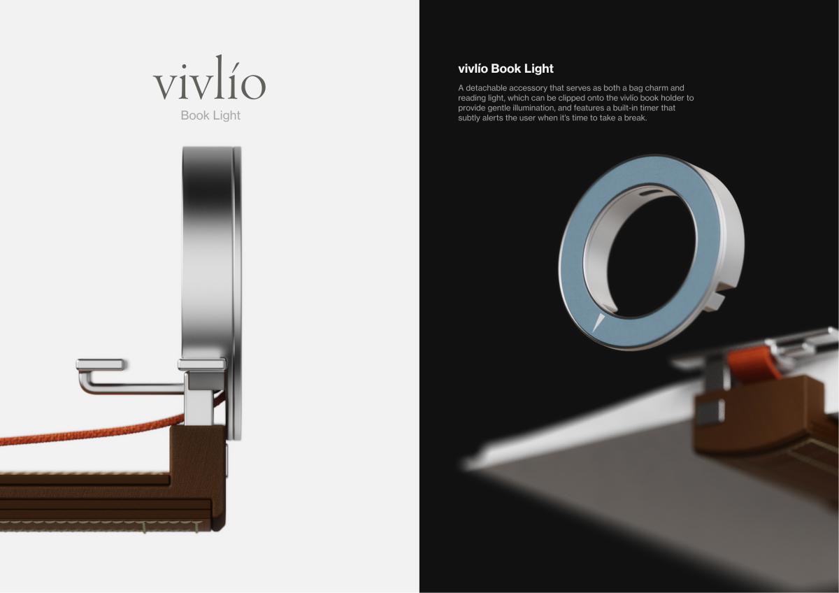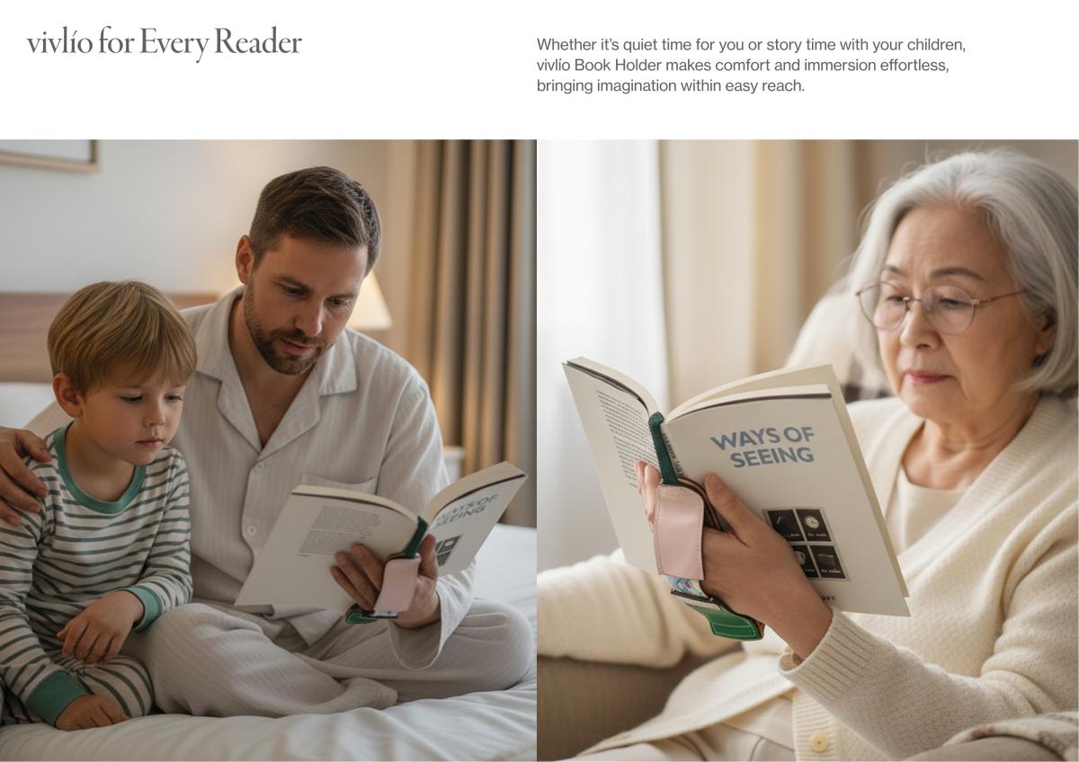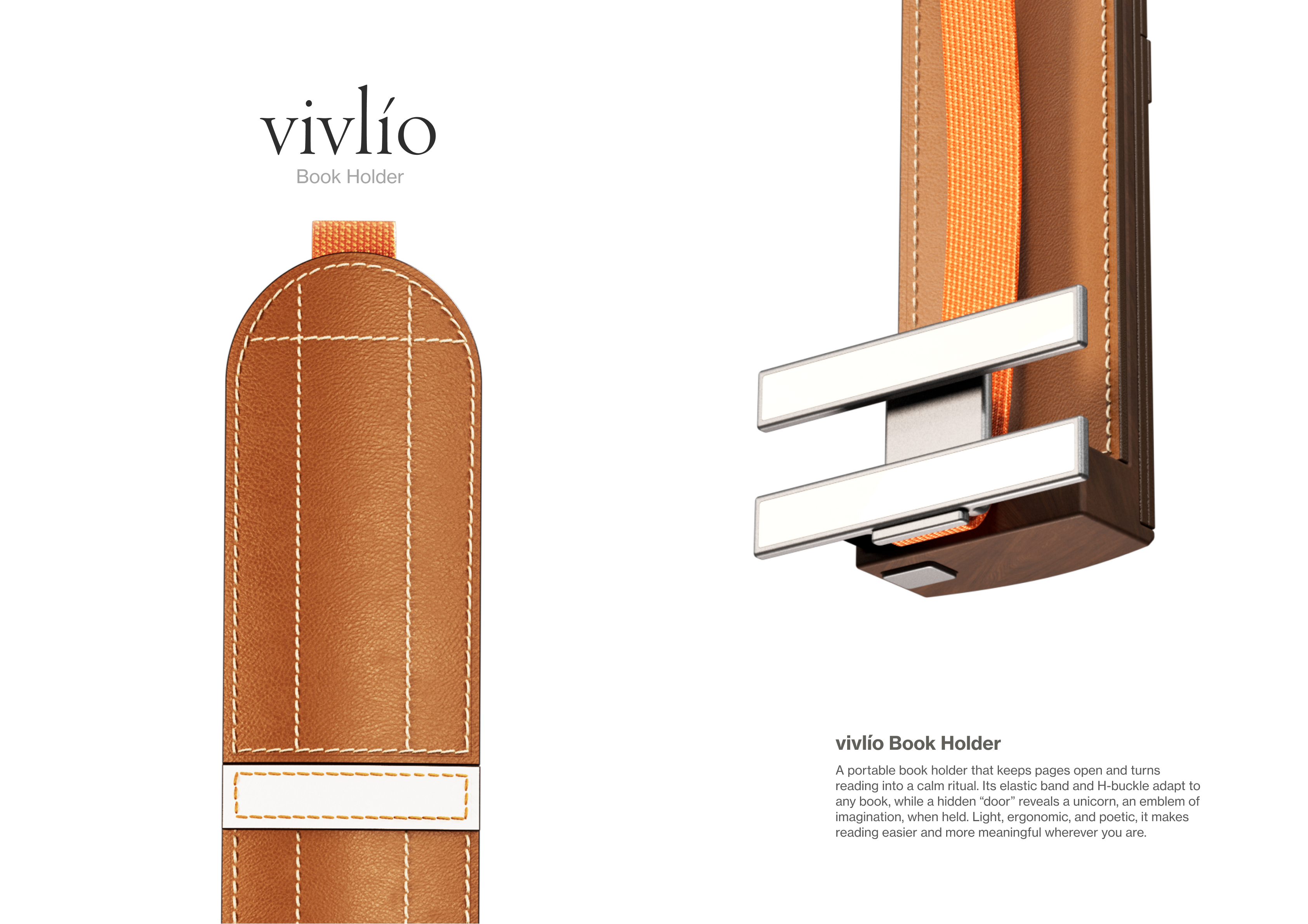 vivlío is a portable book holder that keeps pages open and turns reading into a calm ritual. Its elastic band and H-buckle fit any book, while a hidden “door” reveals a unicorn when held (symbolizing imagination). Light, ergonomic, and poetic, it makes reading easier and more meaningful anywhere.