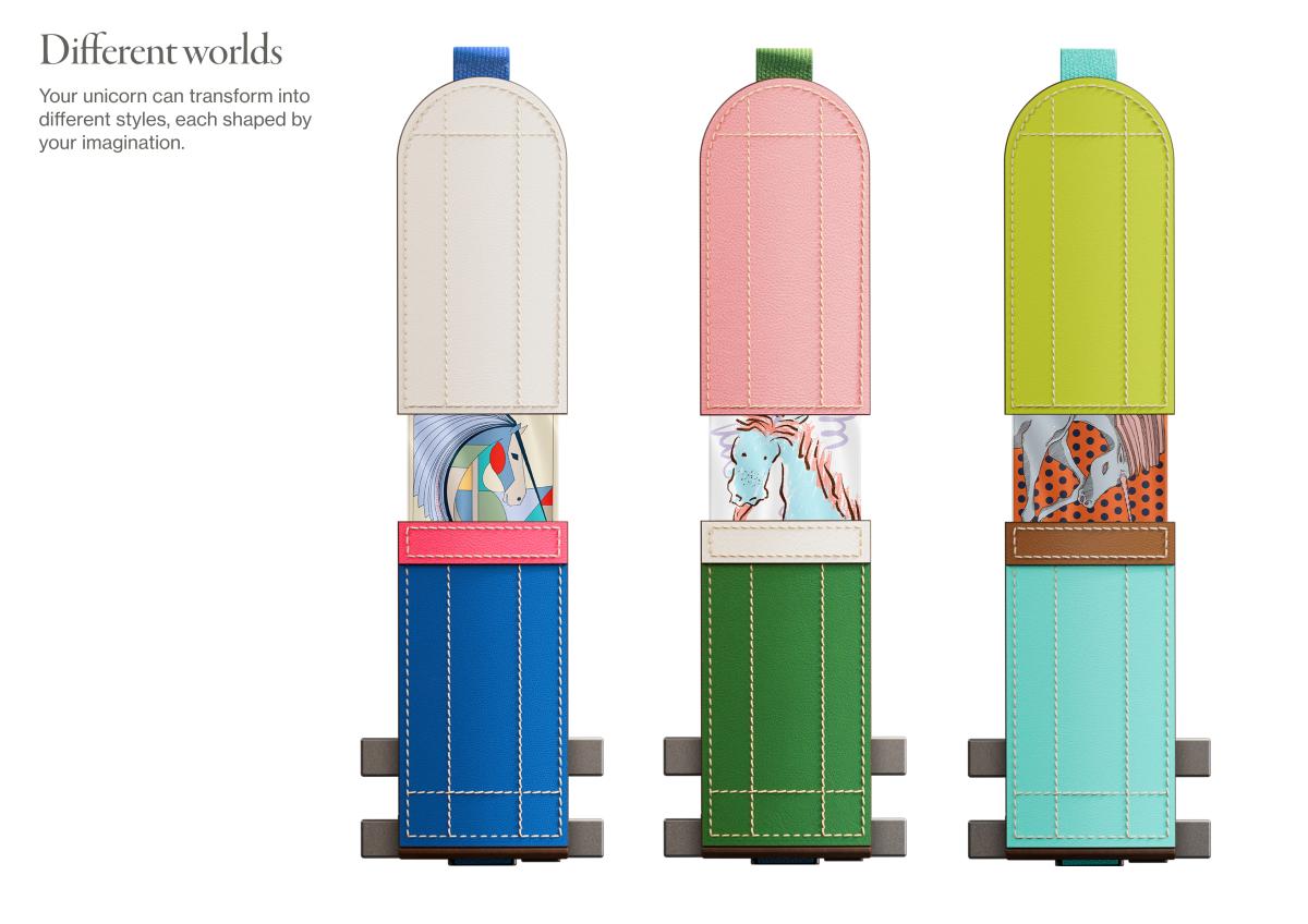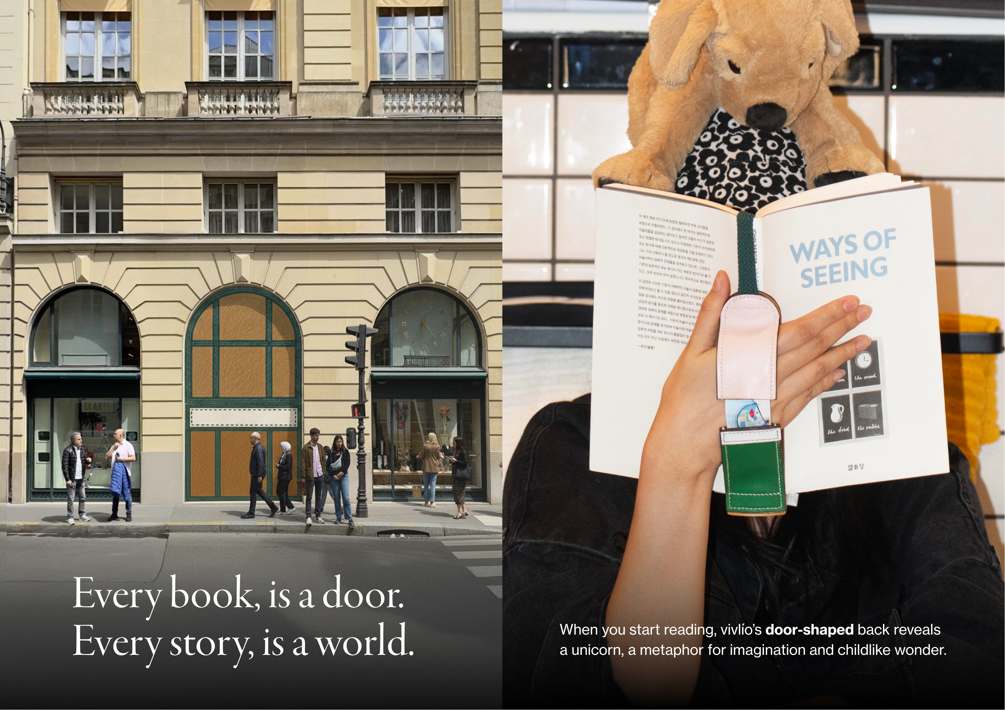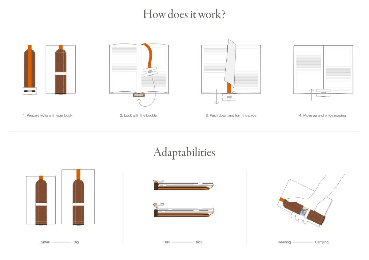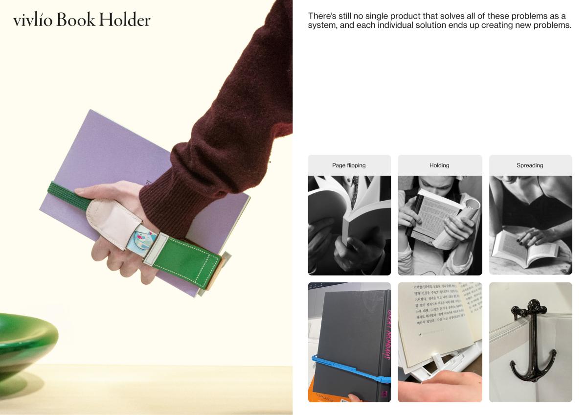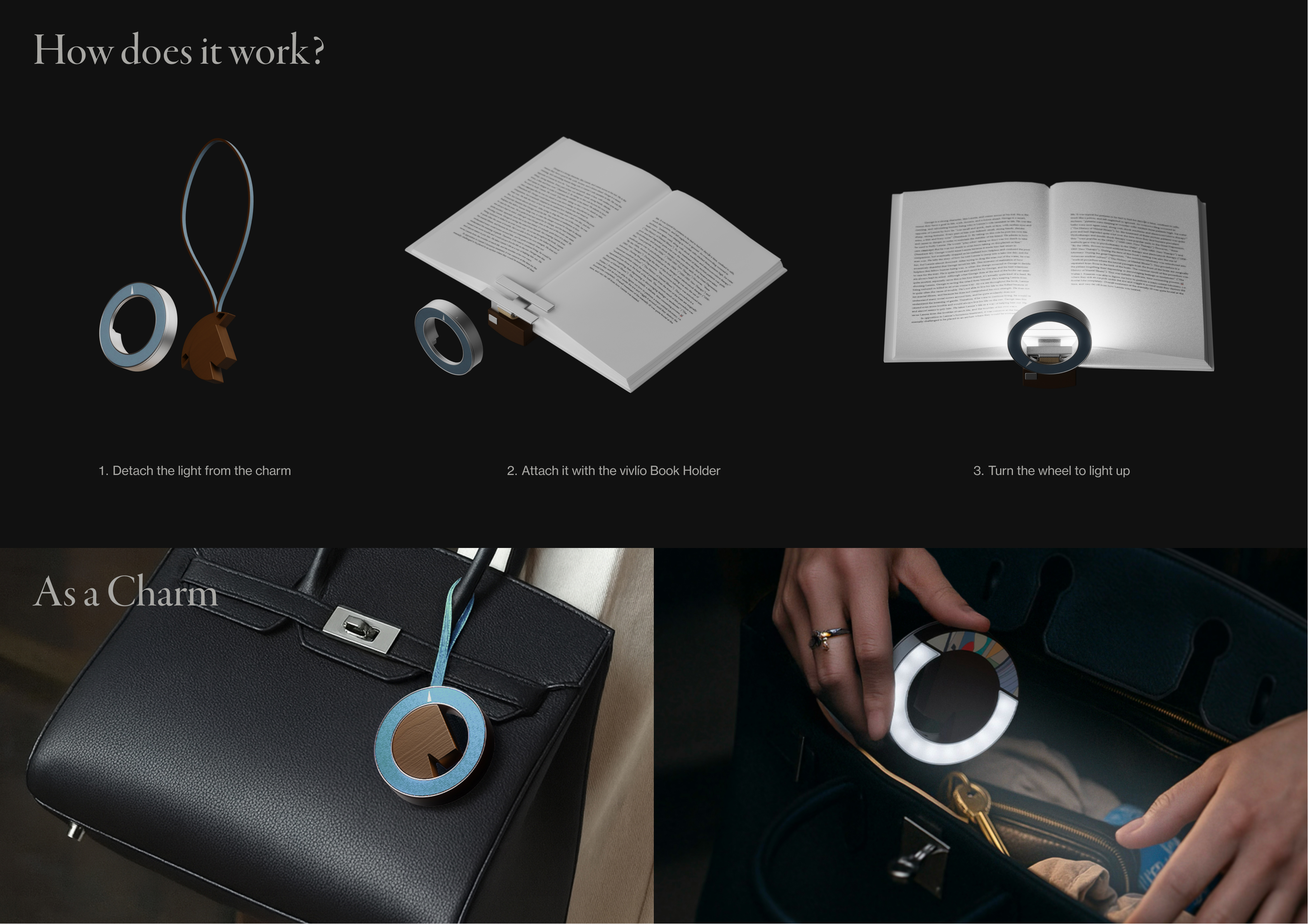 vivlío is a portable book holder that keeps pages open and turns reading into a calm ritual. Its elastic band and H-buckle fit any book, while a hidden “door” reveals a unicorn when held (symbolizing imagination). Light, ergonomic, and poetic, it makes reading easier and more meaningful anywhere.