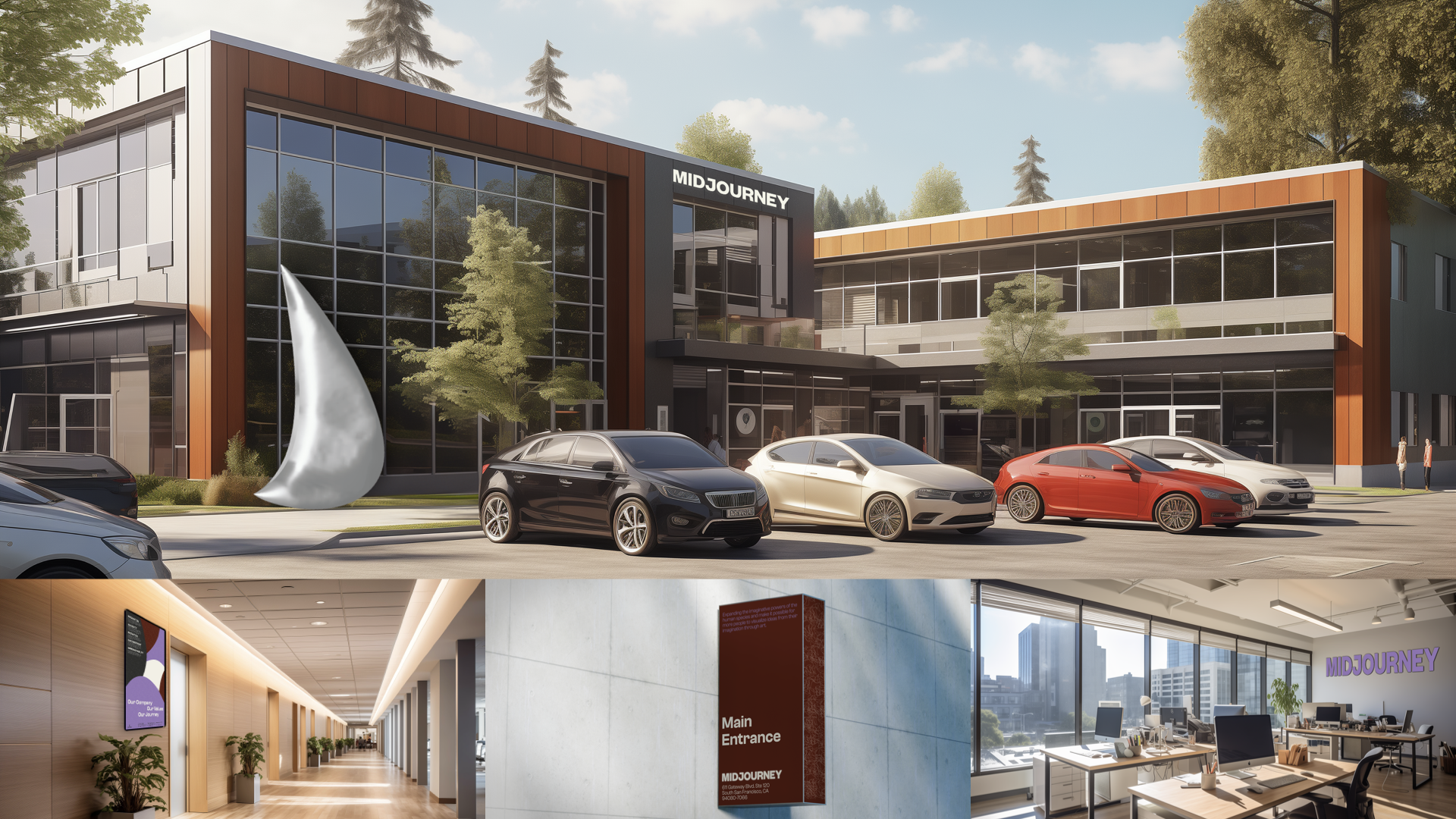 Though Midjourney has been a remote company, I wanted to imagine what their first HQ office space might look like. The HQ would feature a brushed stainless steel sculpture of the Midjourney sail outside.