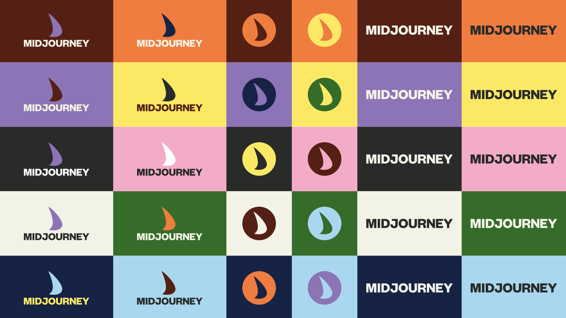 Logo family system expressed through all brand colors: vertical lockup, icon, wordmark. These colors aim to connect with a broader audience across cultures, ages, and industries. The primary color palette helps Midjourney stand out from the majority of tech companies.