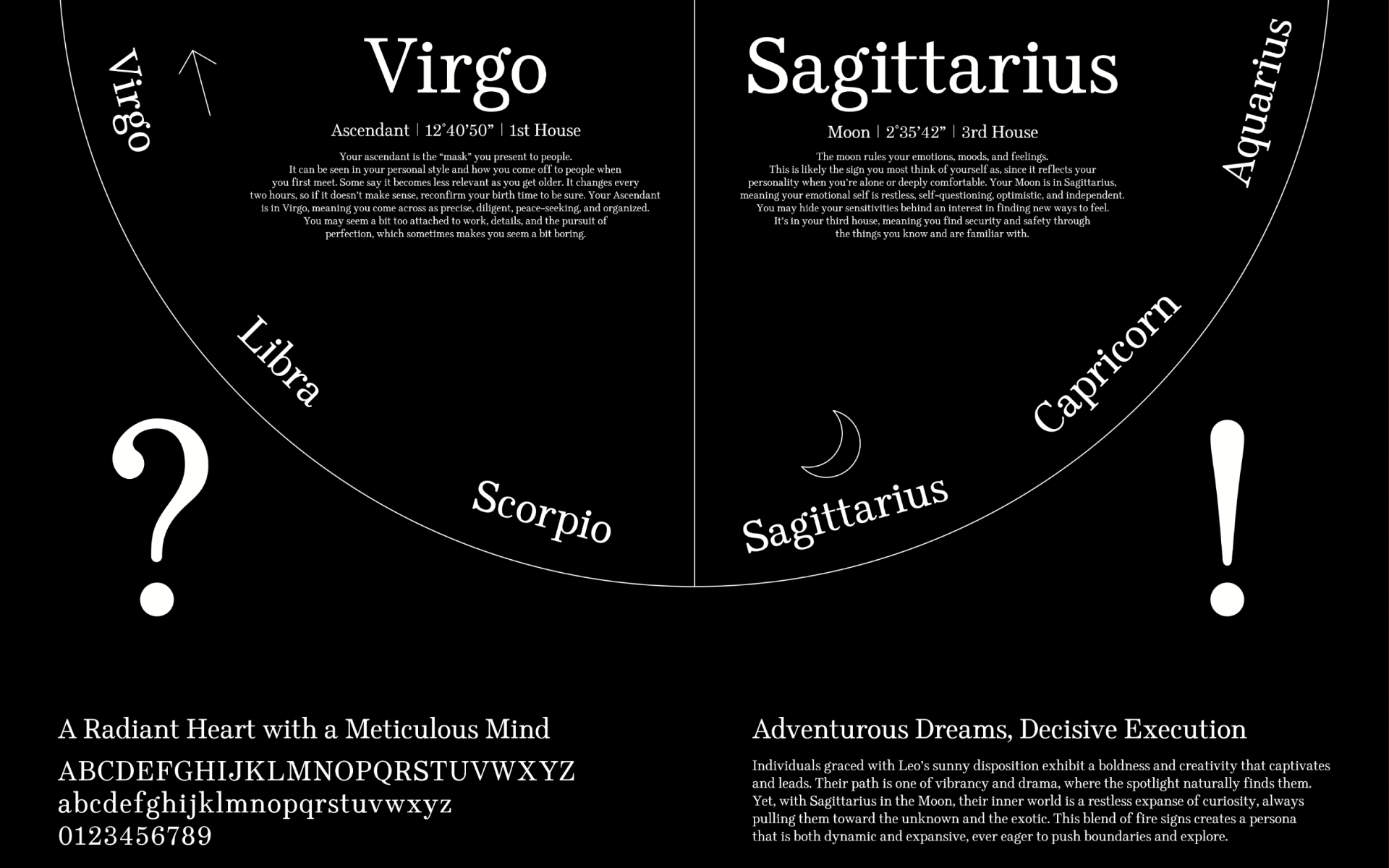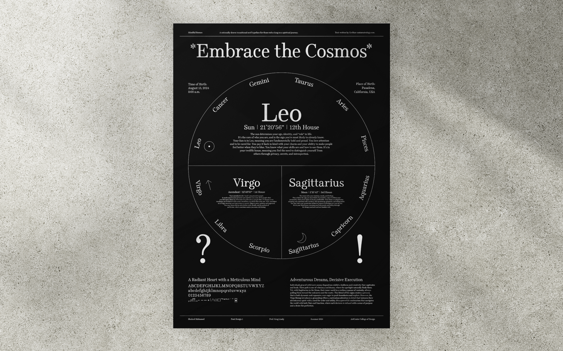 Mindful Roman is a rationally drawn transitional serif typeface for those embarking on a spiritual journey. Mindful Roman is currently used for my name in all identity pieces for my personal brand (website, résumé, business cards, etc). The specimen poster is an a astrological chart for the birth of the typeface.