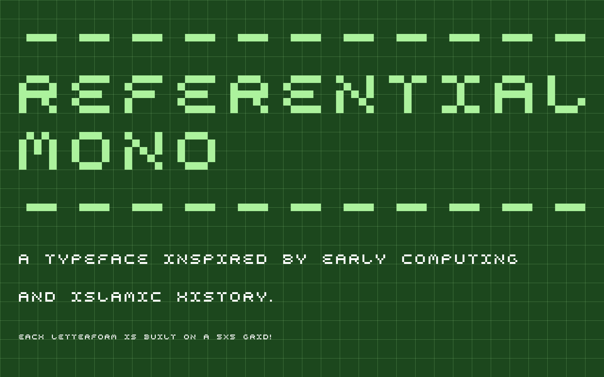 Referential Mono is built on a 5x5 grid, inspired by early computing and Islamic History. As a developer and Muslim, this typeface was an opportunity to combine many aspects of my identity in one project.