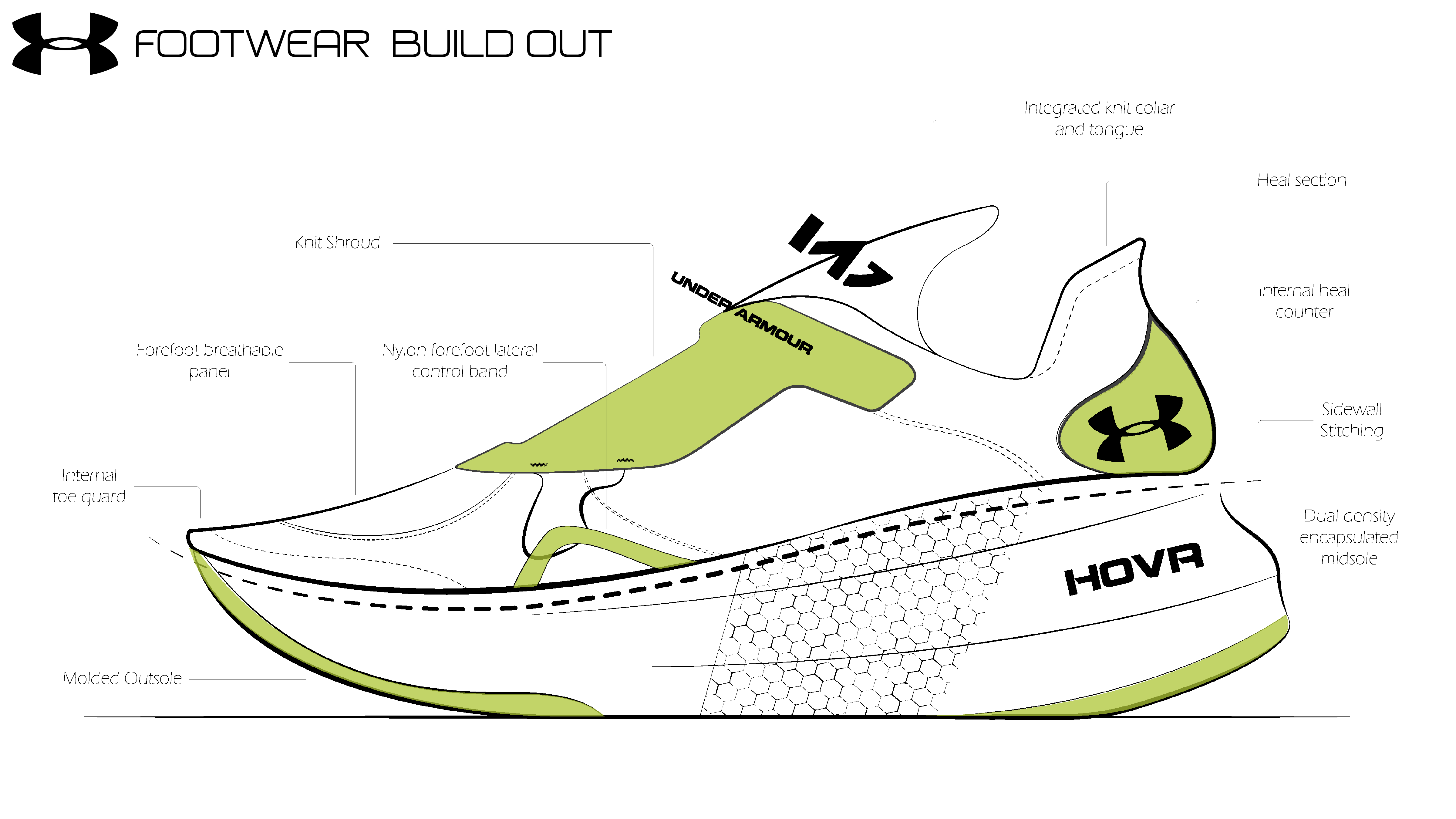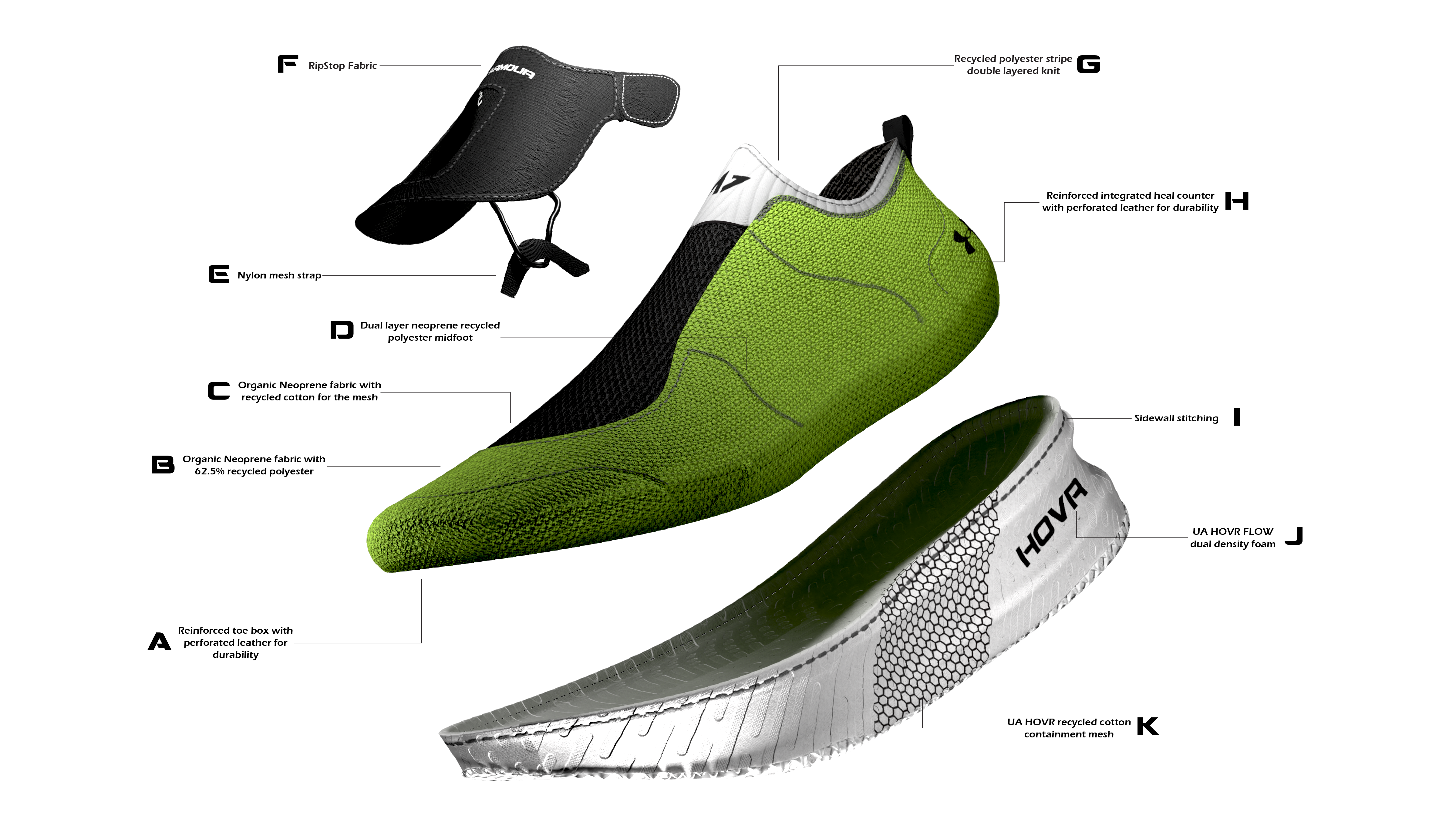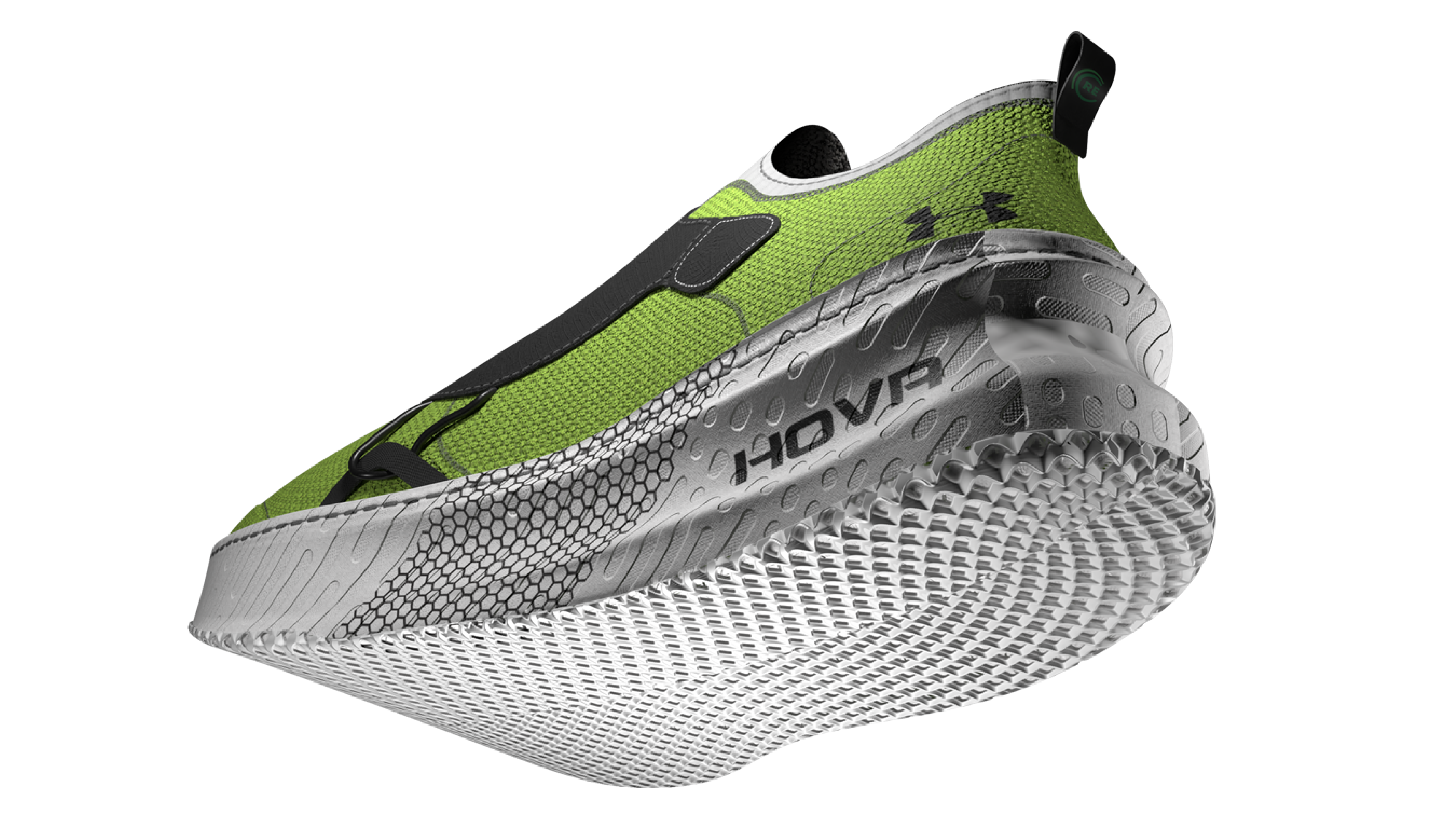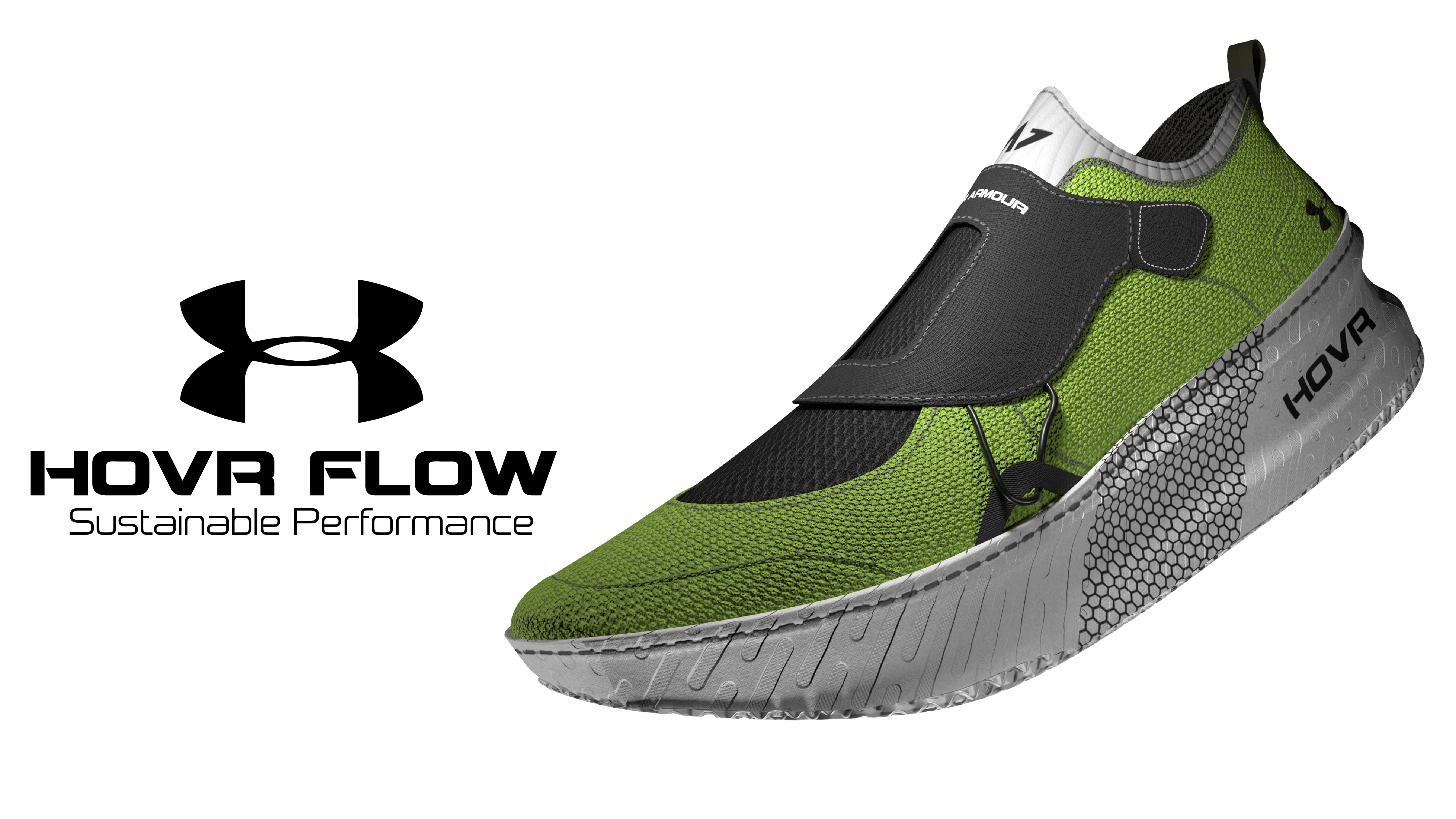 HOVR FLOW is a sustainably designed performance shoe that emphasizes on Under Armours 2 main cushioning systems while injecting sustainability at the forefront of material design and footwear manufacturing.