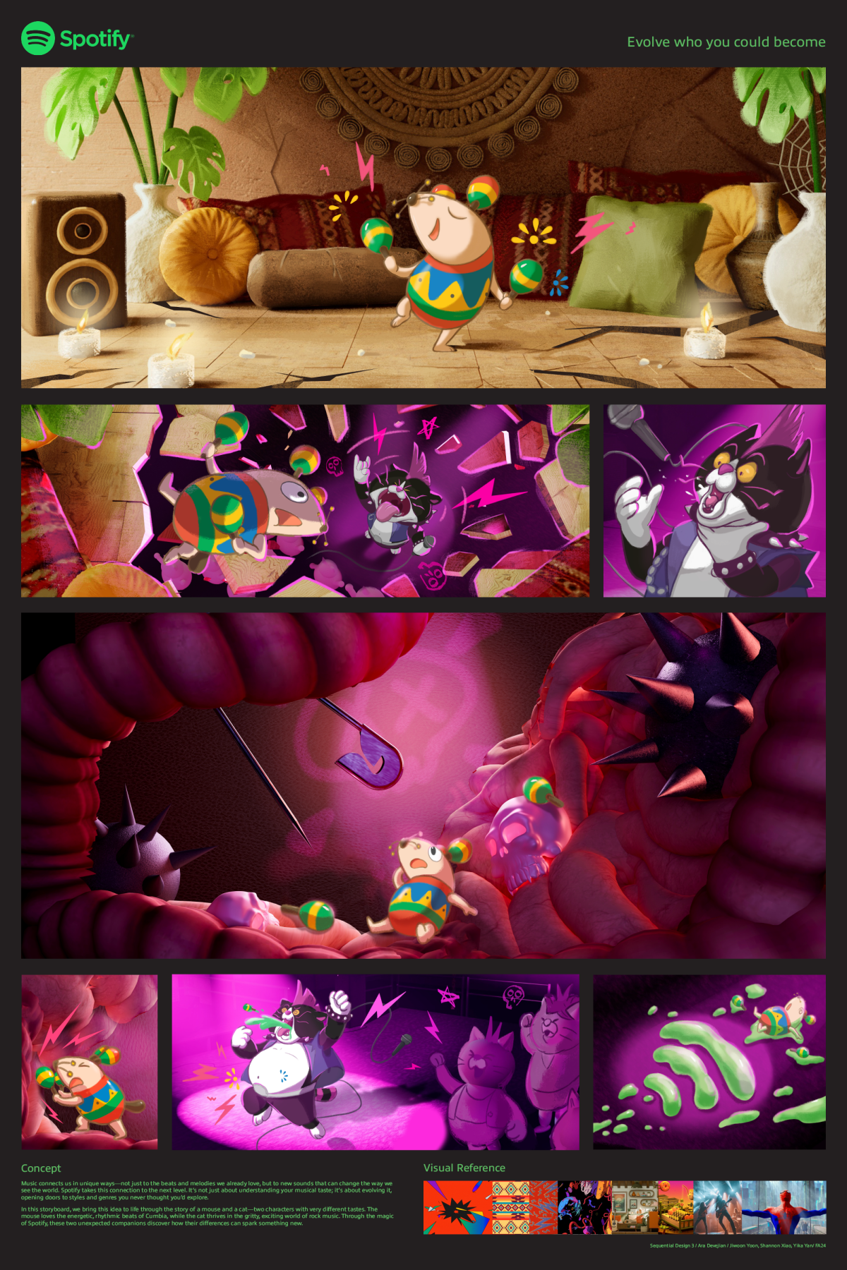 Our aim was to celebrate how music opens us up, not only to new genres, but to new parts of ourselves and each other. We leaned into bold, expressive visuals to show how music transcends taste and personality. A timid maraca-shaking mouse and a rebellious rock ānā roll cat journey from conflict to connection, their evolution animated through chaotic textures, vibrant lighting, and surreal transitions.