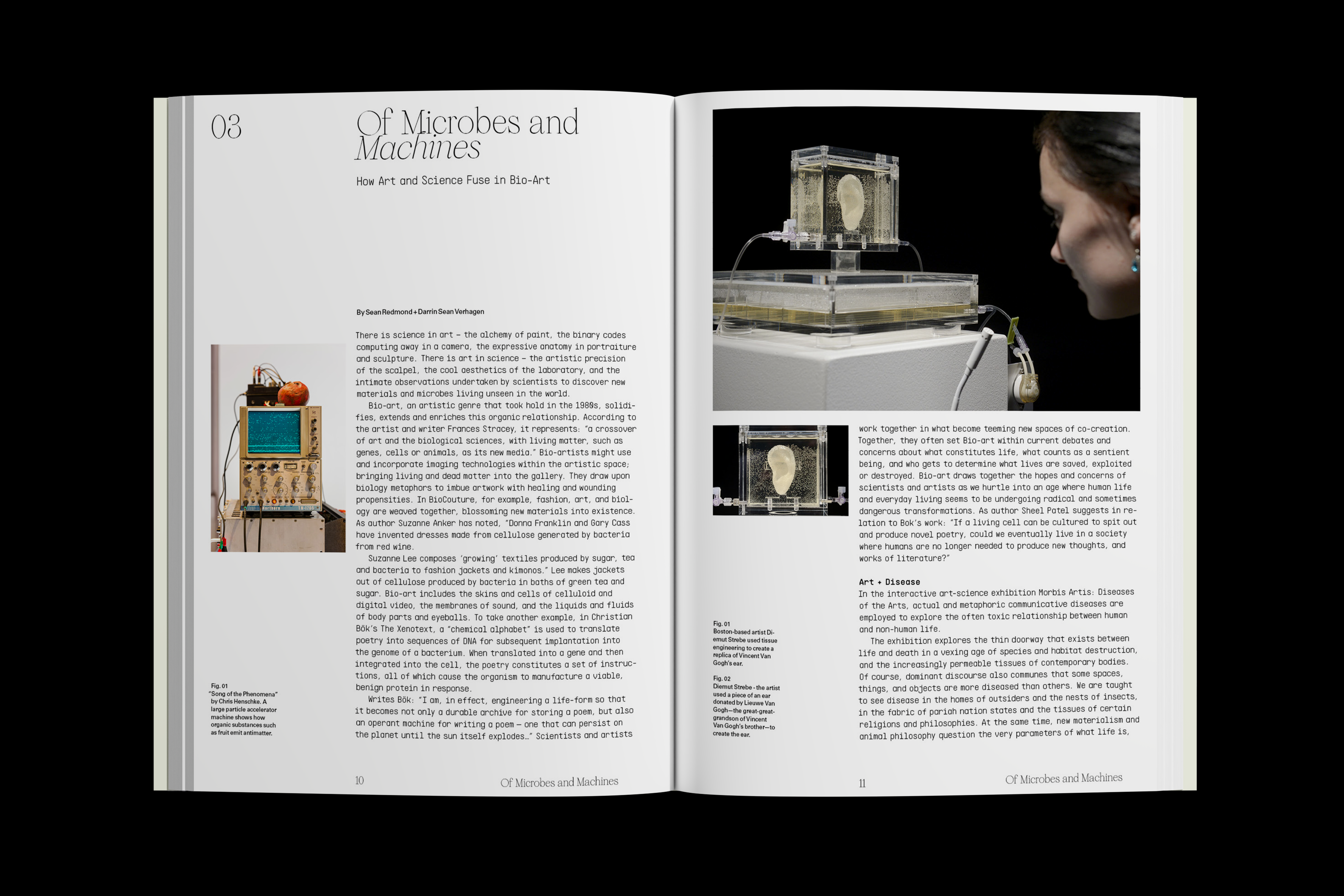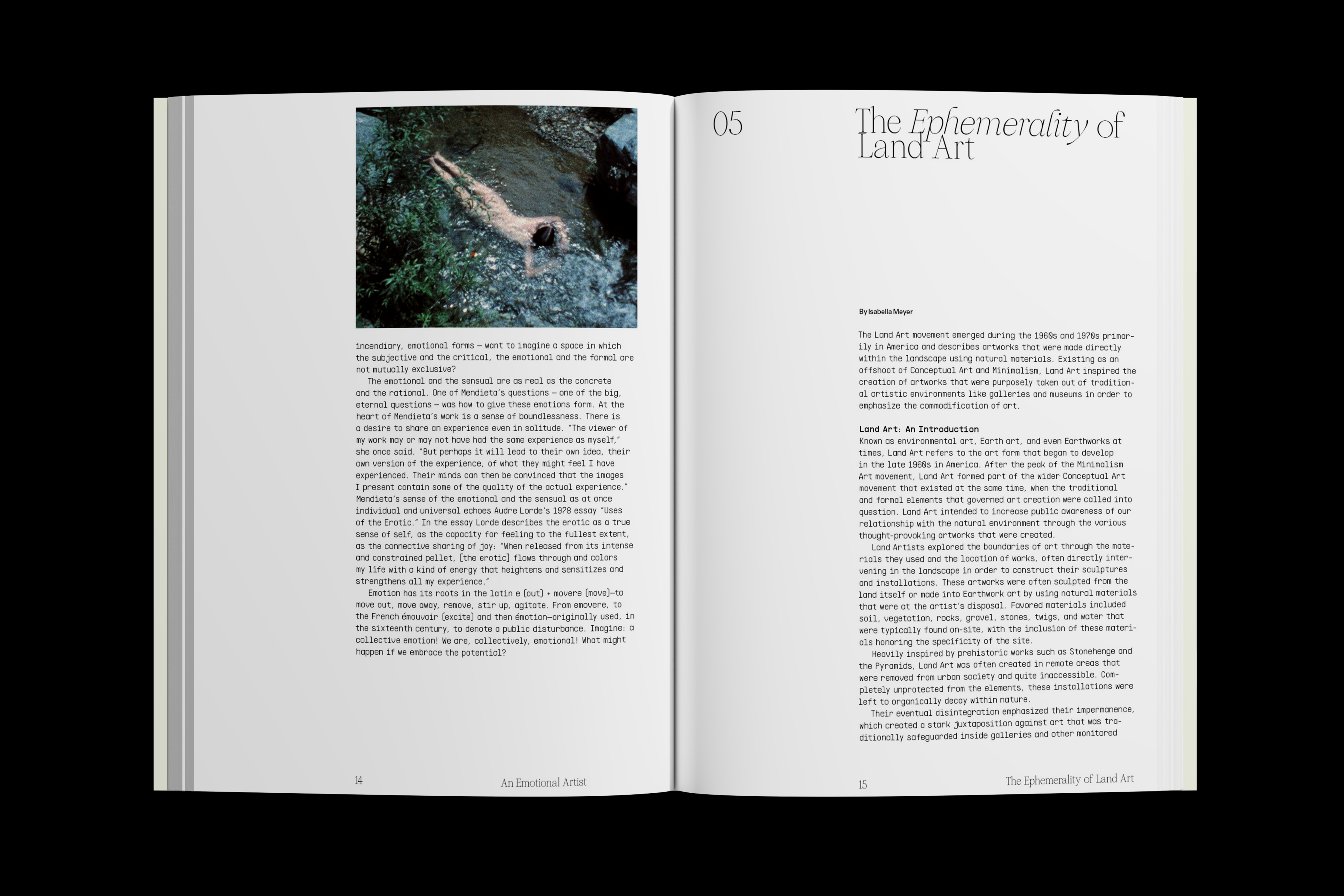 The core concept centers on the dialogue between organic and artificial systems, how natural patterns can emerge from technological processes, and vice versa. I was inspired by artists and designers working in bio-art, data visualization, and environmental design, where materials and media blend in unexpected ways. The story within the design mirrors this hybridity: fluid text blocks and flowing compositions represent organic movement, while structured grids and modular typographic systems represent logic and control. Together, they tell a visual story of coexistence and tension, reflecting how the natural world and human innovation continuously shape each other.