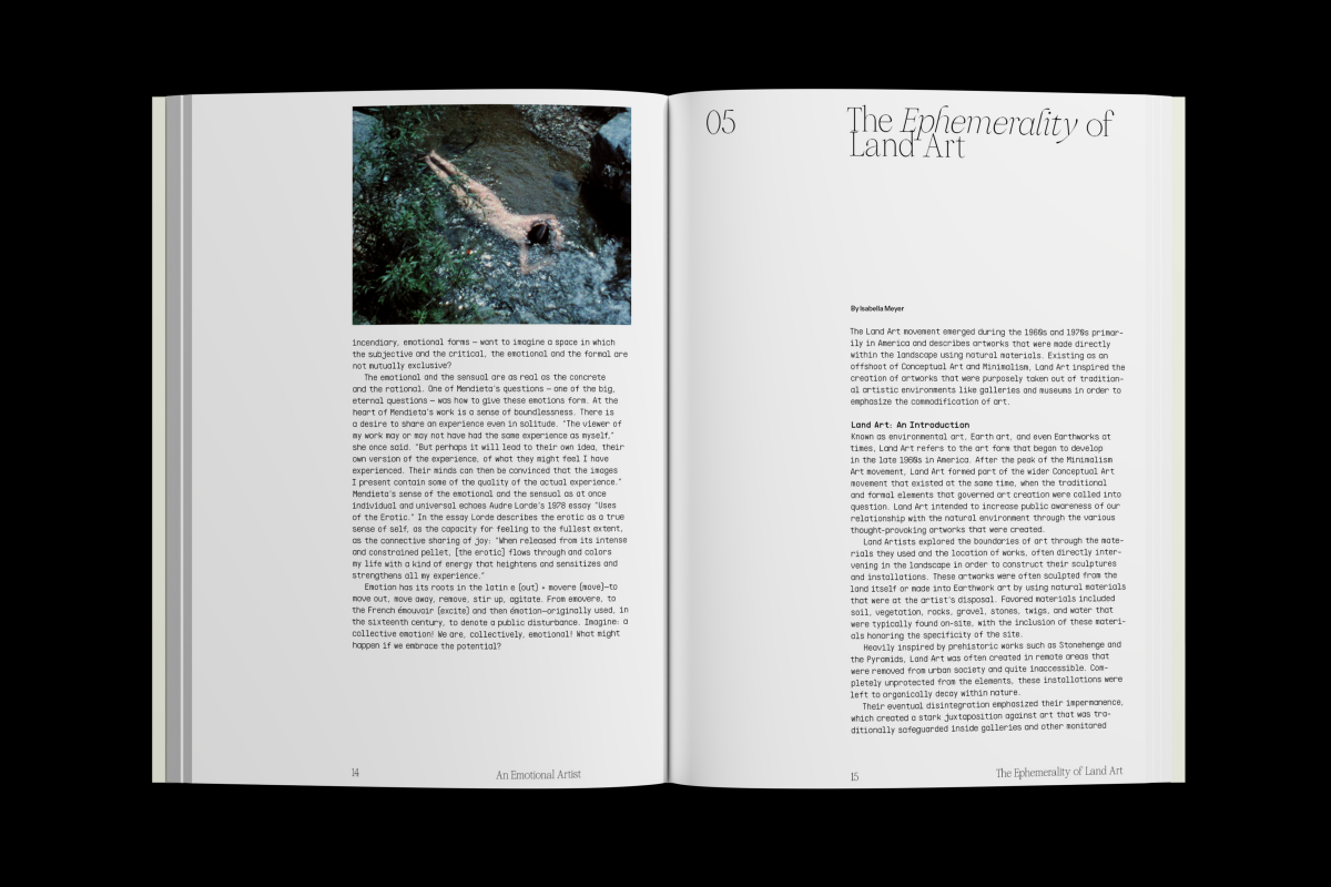Through this project, I learned how to use editorial design as a tool for storytelling, not just arranging text and images, but building an atmosphere through rhythm, hierarchy, and contrast. It taught me to think about how visual structure can reflect conceptual meaning and how subtle design choices can evoke emotion or curiosity. I also gained a stronger understanding of how to balance experimental composition with readability, and how to let form and content work together to create a cohesive narrative. Most importantly, it deepened my awareness of how design can translate abstract ideas into tangible experiences.