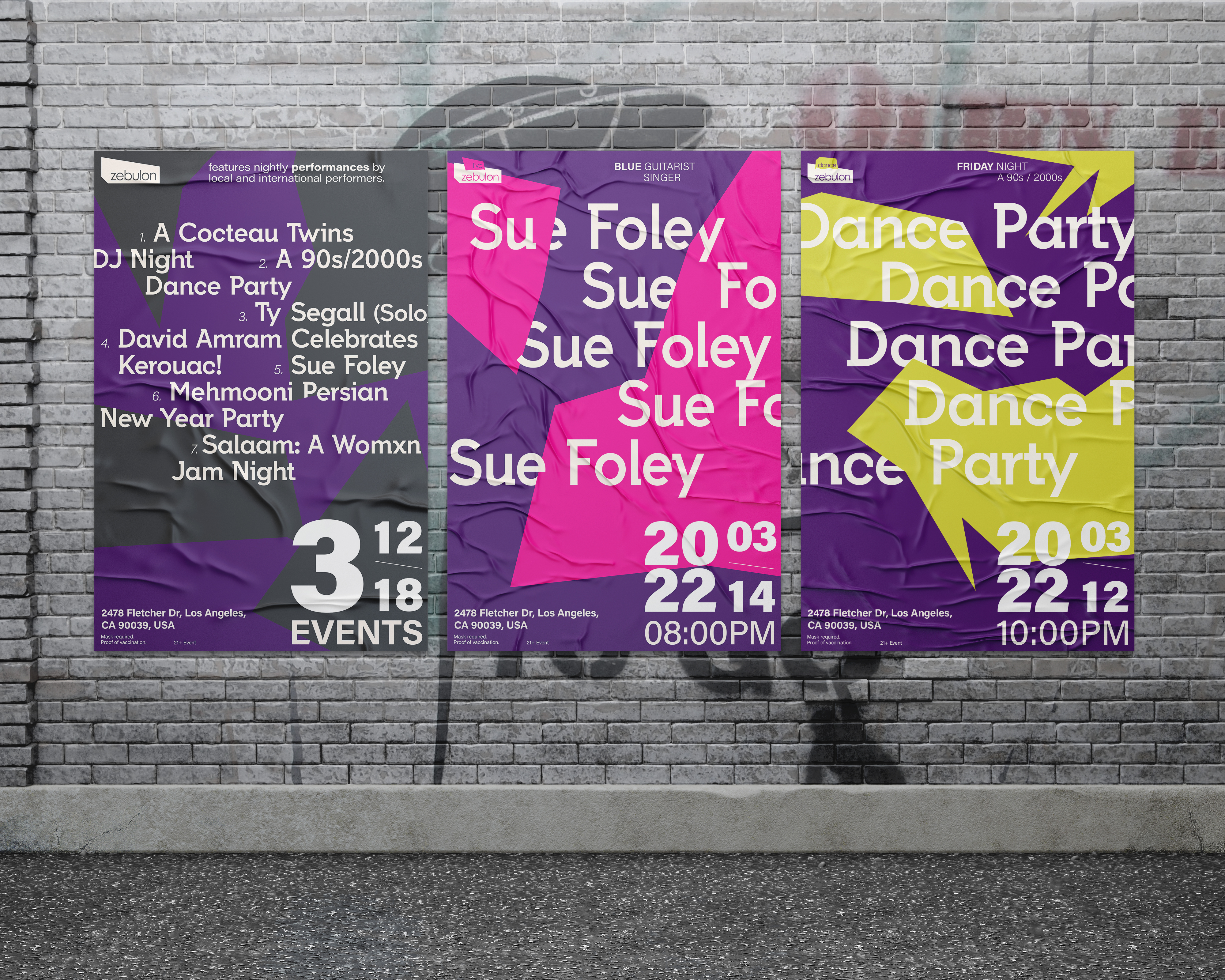 Zebulon Café Concert, known as Zebulon, is a venue for food, music, and live performances located in Los Angeles. It features night performances by local and international performers. The goal of redesigning the identity is to build an easy-to-manage branding system to connect brand activities and events. The goal of redesign also shows the diversity and the enthusiastic persona of Zebulon to customers.
