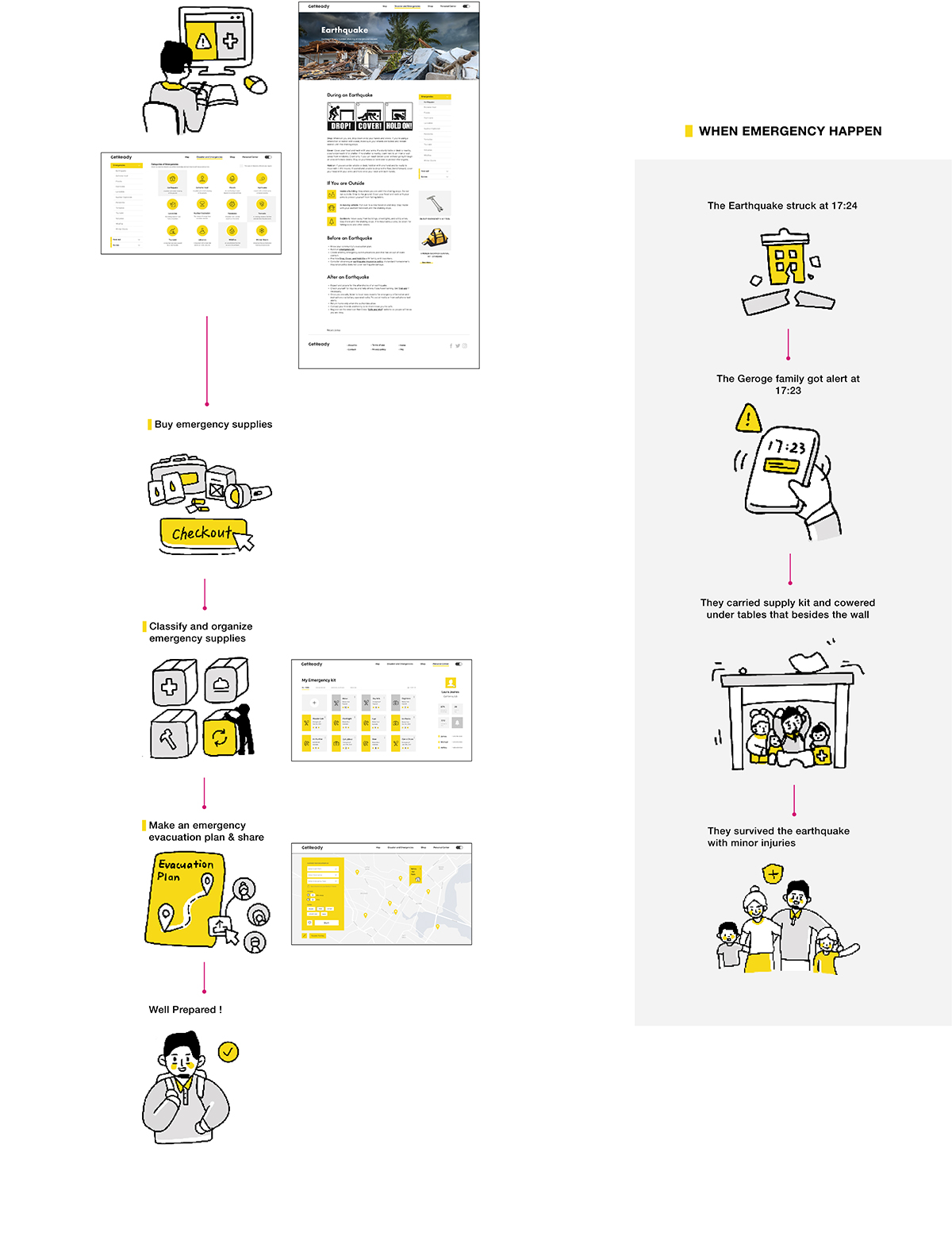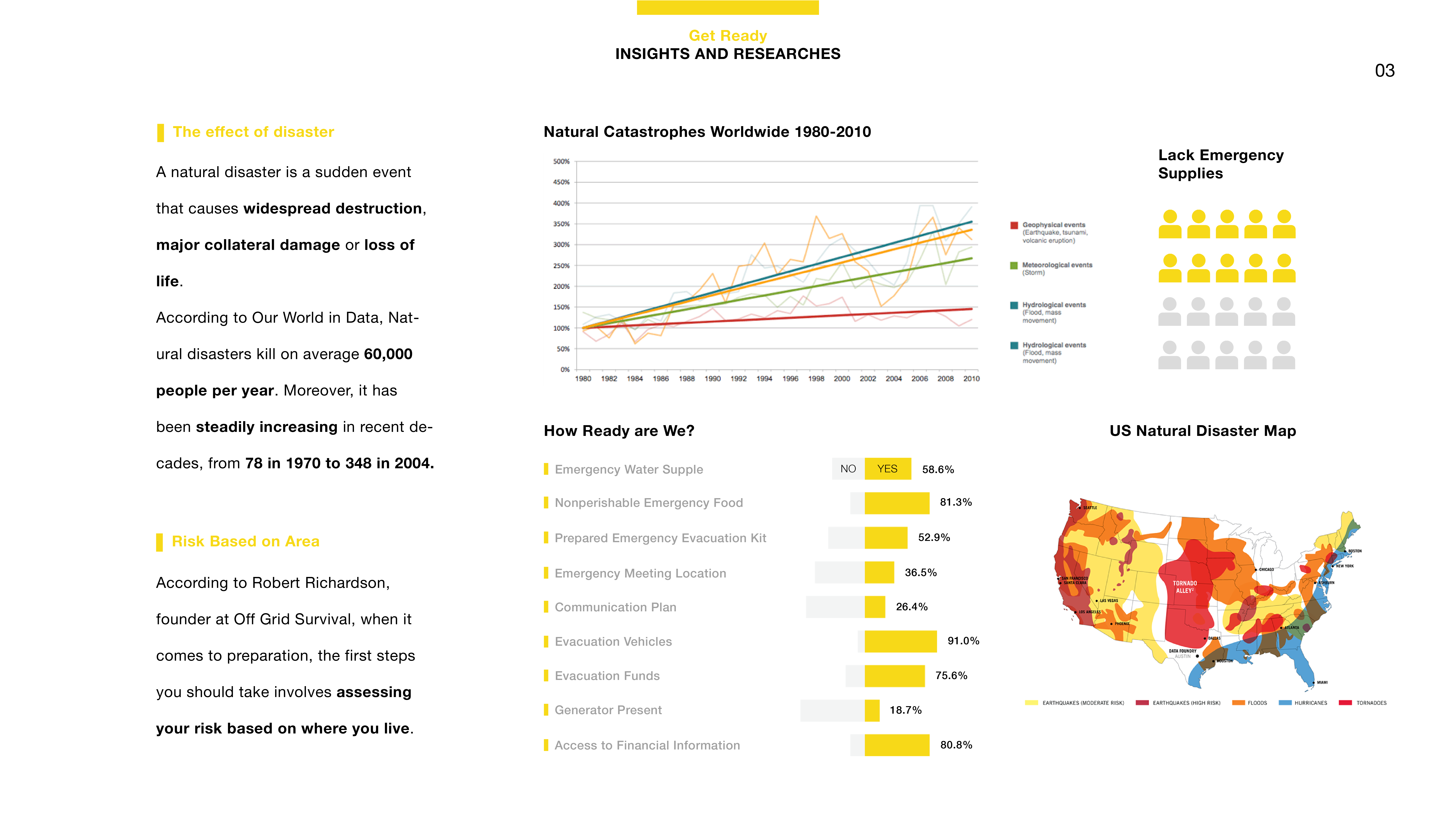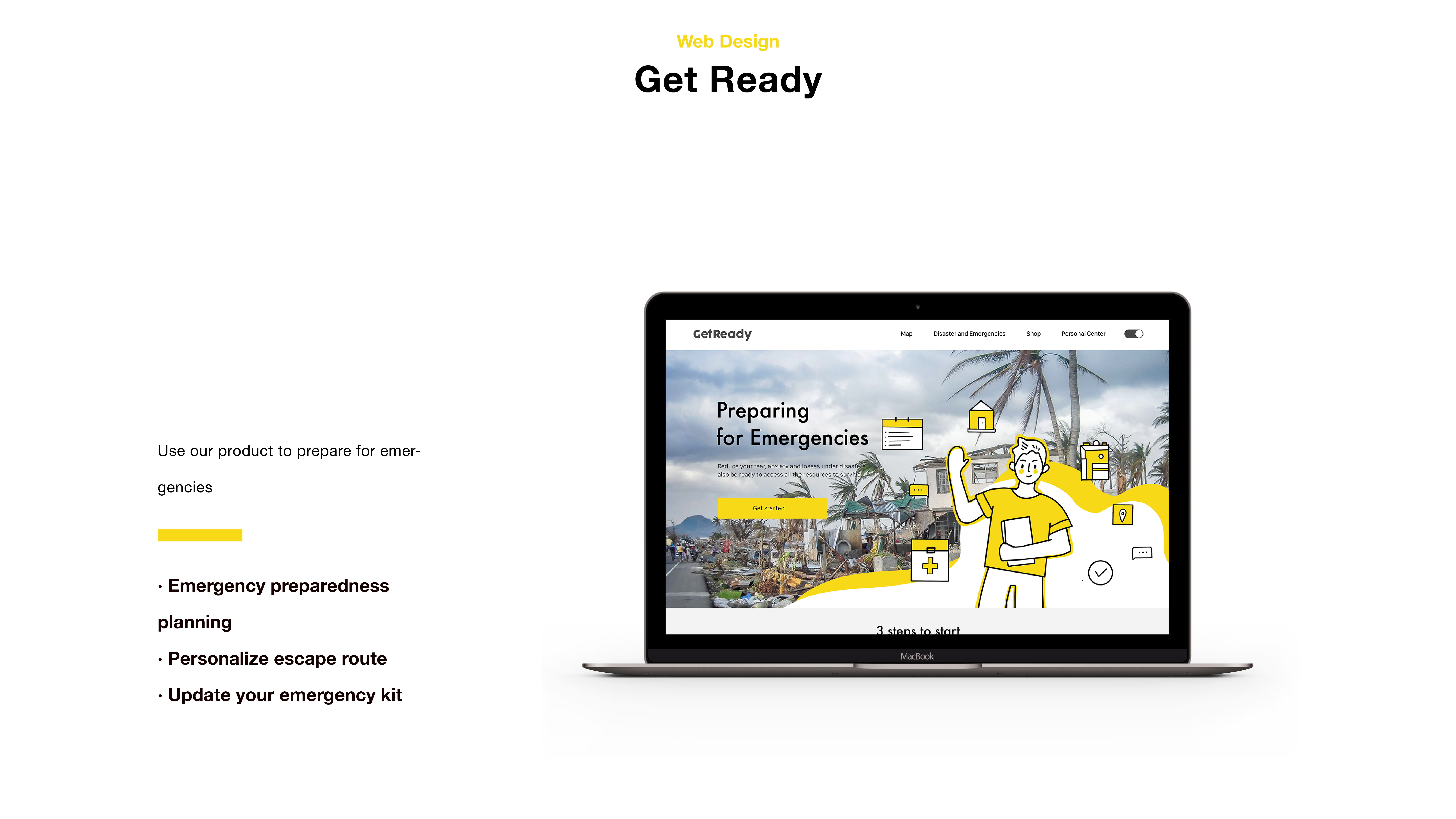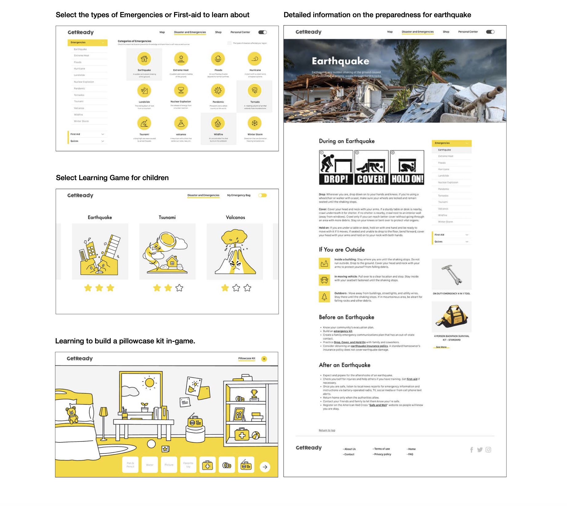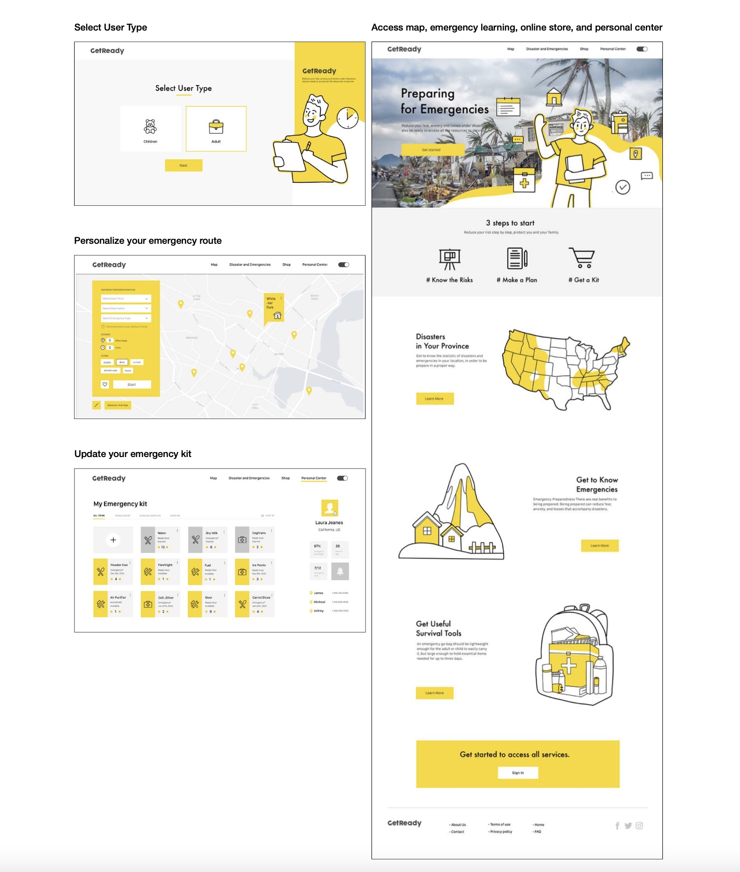 Get ready is a disaster prevention website, users are divided into two levels: adults and children. They can access the following functions in different degrees: assess disaster risk of the place of residence, learn about the information of disasters, prepare and buy emergency supplies, and make an emergency evacuation plan. The warning yellow and illustration are used on the web page, which hopes to bring the users a professional, friendly, and clear experience.