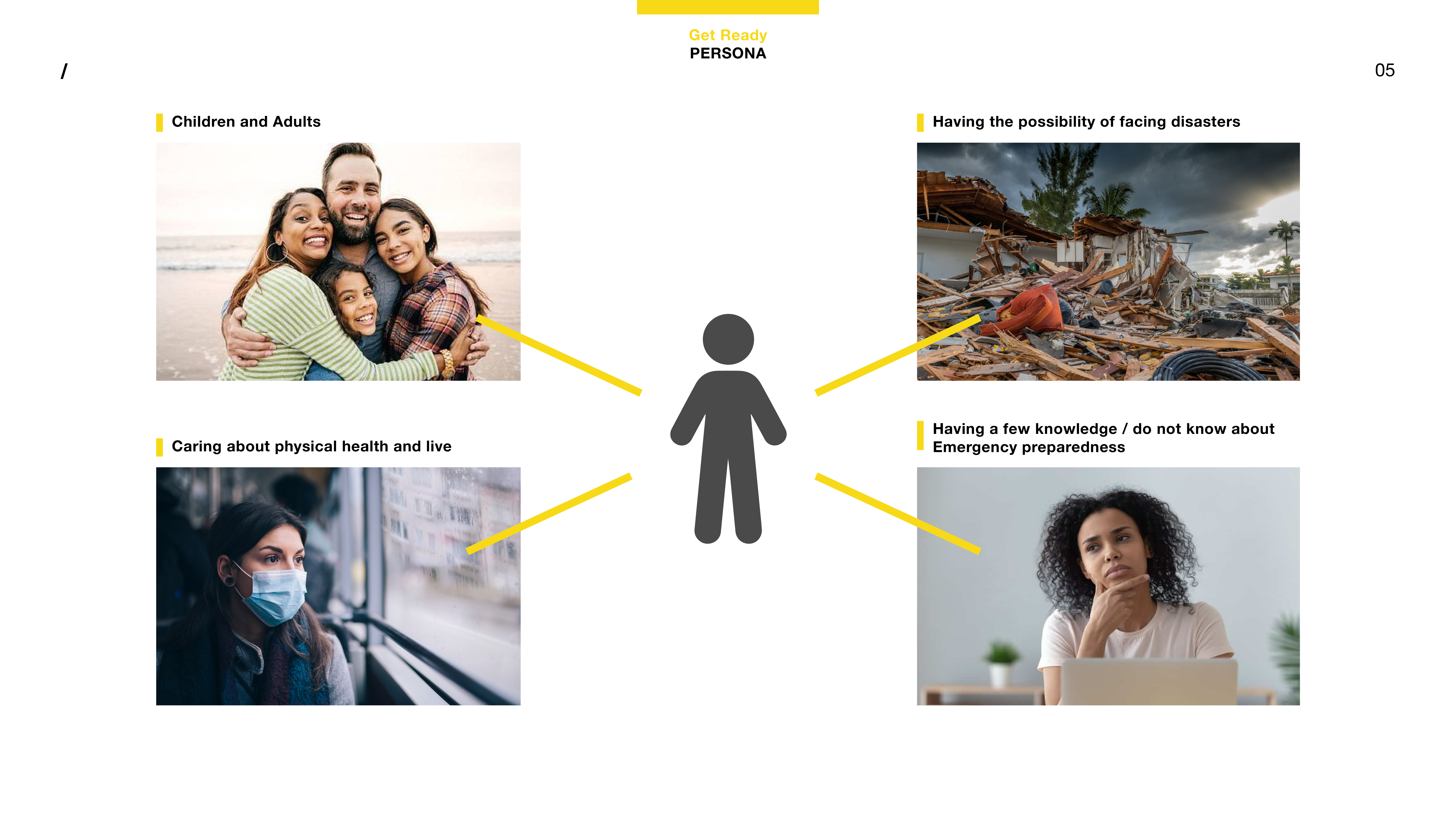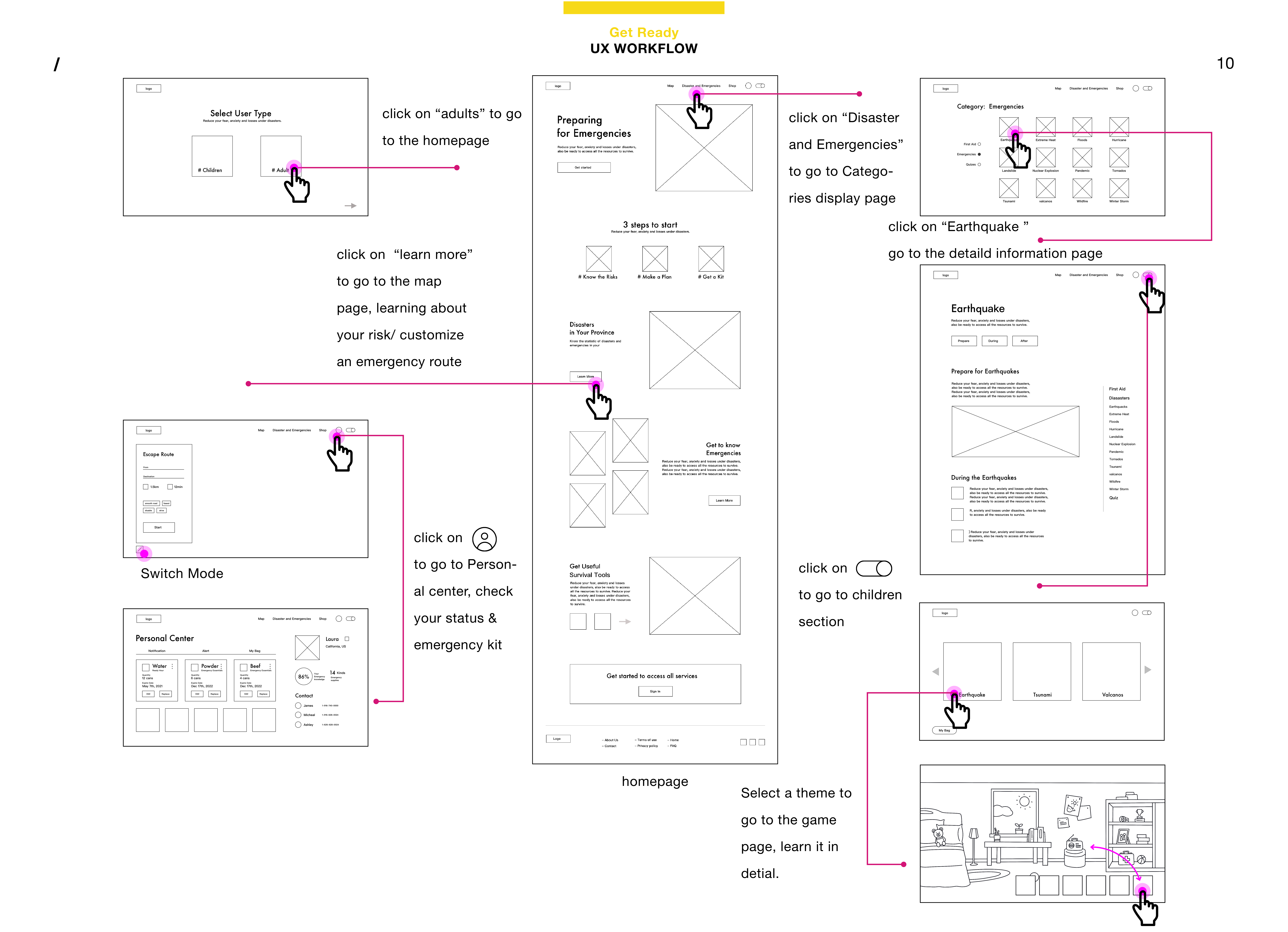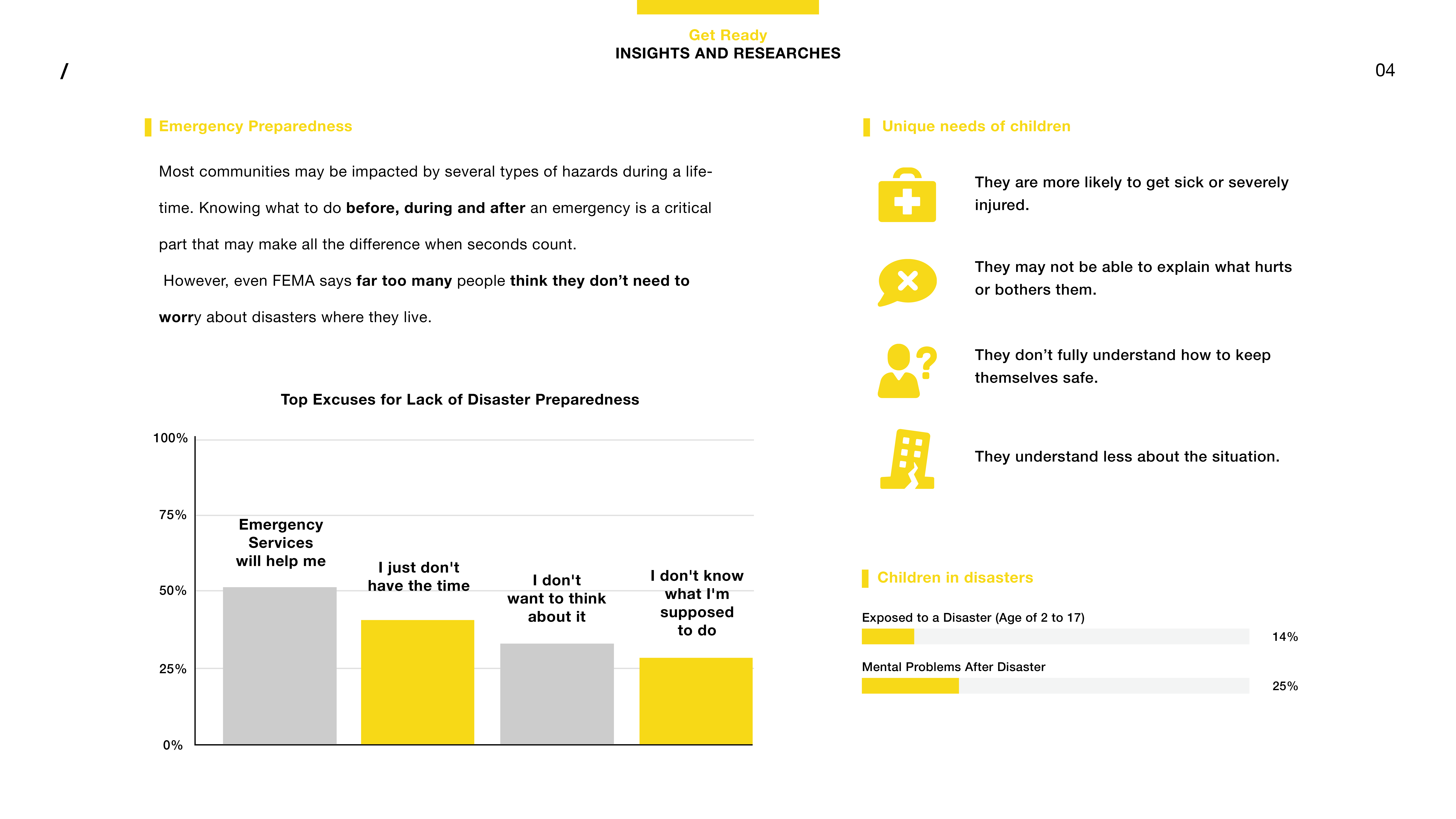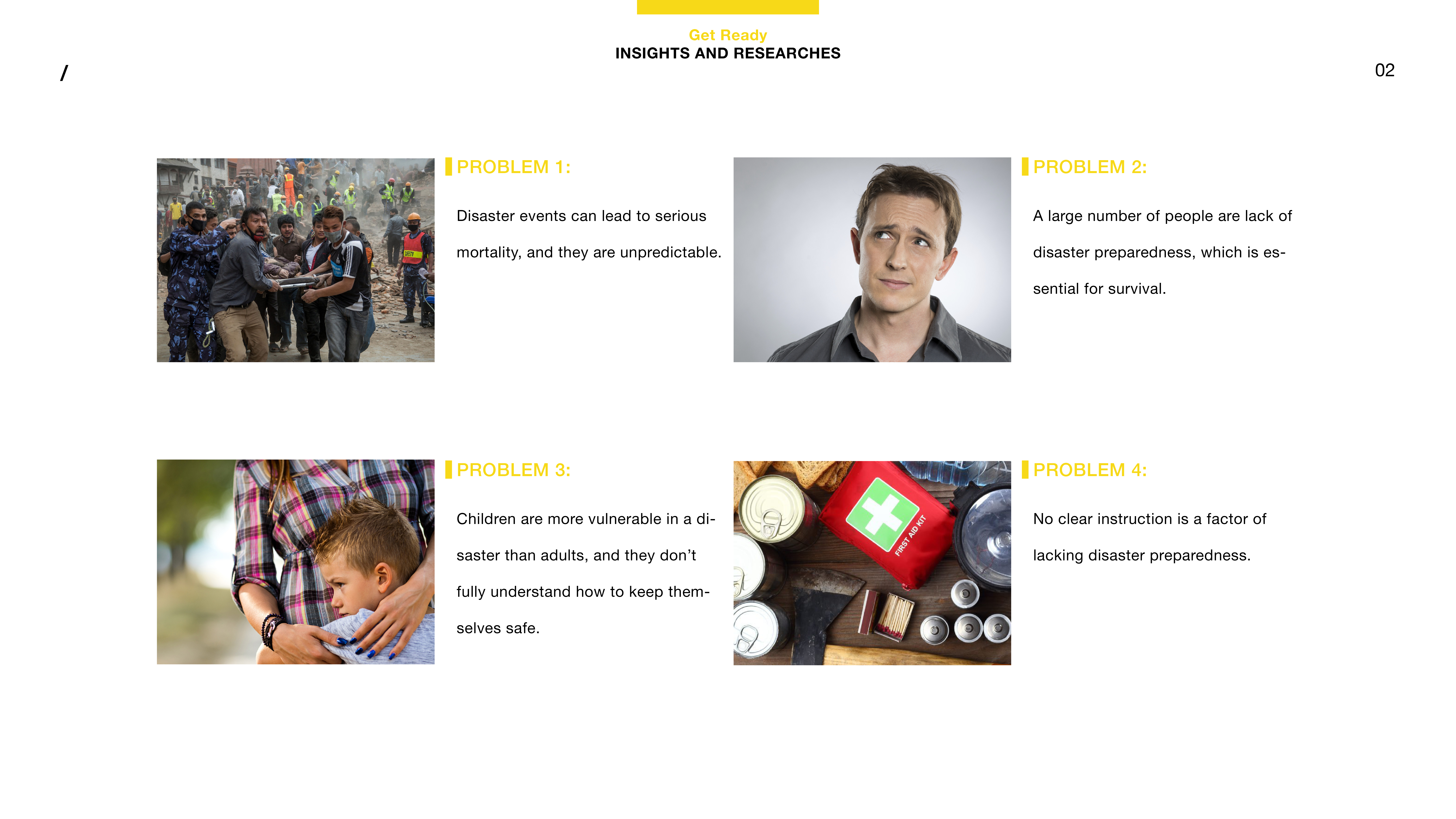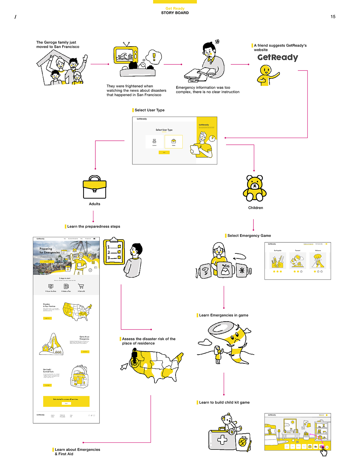 Get ready is a disaster prevention website, users are divided into two levels: adults and children. They can access the following functions in different degrees: assess disaster risk of the place of residence, learn about the information of disasters, prepare and buy emergency supplies, and make an emergency evacuation plan. The warning yellow and illustration are used on the web page, which hopes to bring the users a professional, friendly, and clear experience.