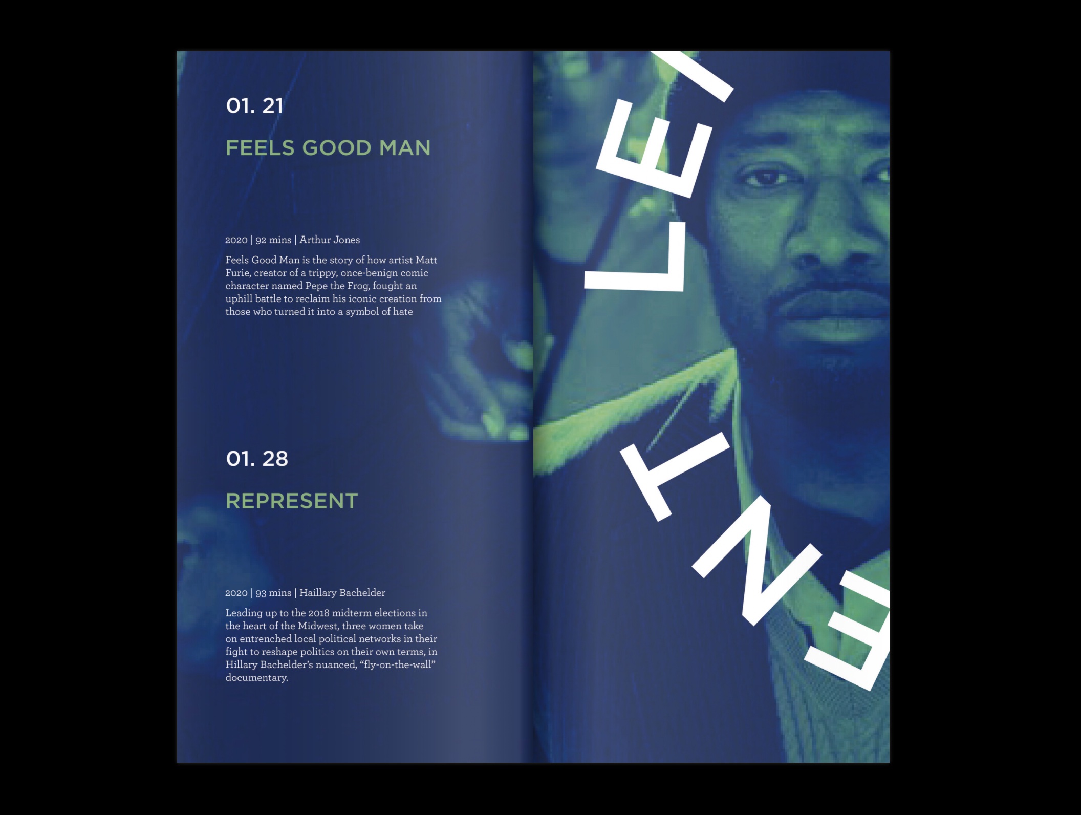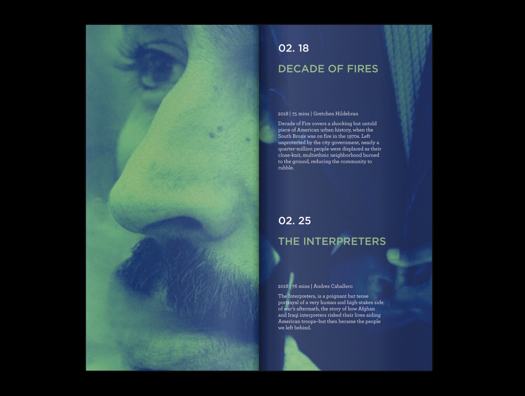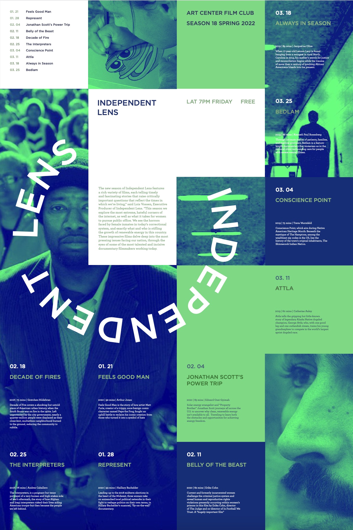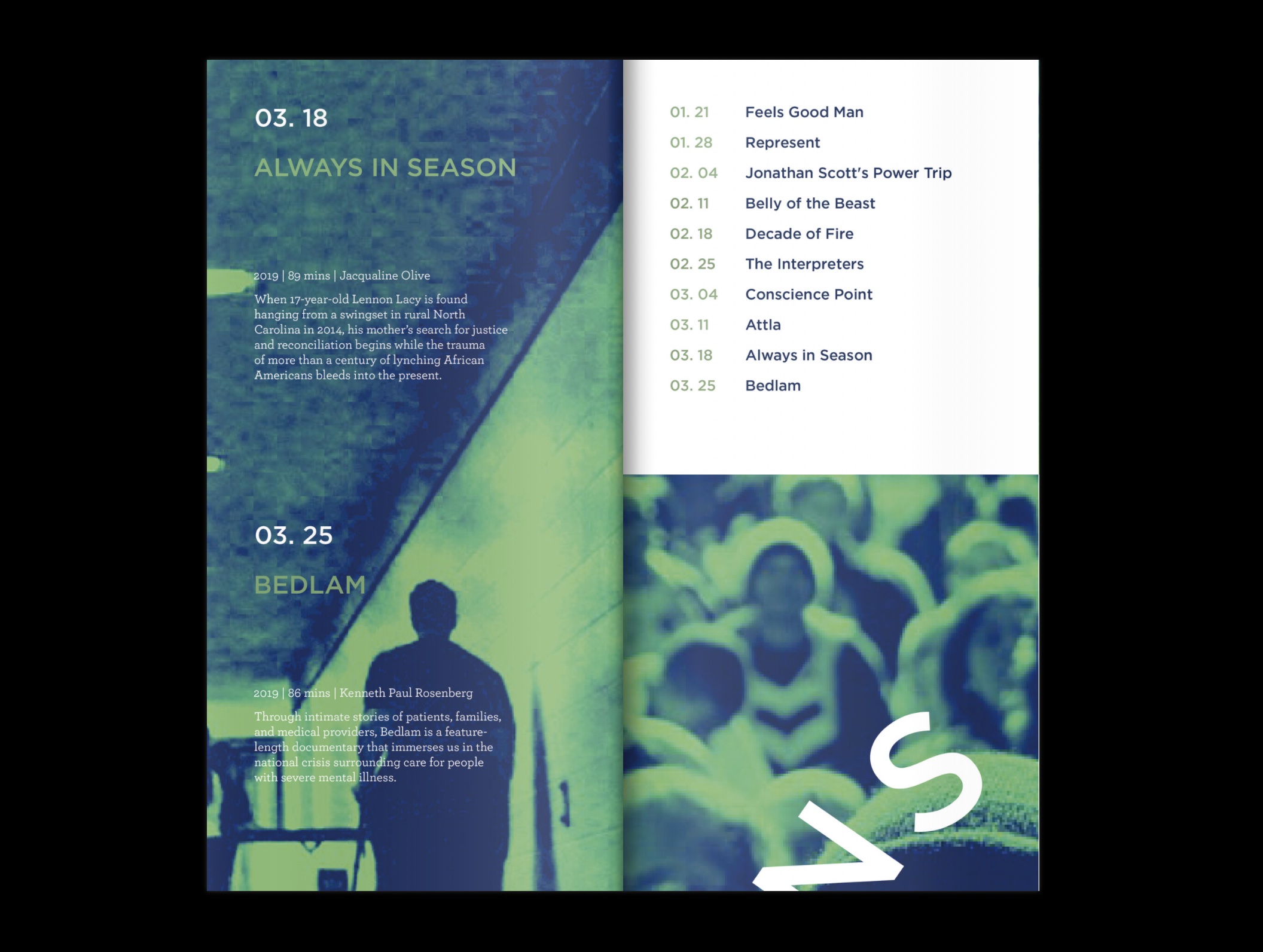 This is a poster that also doubles as a brochure when folded as a french fold style brochure. It contains the dates of movie showings with all the information on times, synopsis, and run times.
