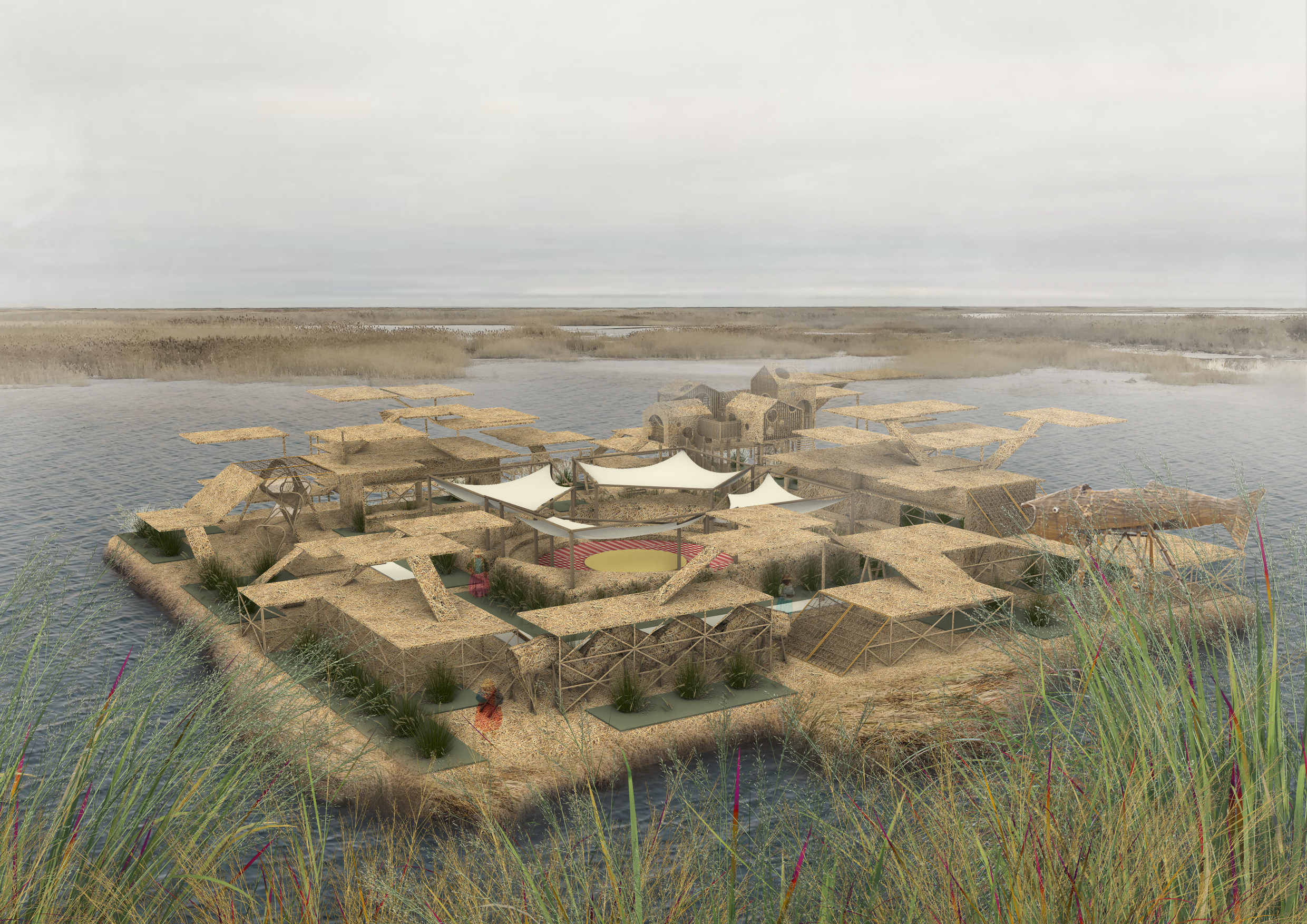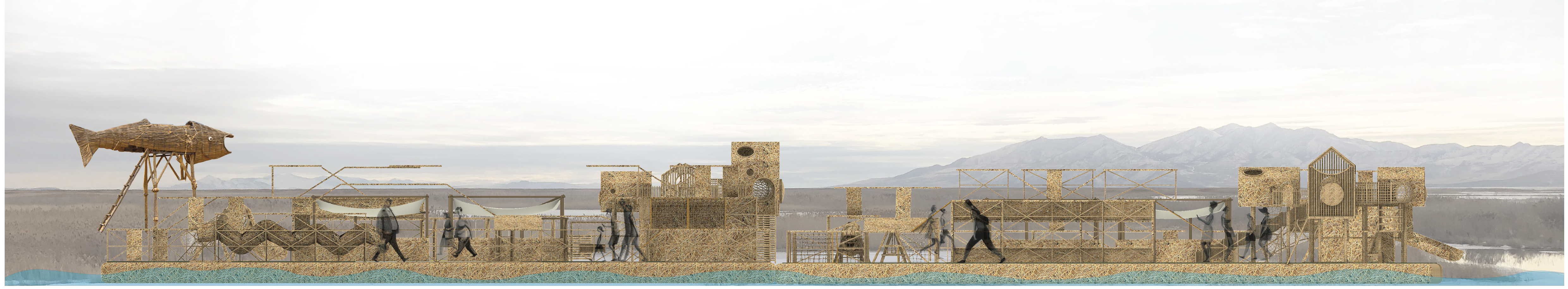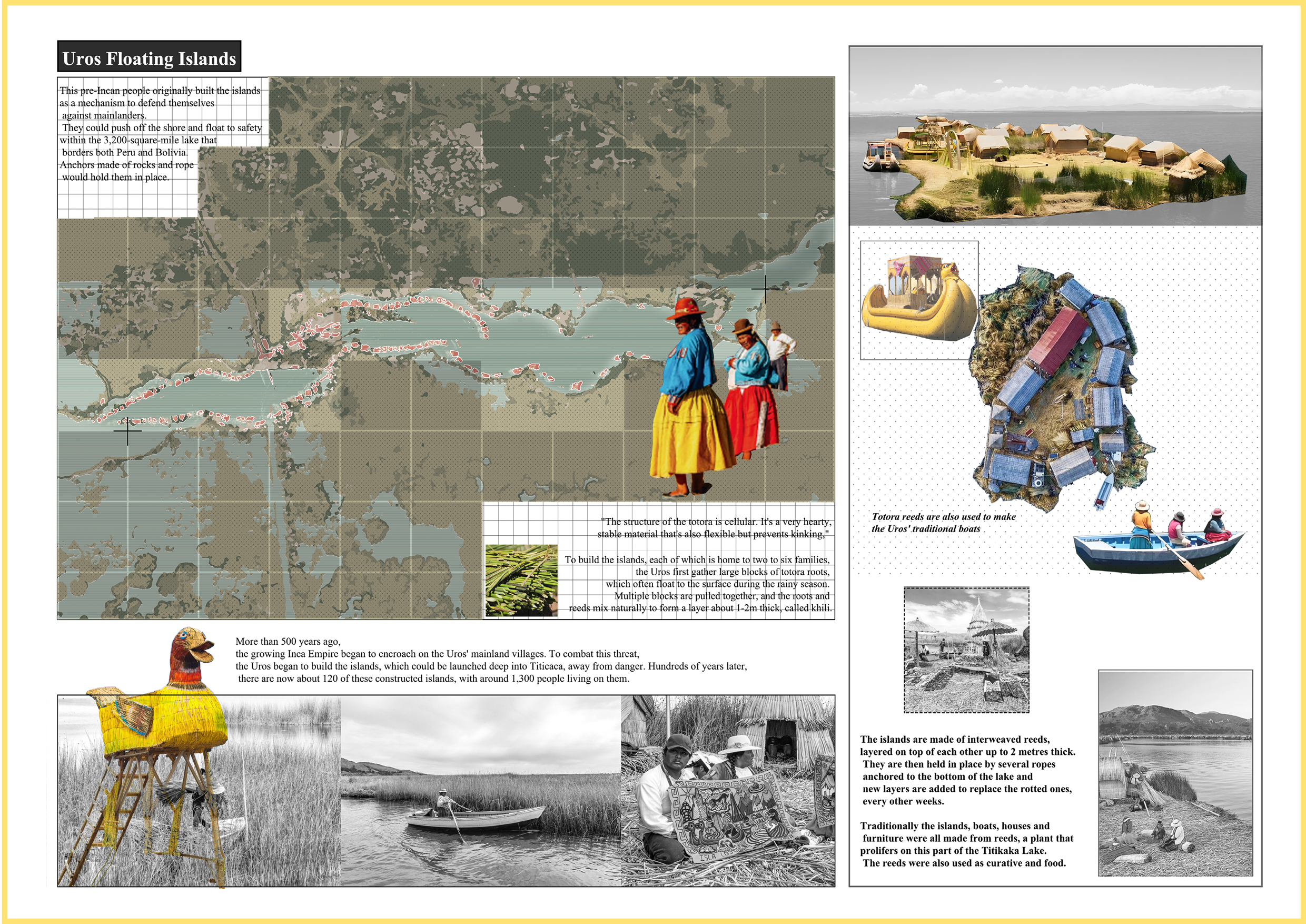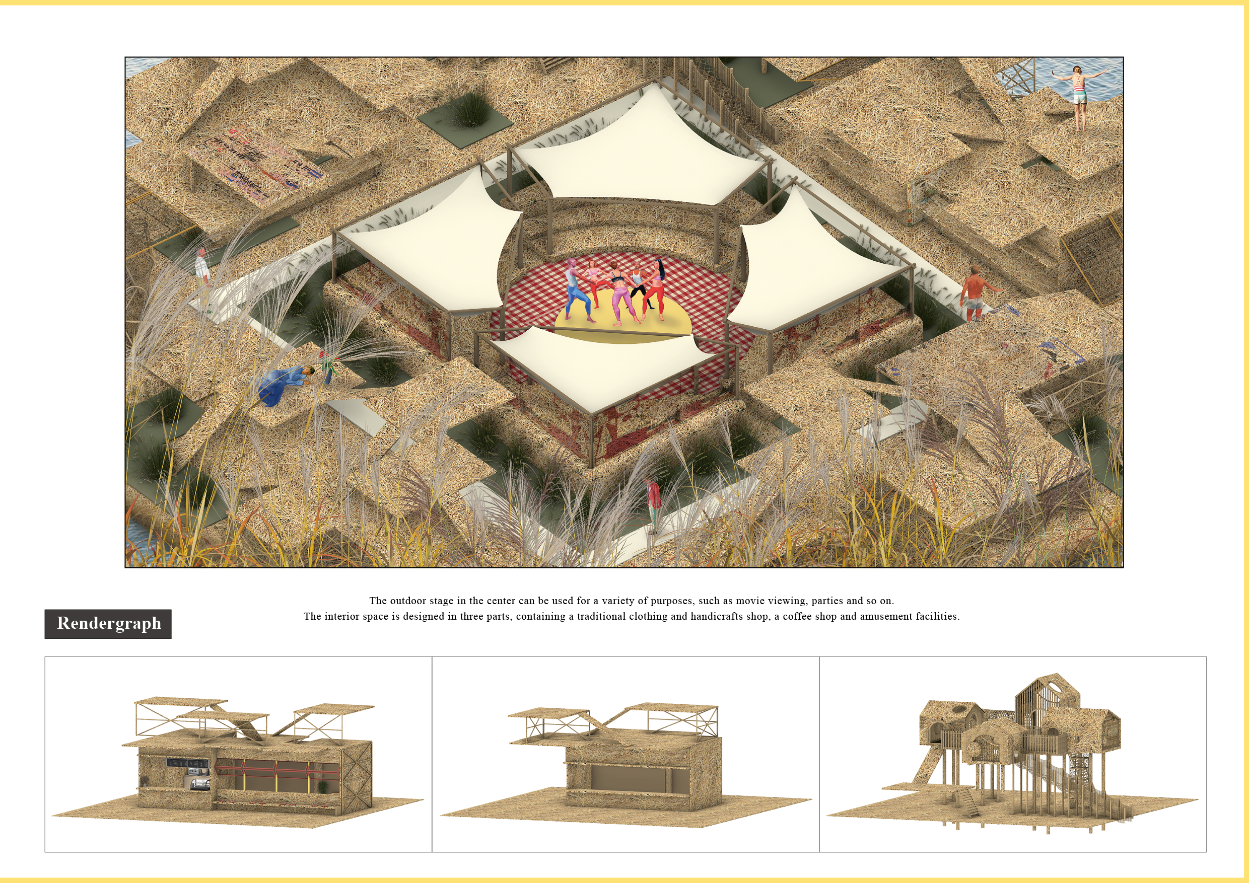 The space site is located in Peru's Titikaka lake. The Uros people weave houses,boats, and handicrafts on the lake from the Lew reed.The project uses native reed grass to create an entertainment and sales park on the lake for a population that is mainly tourists. The space design is mainly divided into two parts: one is a space for sales and games, and the other is a walking path composed of blocks.