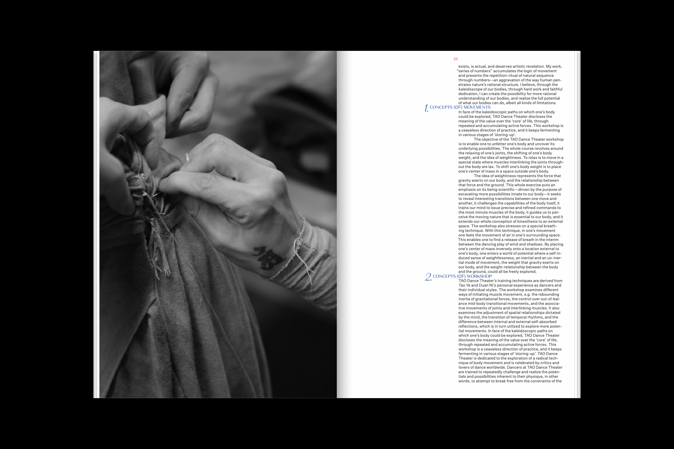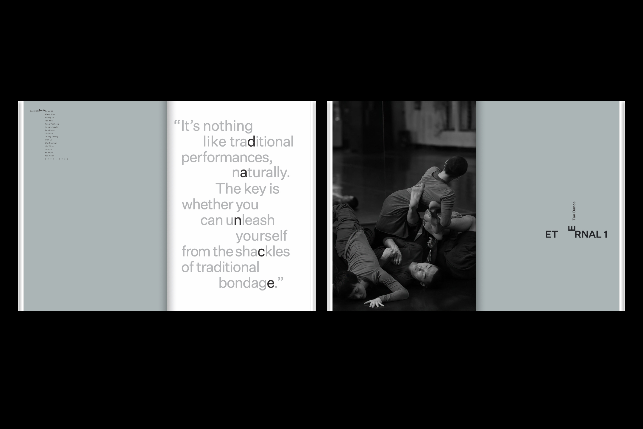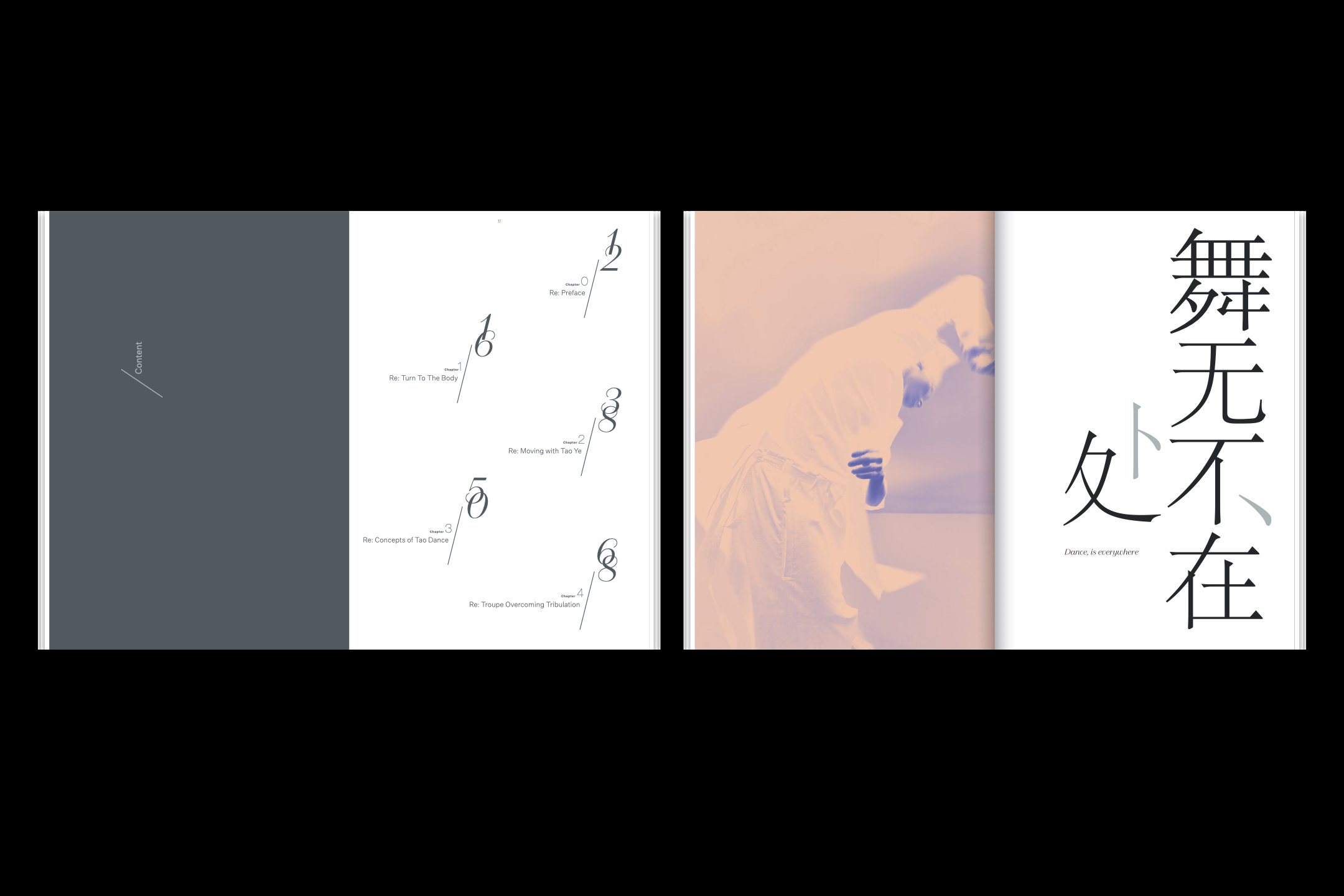 Tao Dance Theater is a Chinese contemporary dance group. It is synonymous with graceful postures and profound emotions. The design of the book was meant to archive and showcase TAO Dance's unconventional style, setting it apart from other contemporary dance pieces that seek interdisciplinarity. By playing with a diverse blend of typefaces, manipulating typographic scale, and experimenting with image treatment, this approach allows people to perceive movement in a typographic manner.