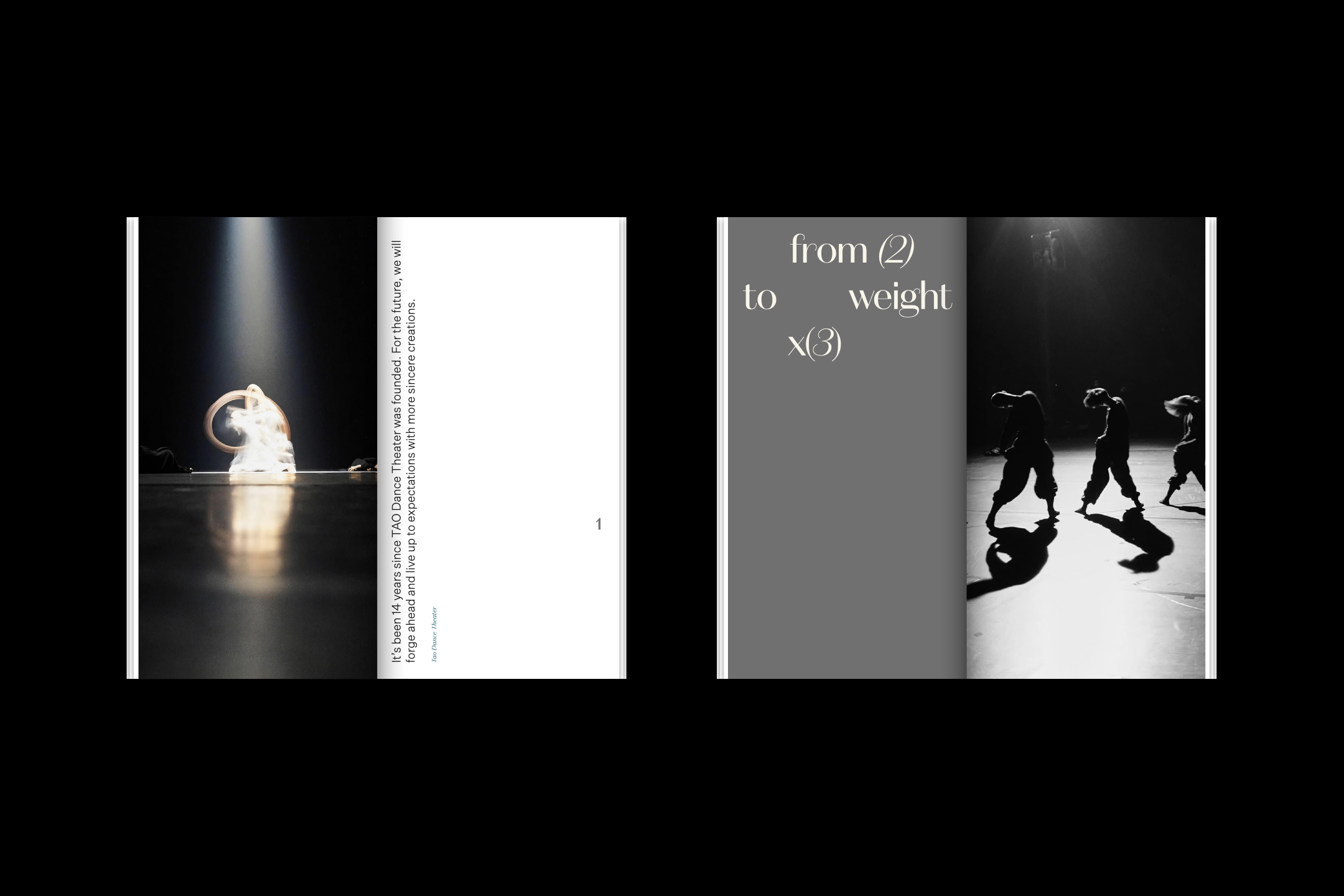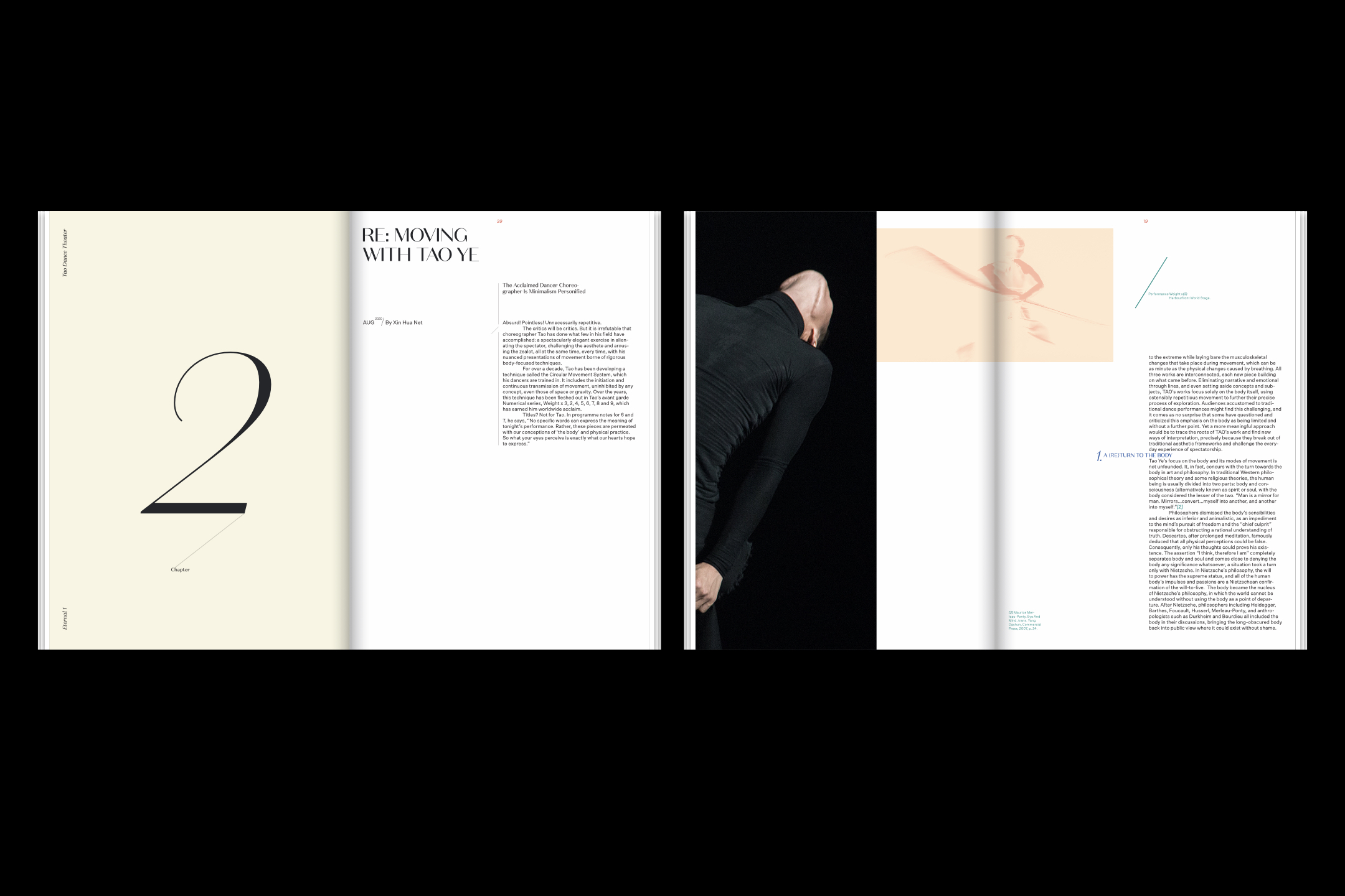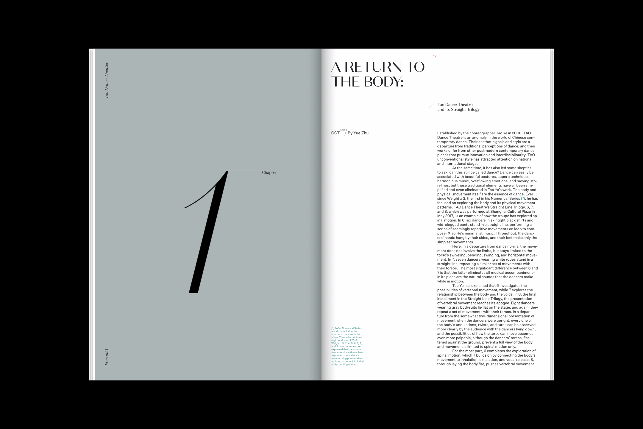 Tao Dance Theater is a Chinese contemporary dance group. It is synonymous with graceful postures and profound emotions. The design of the book was meant to archive and showcase TAO Dance's unconventional style, setting it apart from other contemporary dance pieces that seek interdisciplinarity. By playing with a diverse blend of typefaces, manipulating typographic scale, and experimenting with image treatment, this approach allows people to perceive movement in a typographic manner.