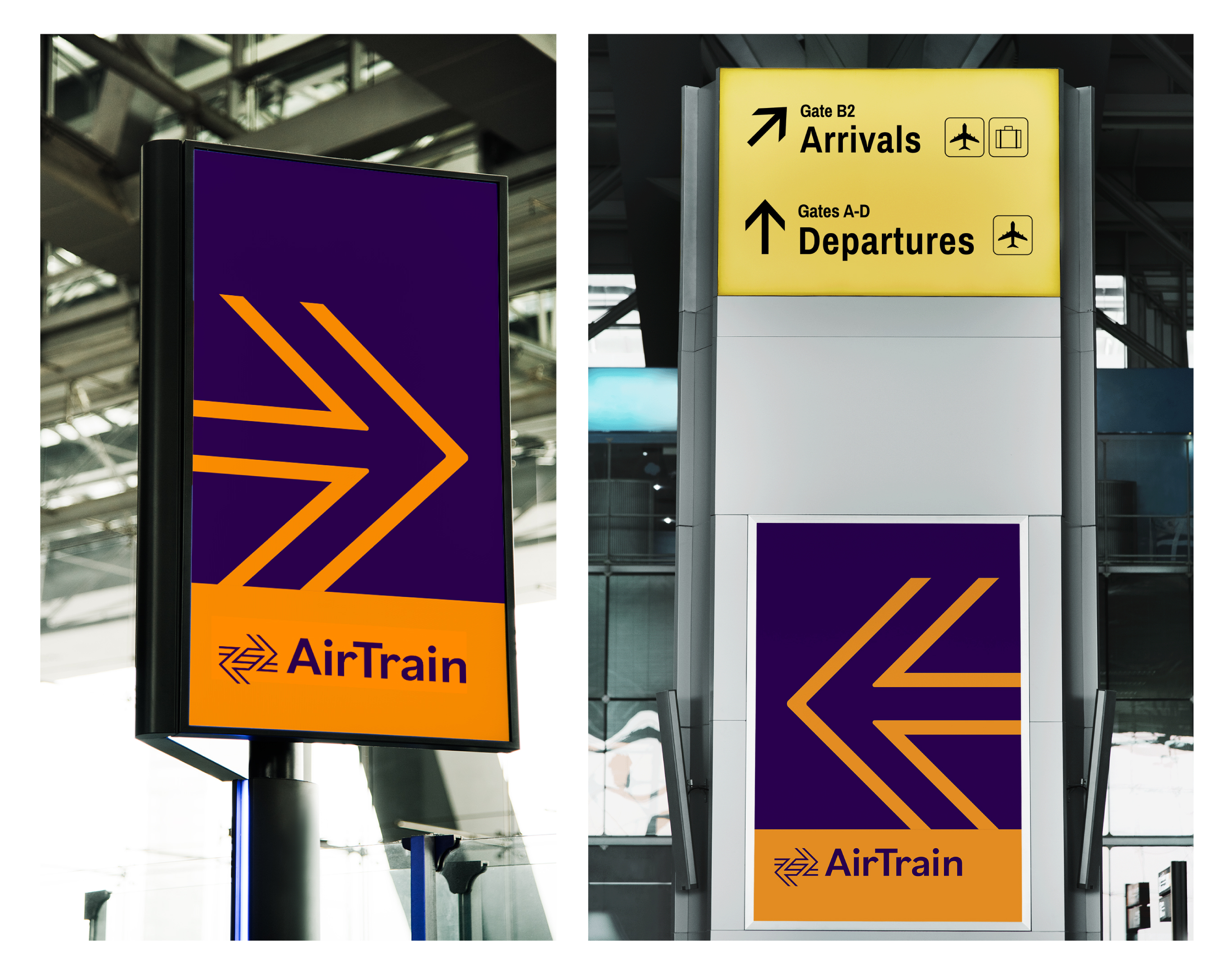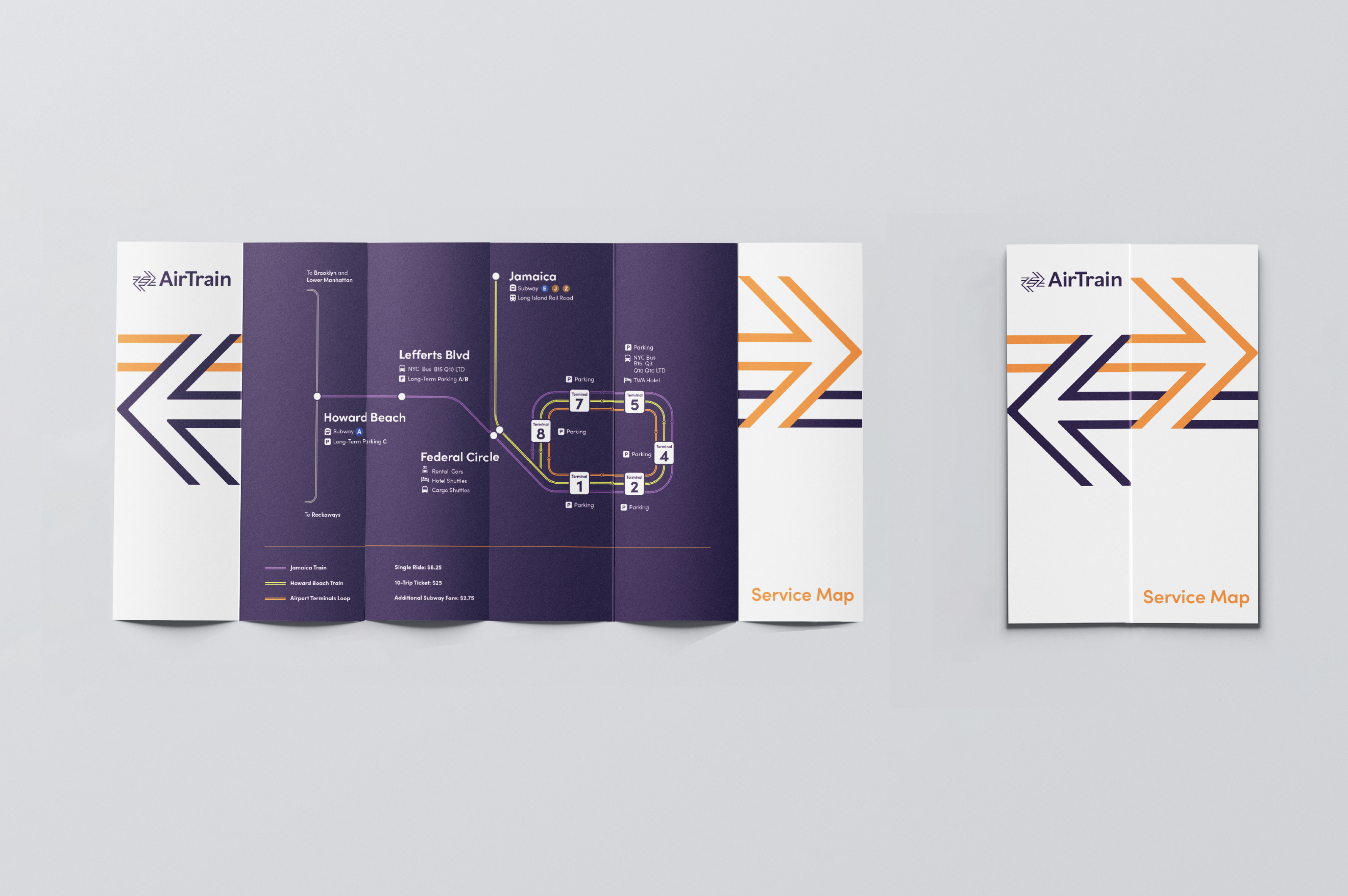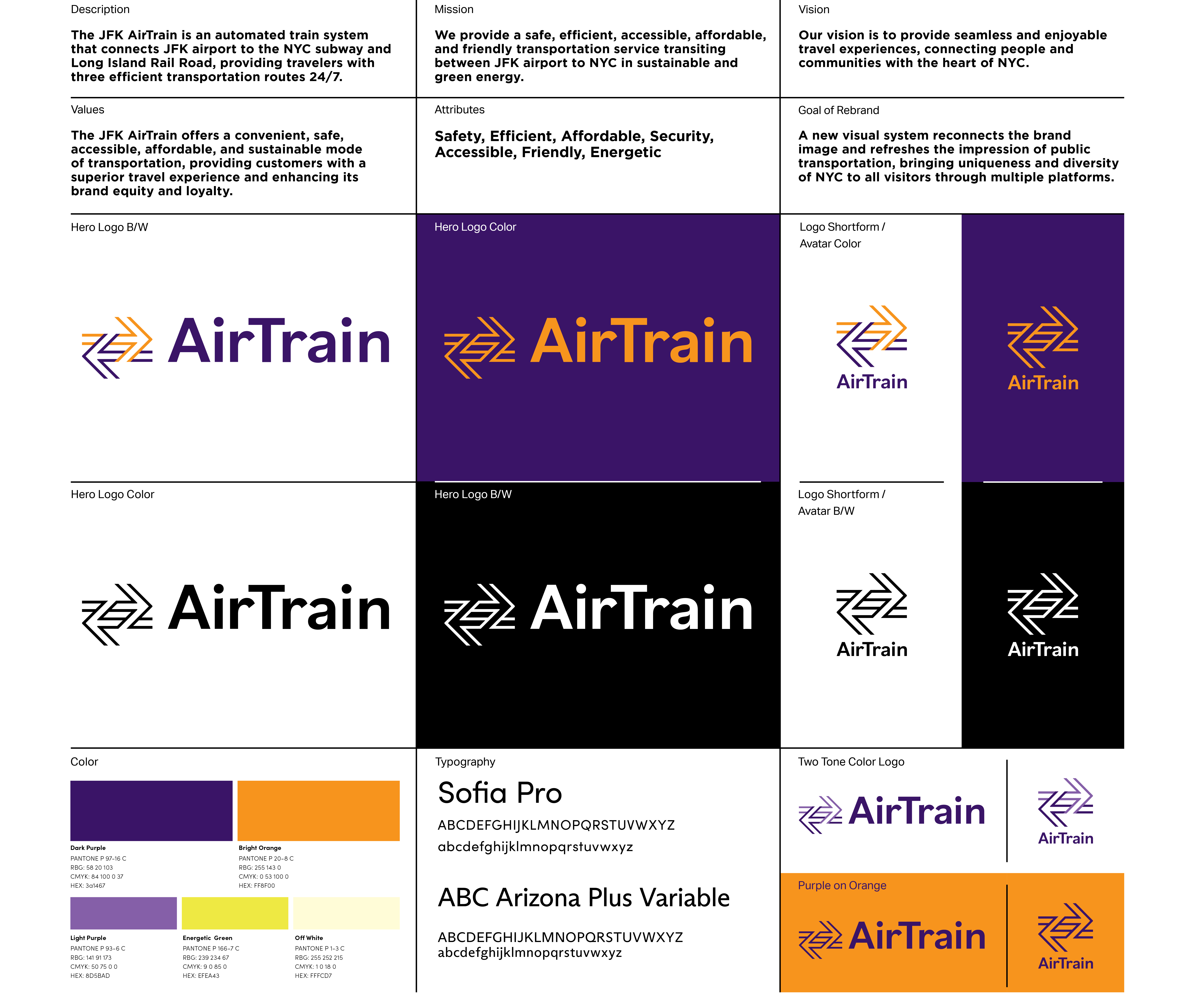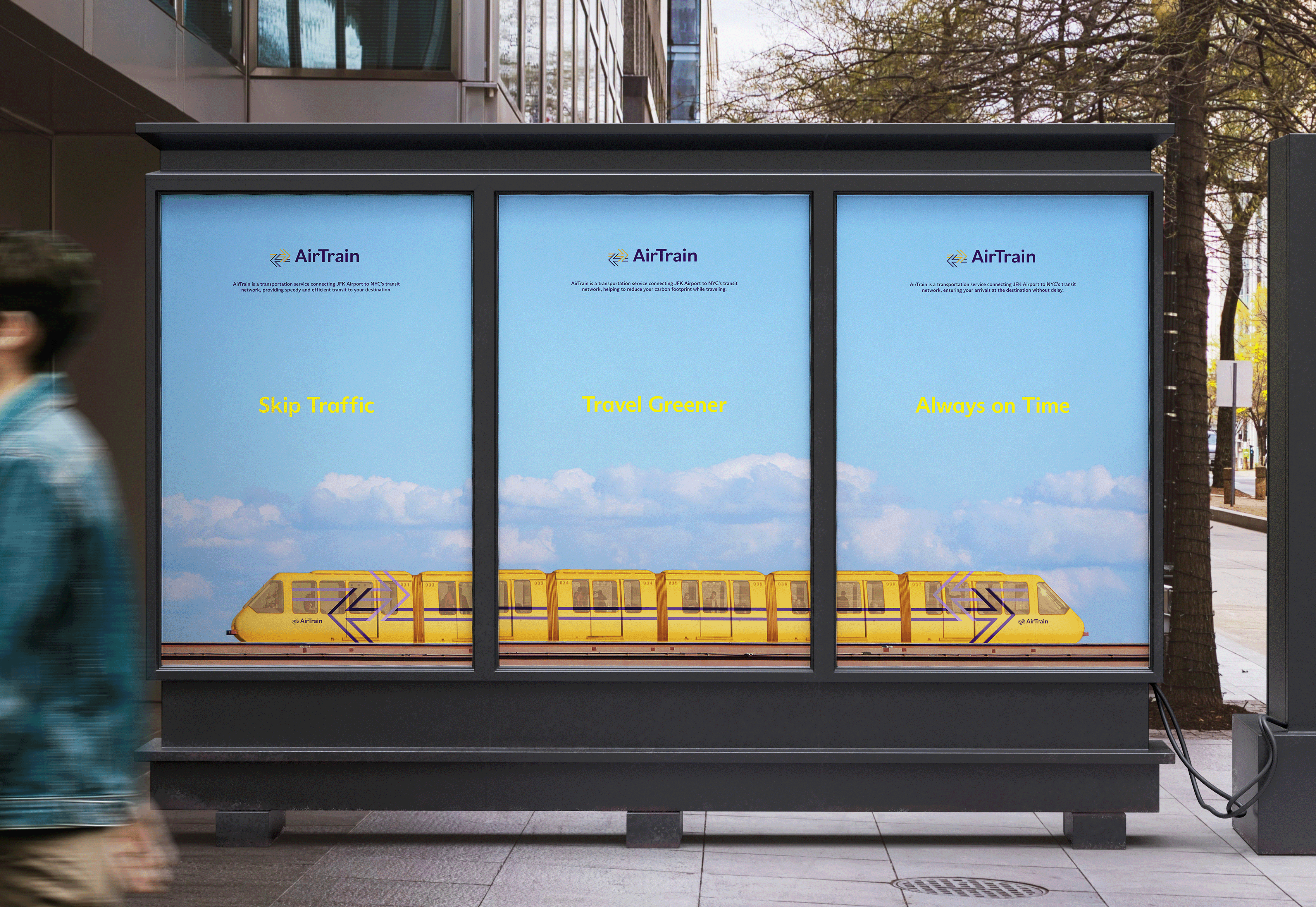The AirTrain is an automated train system that connects JFK Airport to the NYC Subway and Long Island Rail Road 24/7. A new visual system reconnects the brand image and refreshes the impression of public transportation, bringing uniqueness and diversity of NYC to all visitors through multiple platforms.