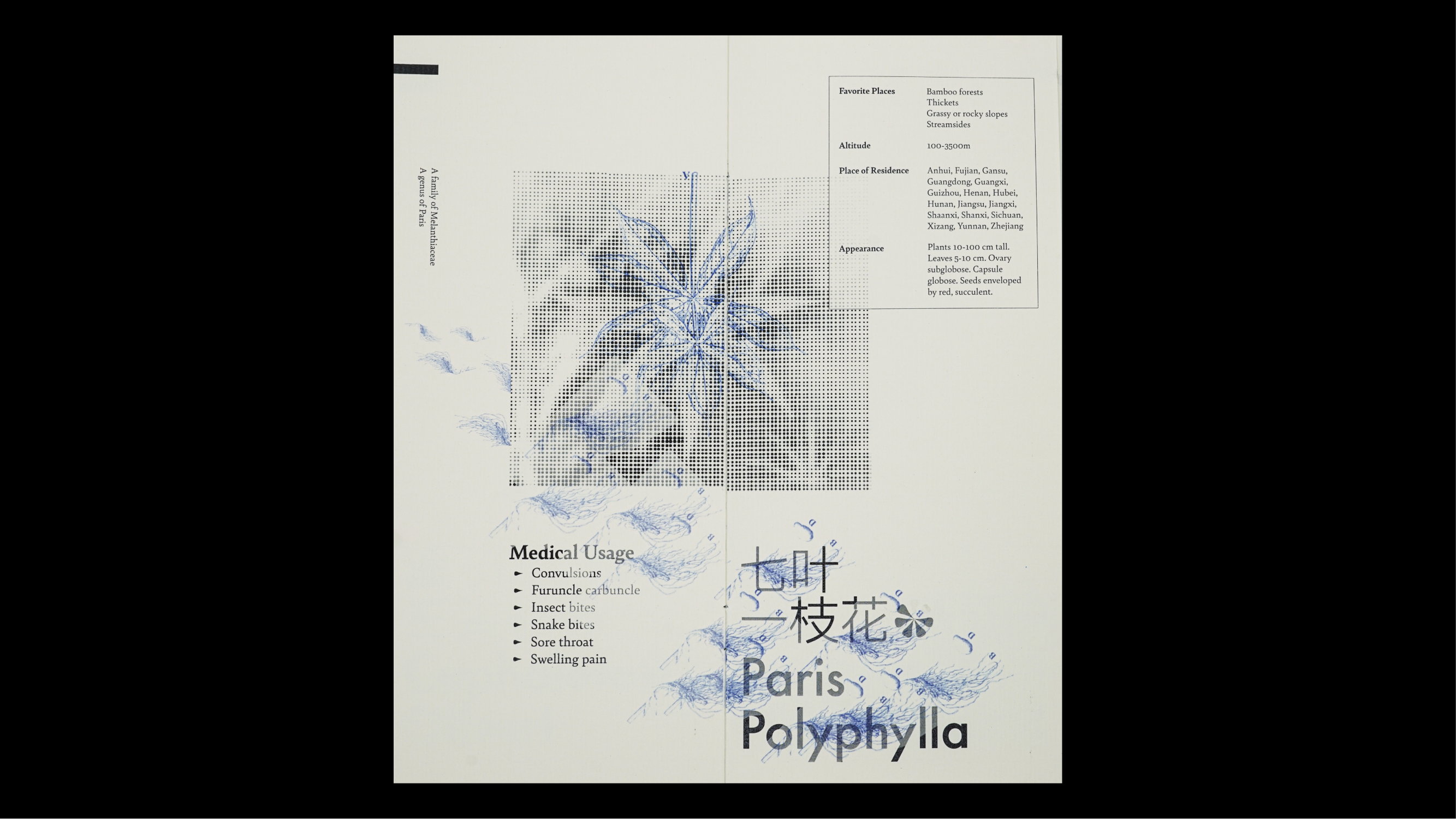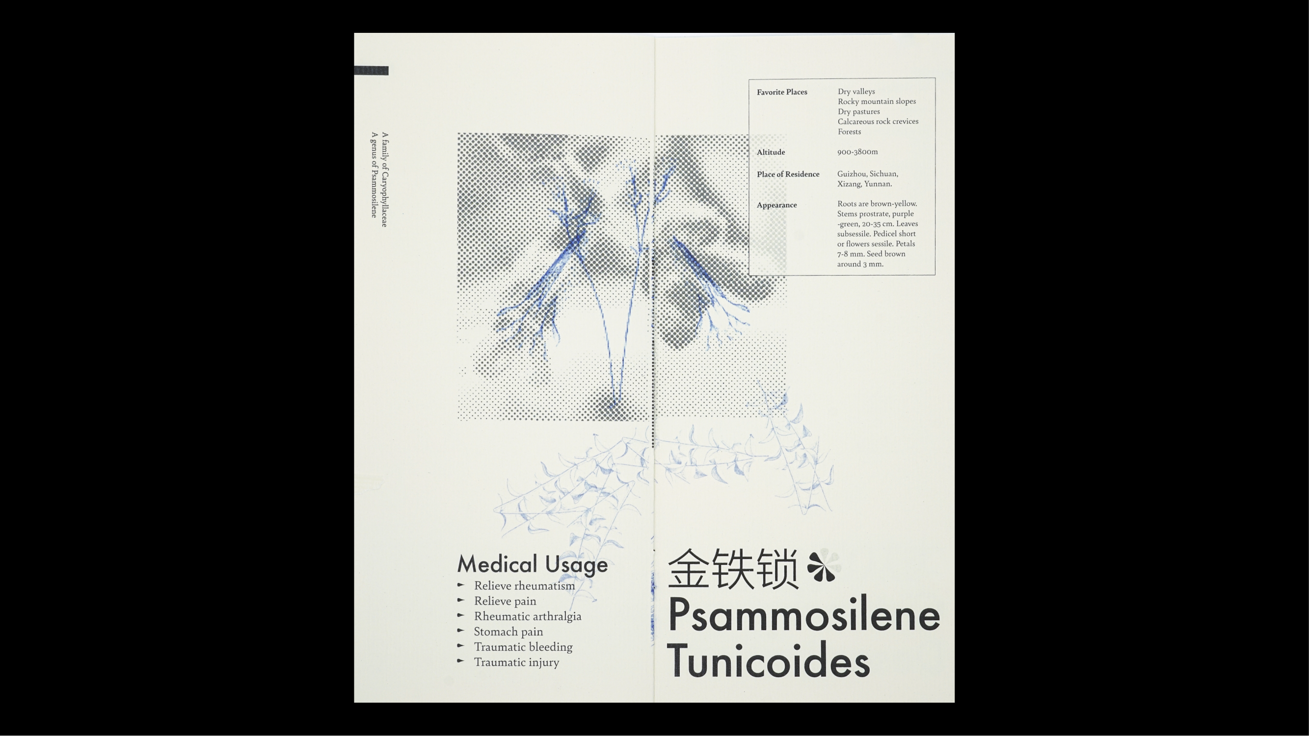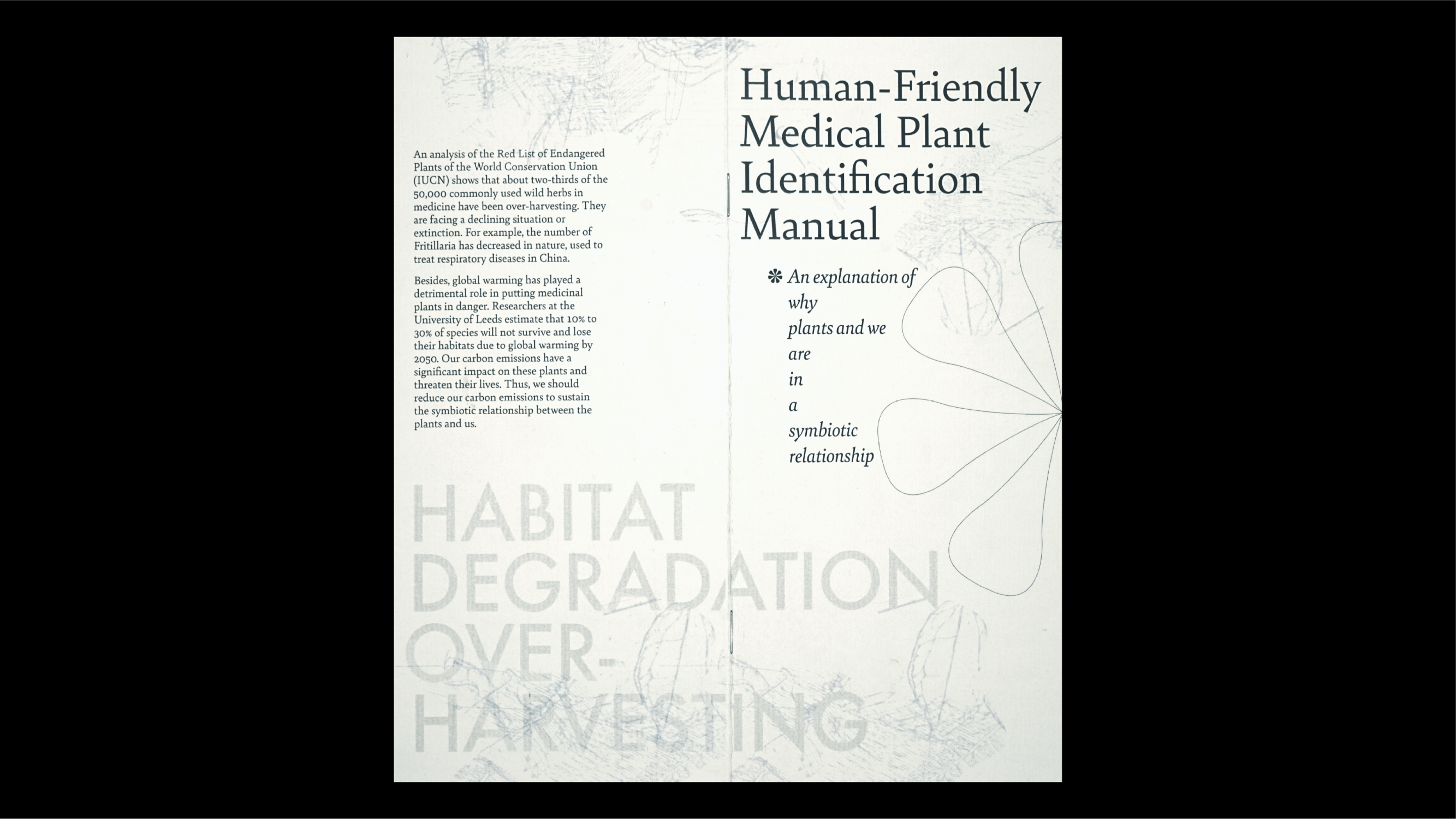 The brochure was designed as an audience brochure for one of my video projects about environmental concerns and issues in my hometown. This brochure introduces six endangered medical plants in China that are highly related to our daily lives, and attempts to build a symbiotic connection between plants and humans.