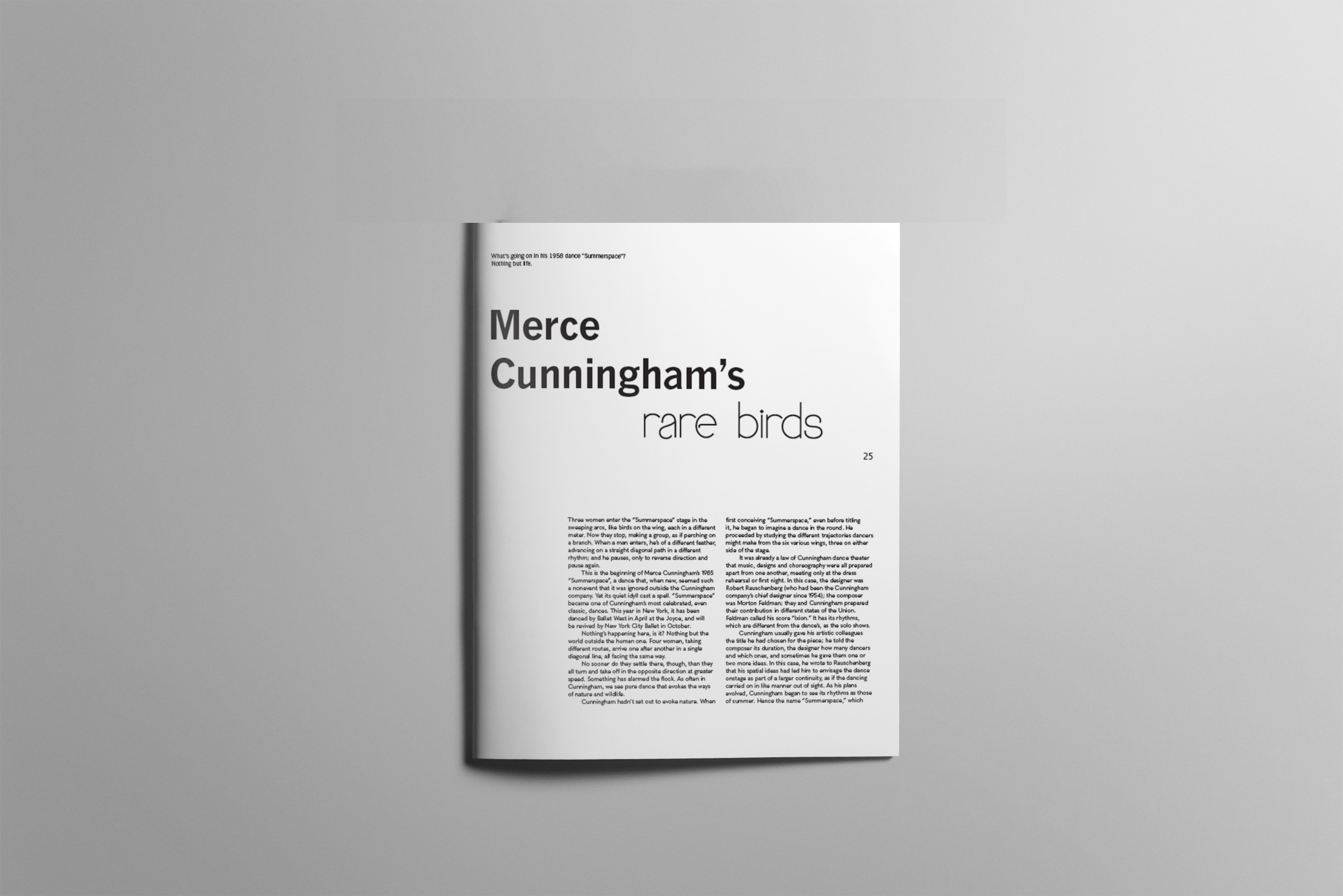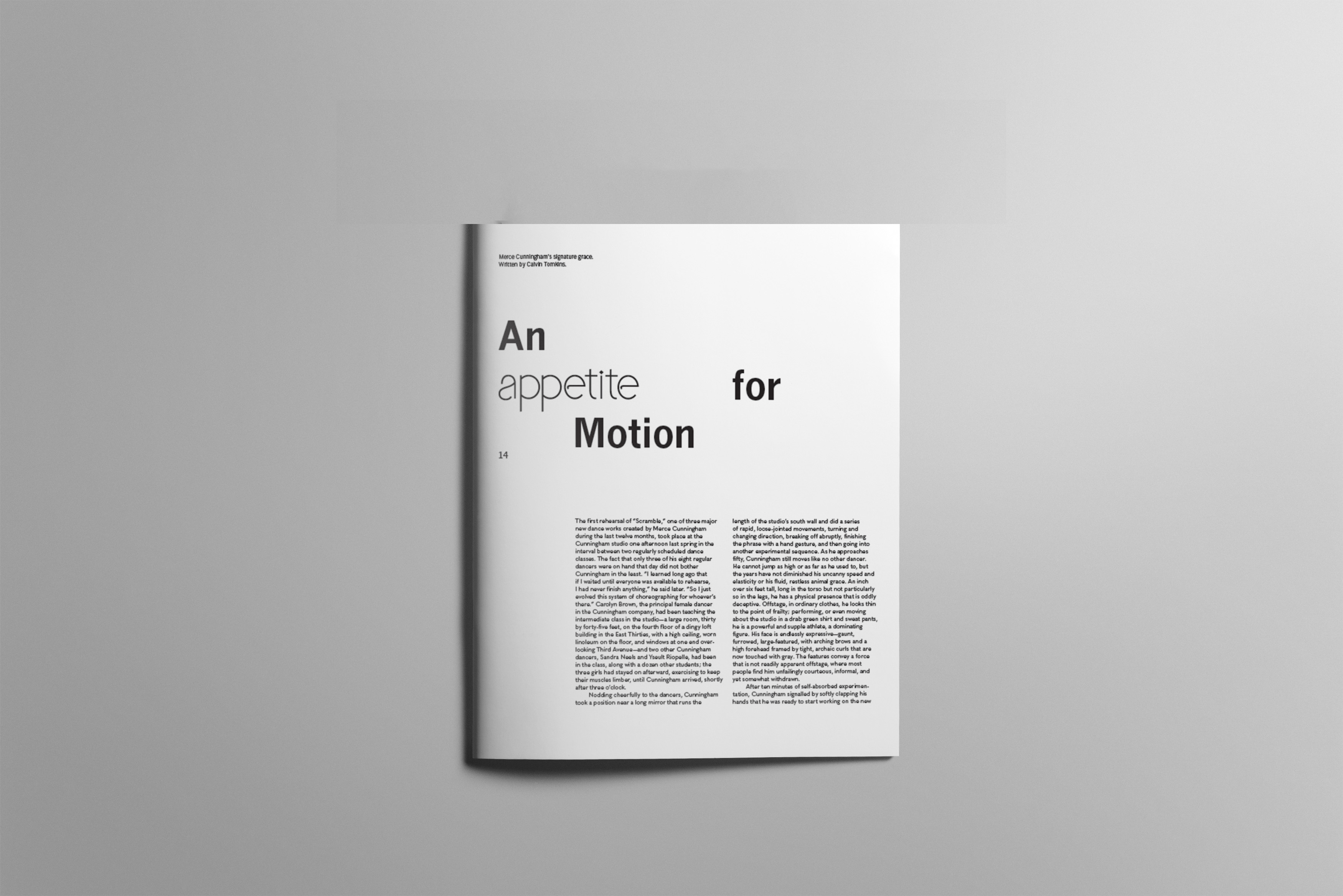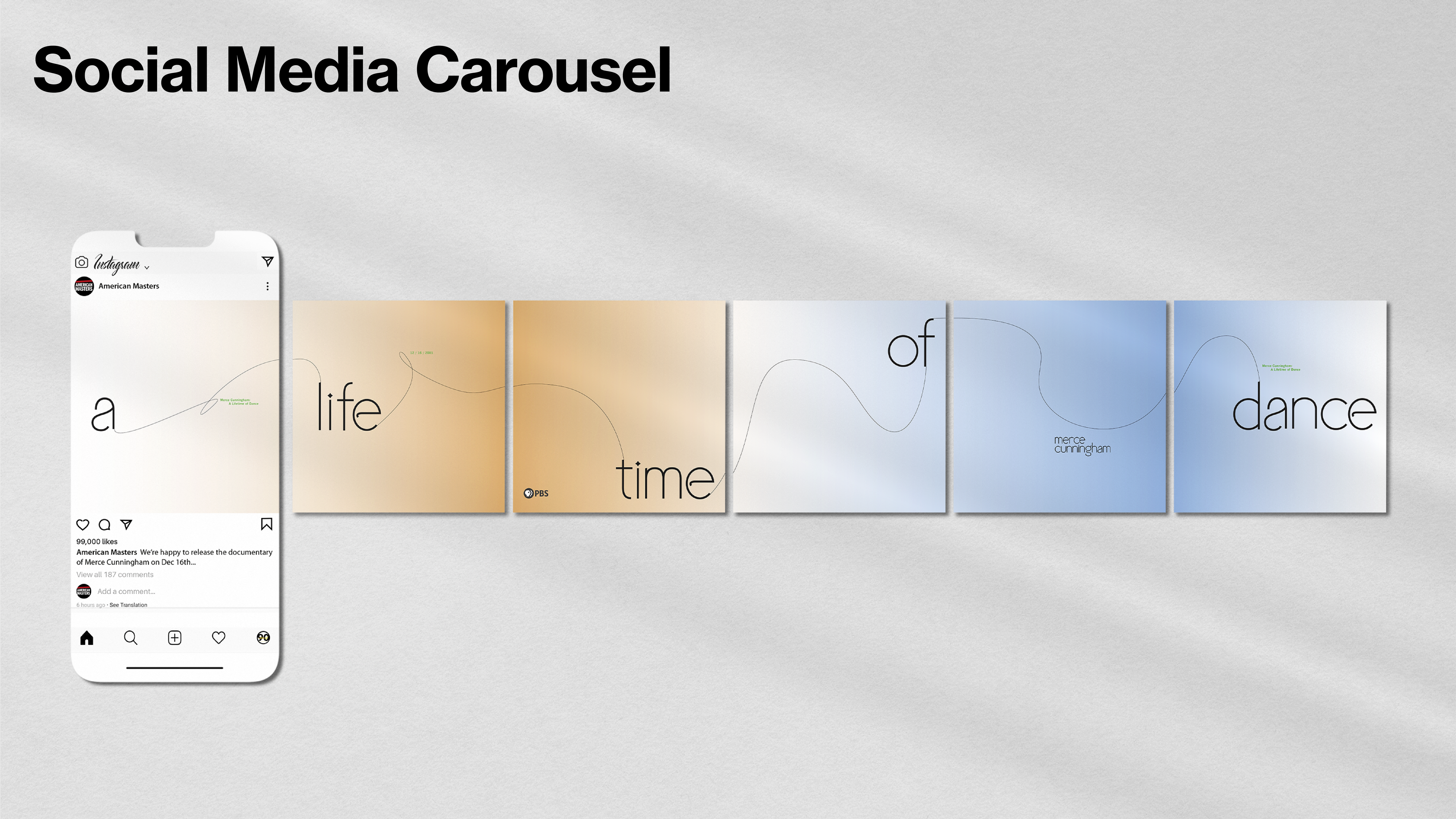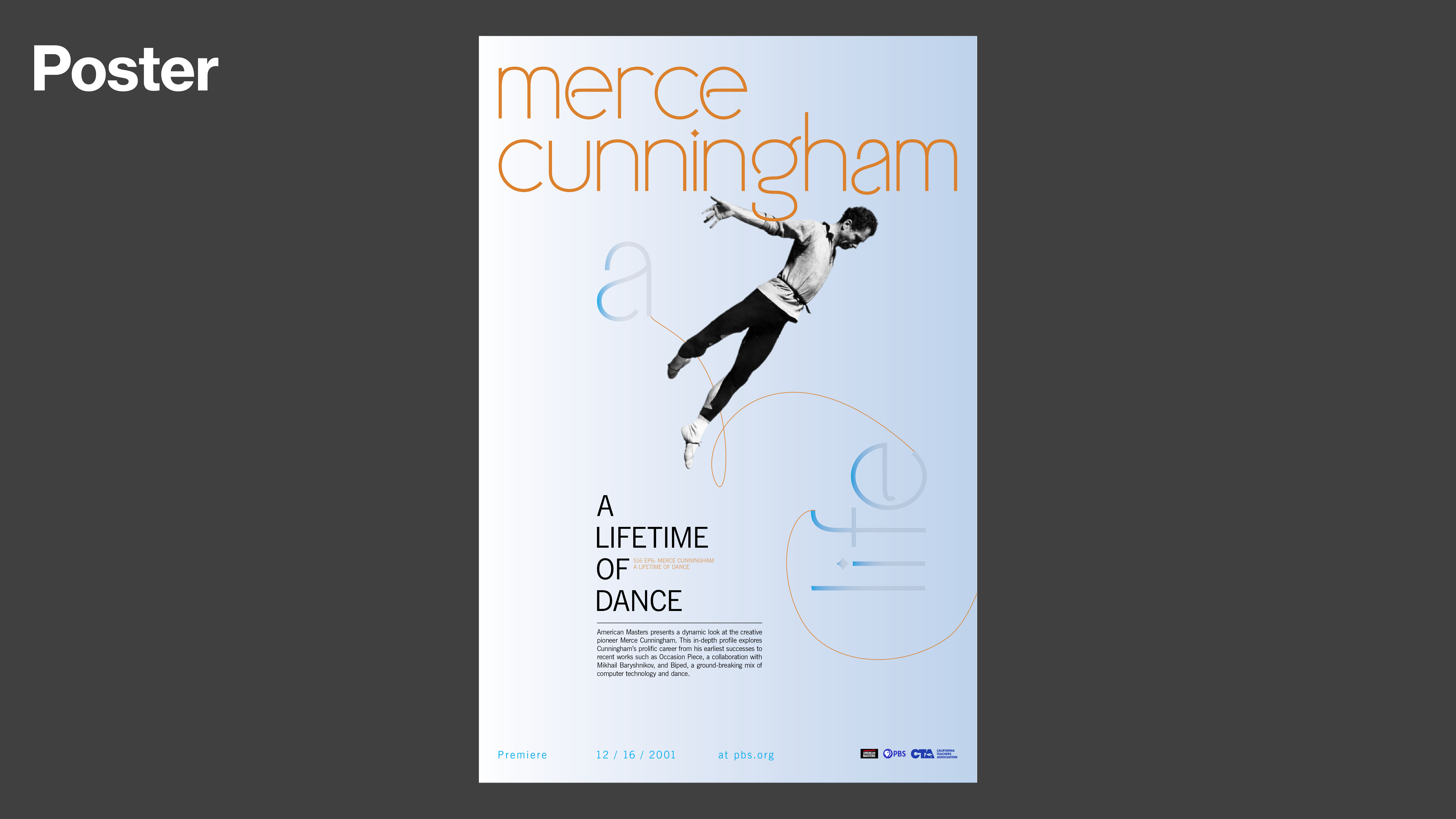 The assignment is to design a wordmark for one of the PBS American Masters documentary episodes, Merce Cunningham’s documentary A Lifetime of Dance. The audience is the ones who watch the documentary and are interested in cultural history. Merce Cunningham is a unique dancer in that movement itself is the principal subject matter of his dance, and the structure is not determined by narrative or musical form. Therefore, the desired result of the wordmark is his movements.
