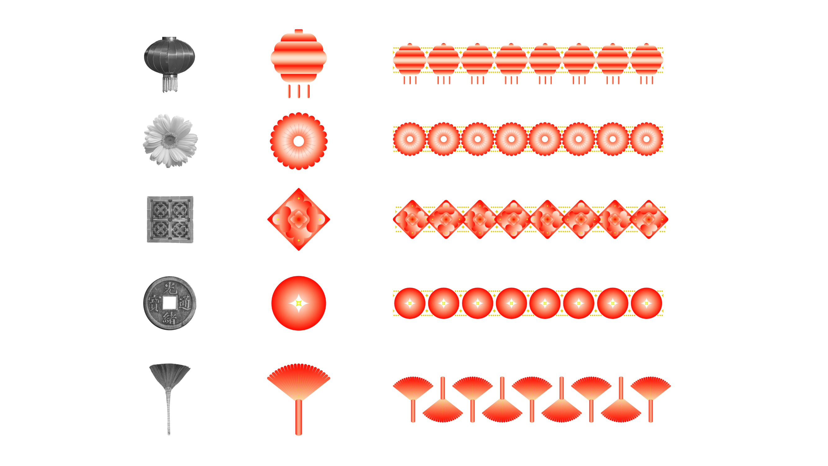 I extract elements from the traditional Chinese New Year celebration scenes, including lanterns, brooms, chrysanthemums, window patterns, and lucky coins.