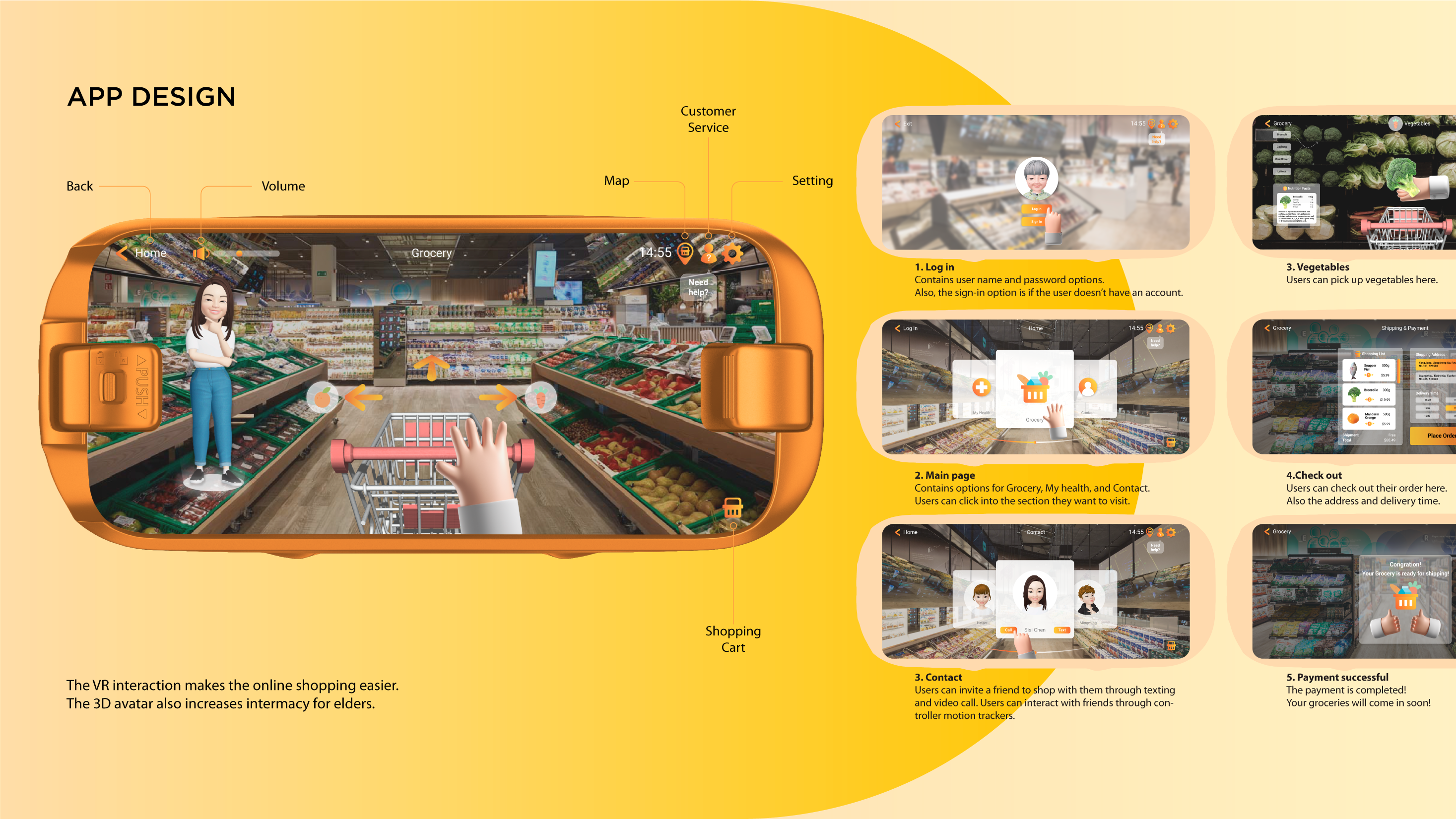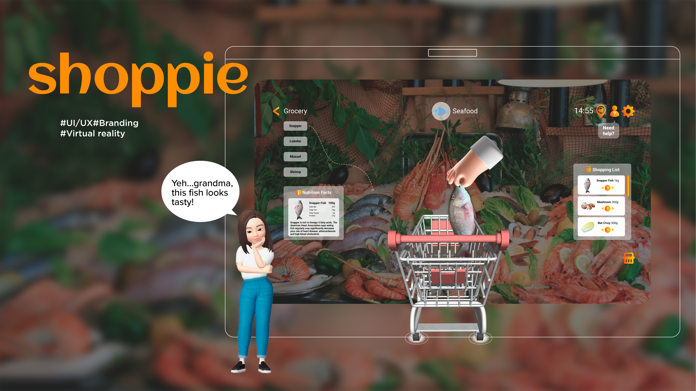 Shoppie is an online grocery shop application on a VR platform. The target customers of Shoppie are elders who live alone and are inconvenient to shop in the grocery store. Besides giving an easy shopping experience, Shoppie also helps build a closer relationship with friends and family members through VR interaction. Our VR grocery shop application tends to help elders to live better, eat healthier and feel better.