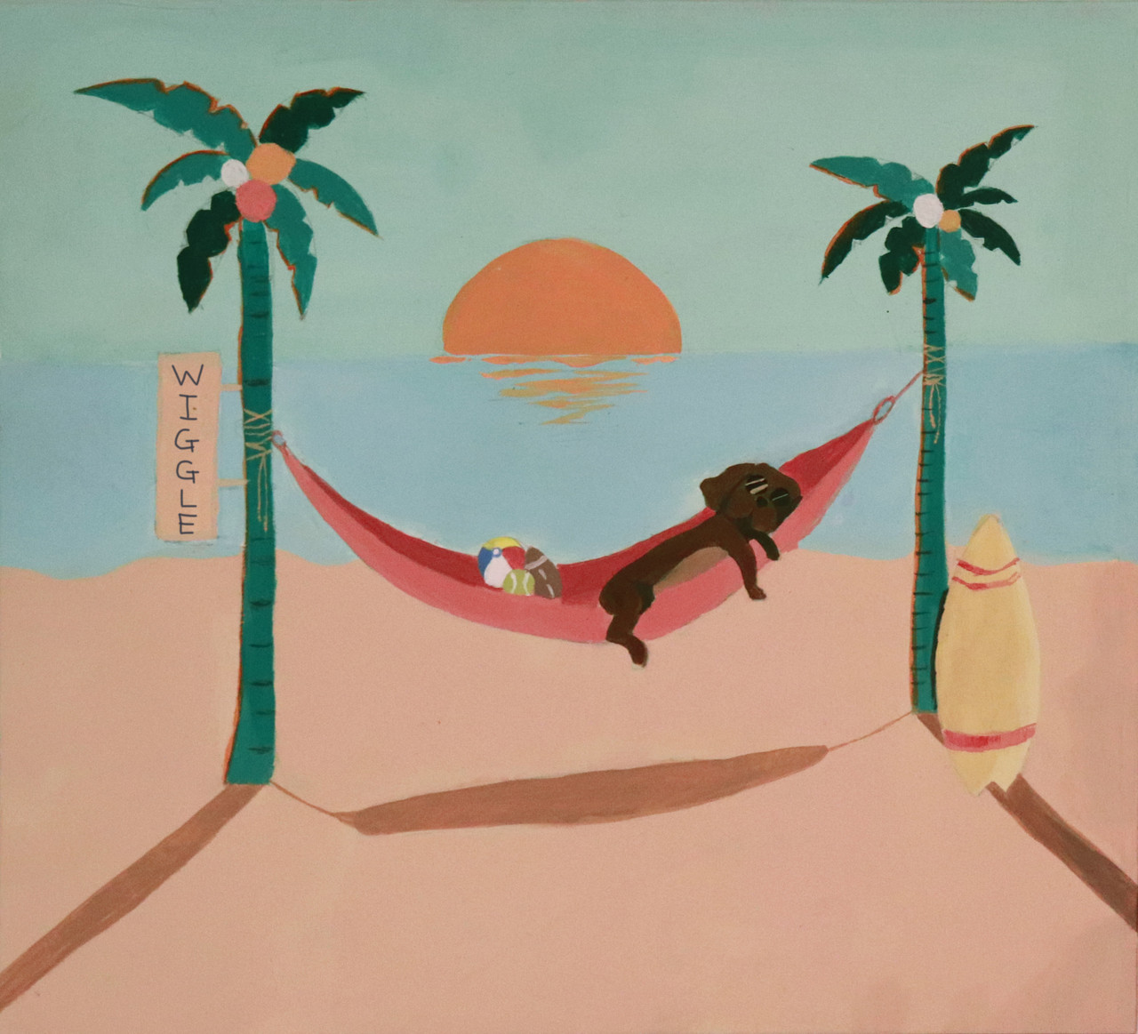 "Pawradise" Acrylic paint, 15x15, 2019 Made as an inspirational image for my project Wiggle hoping that it could make the pet hotel as a vacation destination to dogs like this.