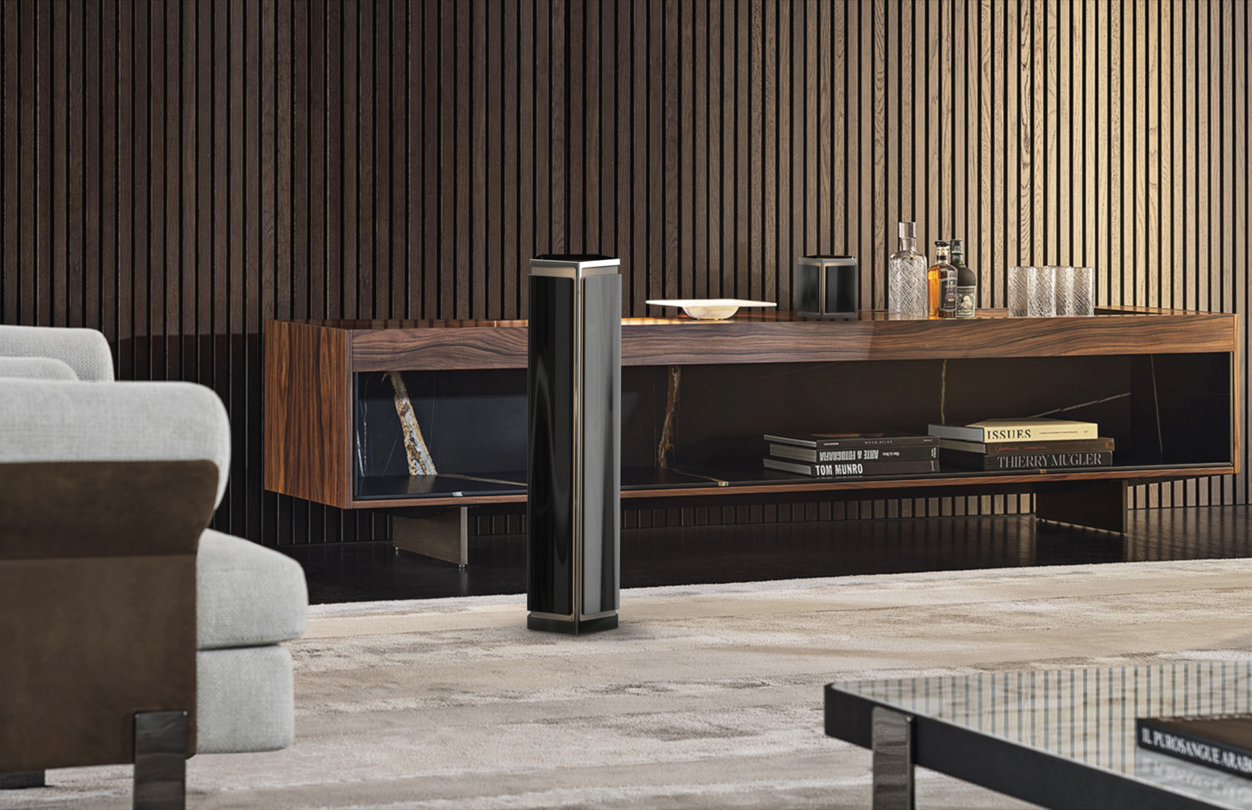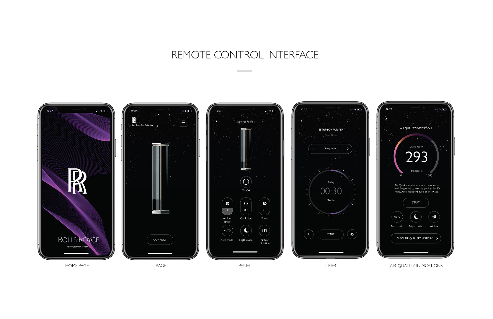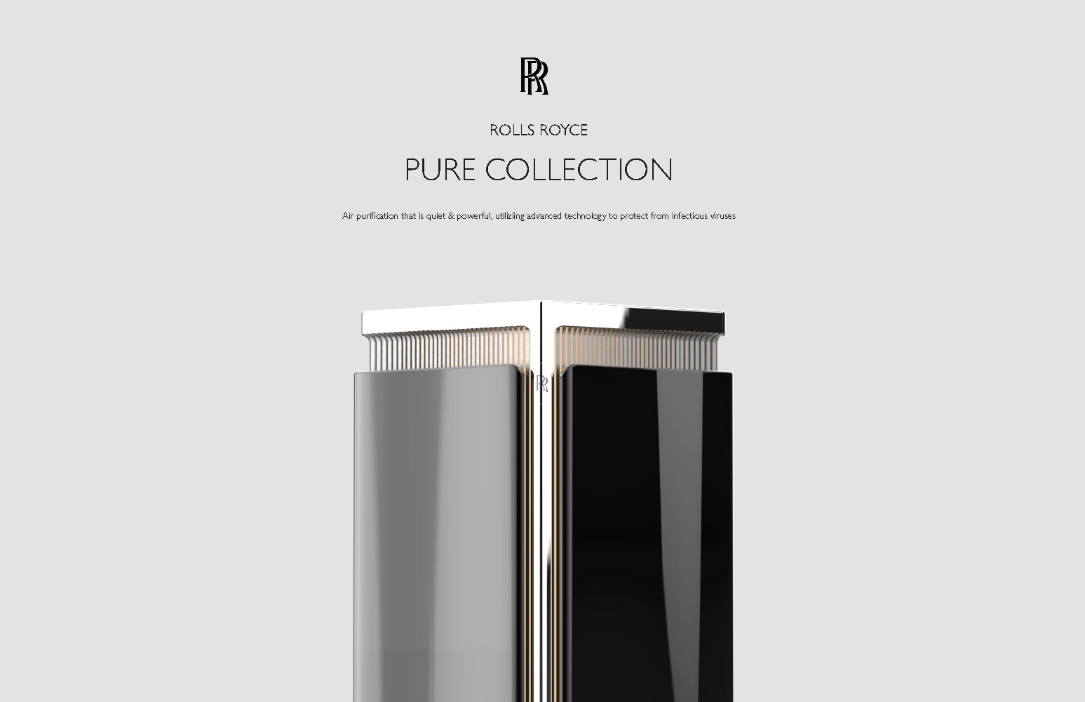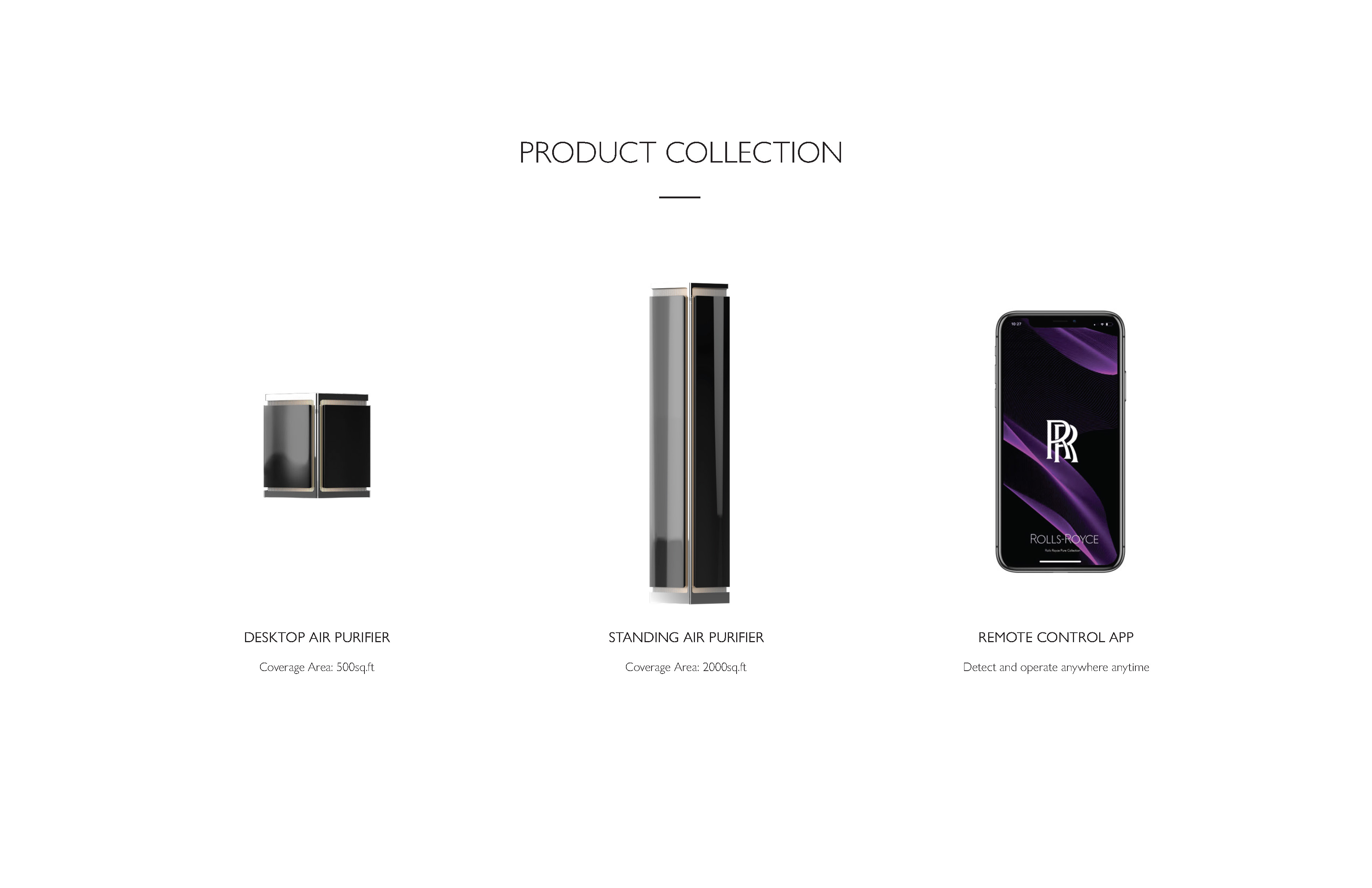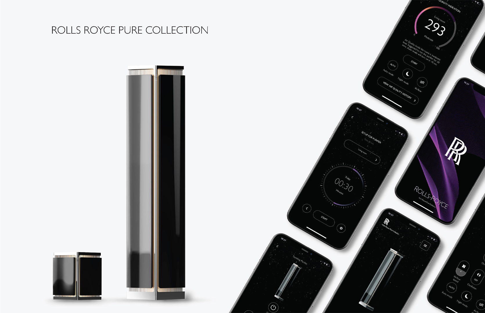 A sophisticated air purifier set inspired by Rolls-Royce design, bringing luxury from car to home. It features quiet, cutting-edge technology for virus protection, with a desktop and freestanding purifier, plus a remote control app.