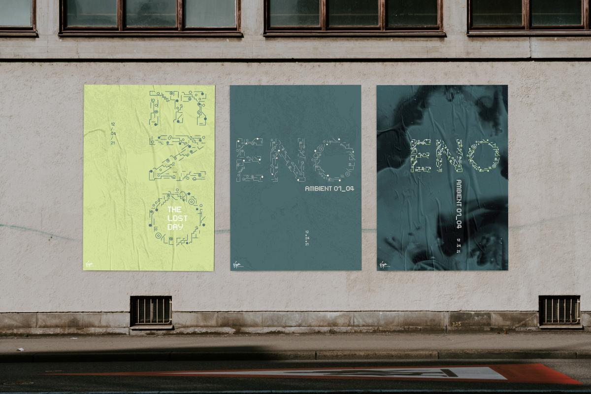 This Graduate Typography One class project involved redesigning Brian Eno's Ambient 1 through Ambient 4 albums into a single compilation. Eno's name was crafted from the synthesizer notes used in the albums, connecting the typography to the music. A muted color palette was chosen to capture the albums' softness and ambience, while a pattern evoking peacefulness and tranquility was created. The redesign aimed to refresh the visual identity and encapsulate the essence of Eno's ambient soundscapes.