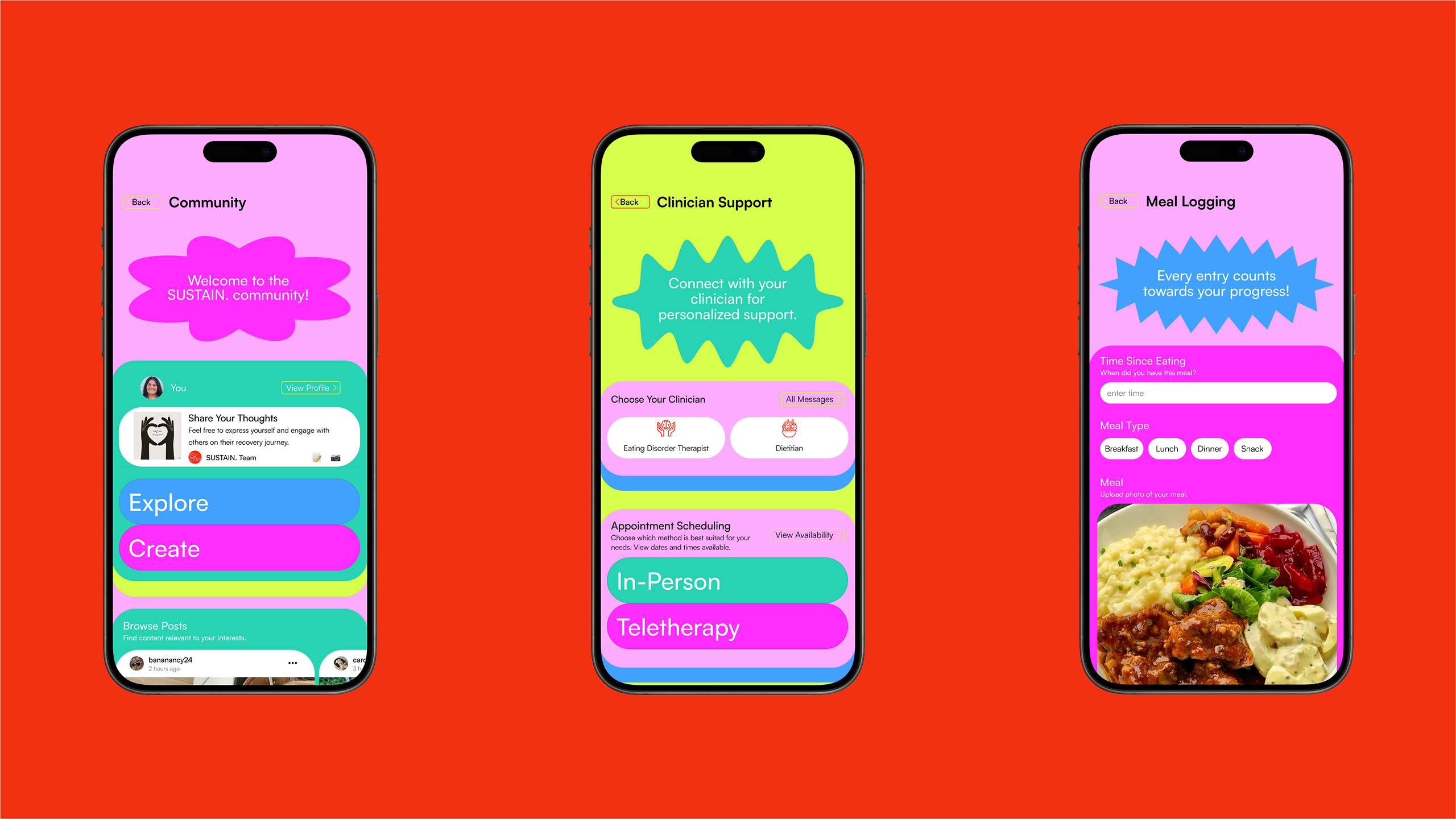 SUSTAIN. is an innovative eating disorder recovery app that offers tools for recovery: therapist support, community connection, progress tracking, and self-care activities. Developed through extensive research and user feedback, SUSTAIN. integrates evidence-based practices with modern design principles to ensure accessibility and effectiveness in addressing stigma and promoting the importance of joyful and essential aspects of life through eating.