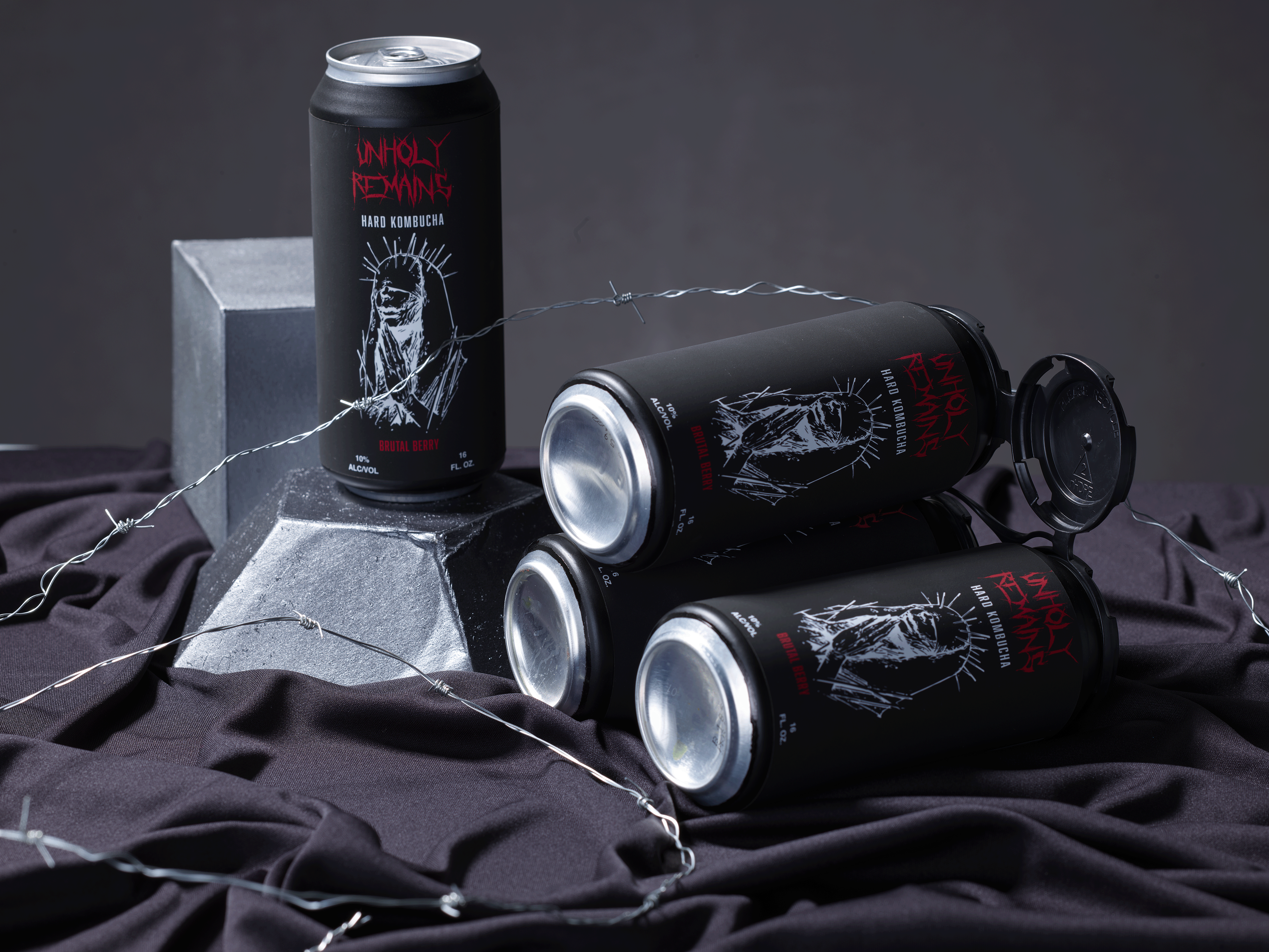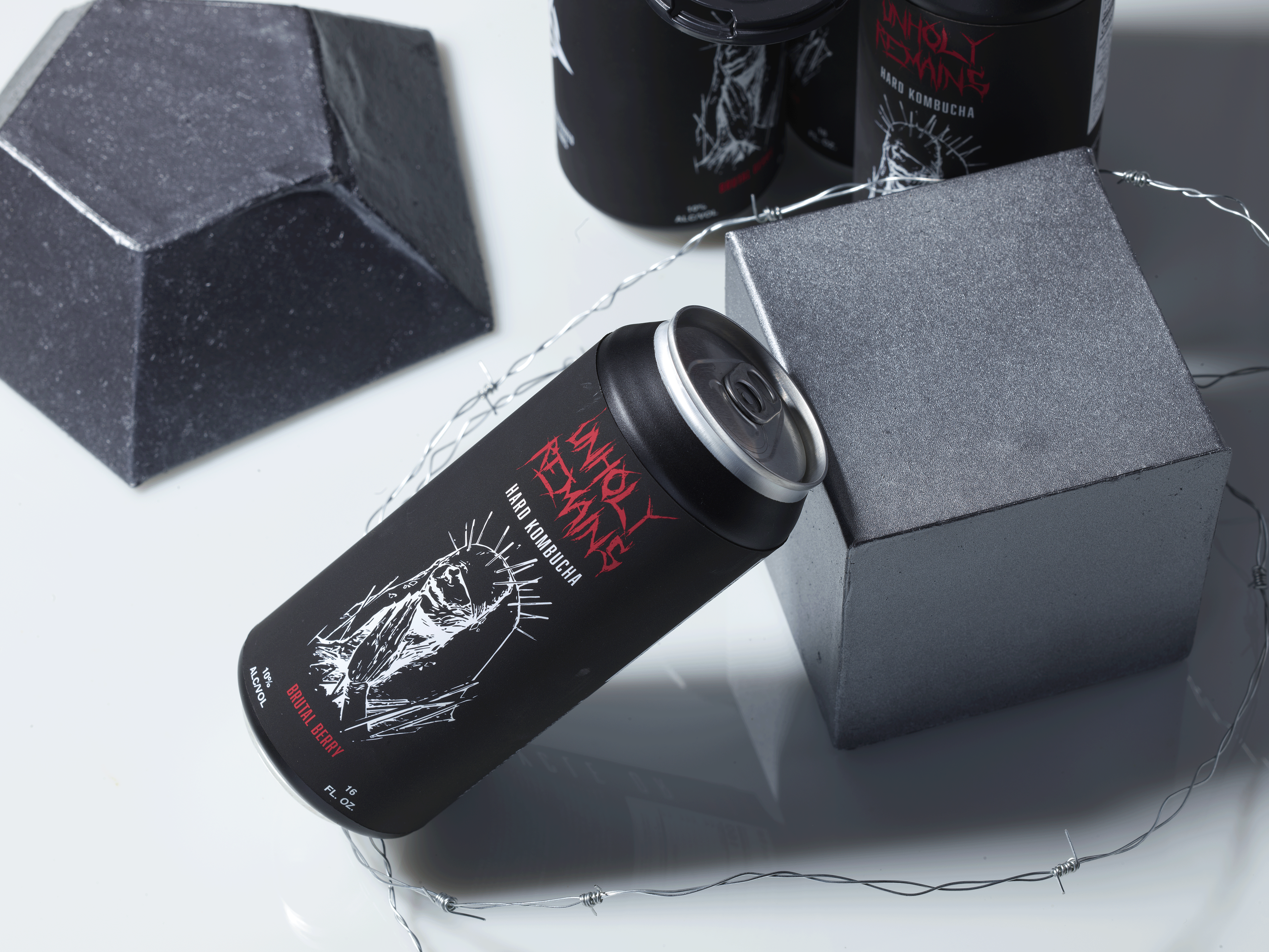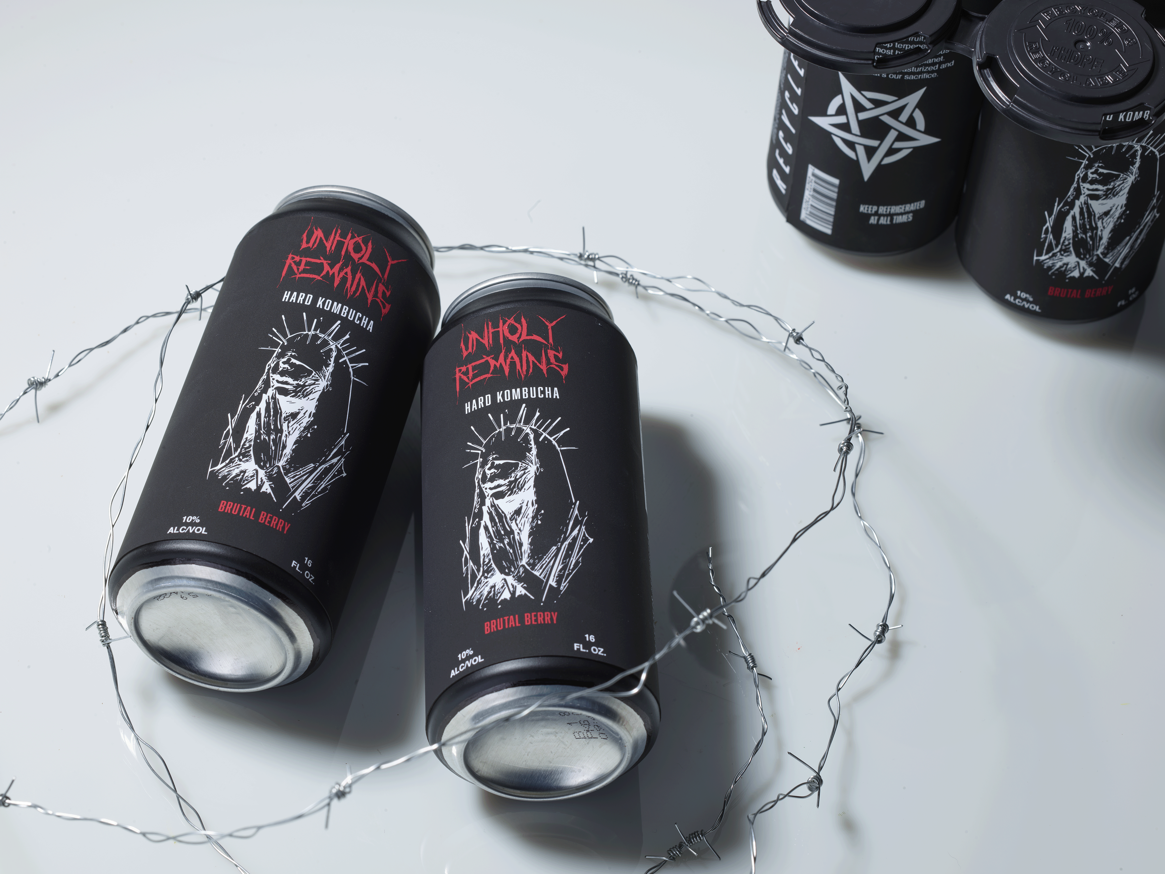 "Unholy Remains" is a heavy metal/satanic-themed hard kombucha brand, designed two years ago as a beverage packaging project. The name cleverly references the SCOBY sediment found in kombucha. The logo features a heavy metal typeface, while the packaging includes artwork of a blindfolded nun with a crown of thorns, praying, and an inverted pentagram. This design embodies the dark and rebellious spirit of the brand, appealing to fans of heavy metal and hard kombucha.