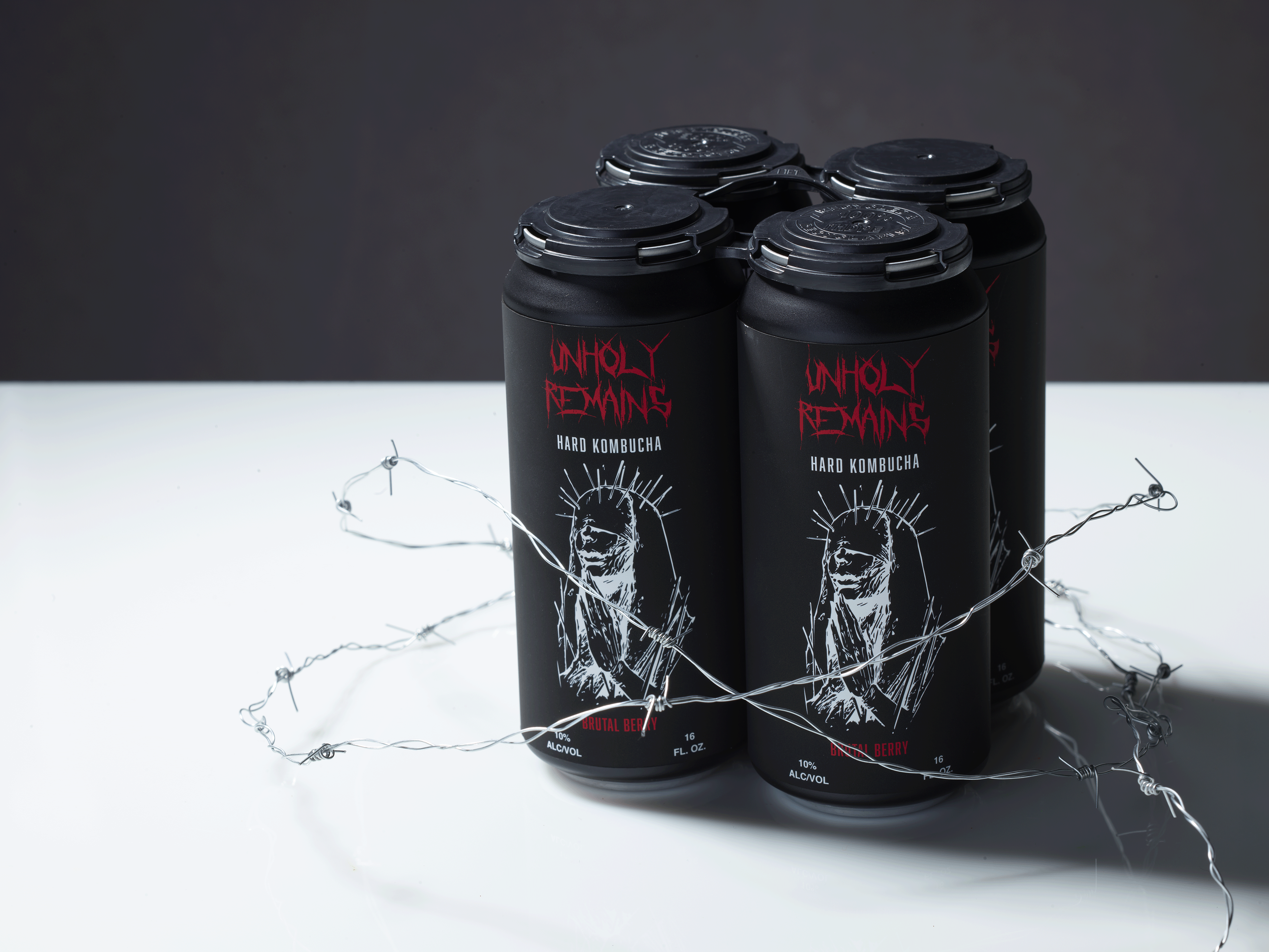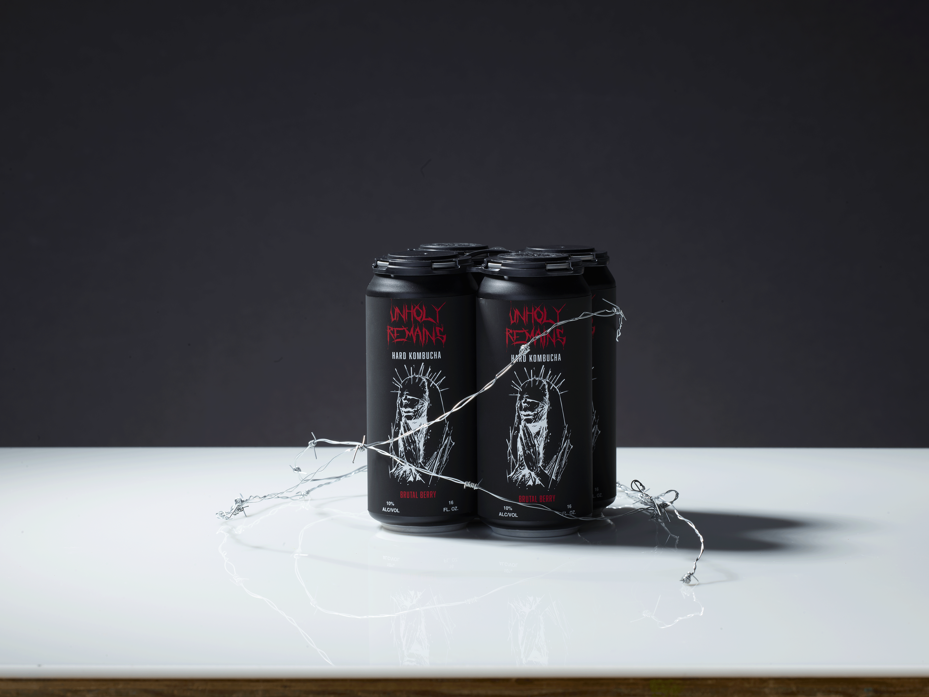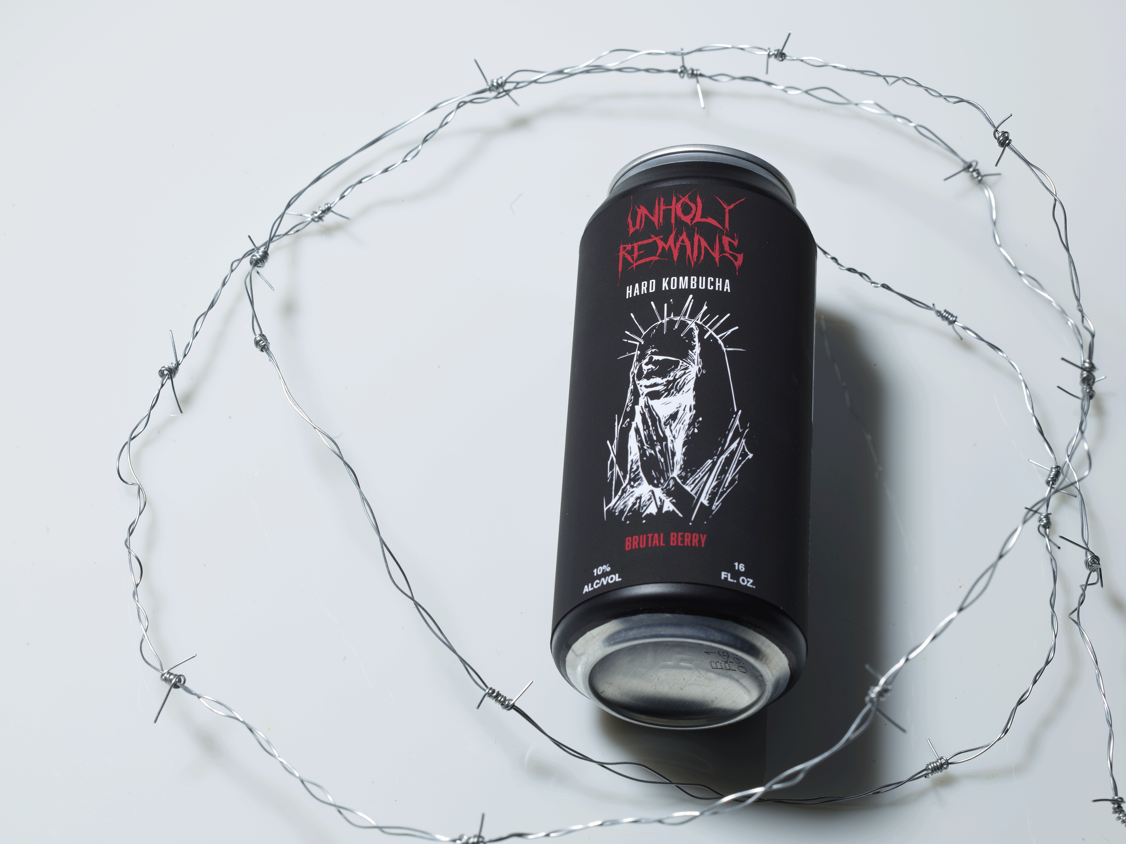 "Unholy Remains" is a heavy metal/satanic-themed hard kombucha brand, designed two years ago as a beverage packaging project. The name cleverly references the SCOBY sediment found in kombucha. The logo features a heavy metal typeface, while the packaging includes artwork of a blindfolded nun with a crown of thorns, praying, and an inverted pentagram. This design embodies the dark and rebellious spirit of the brand, appealing to fans of heavy metal and hard kombucha.