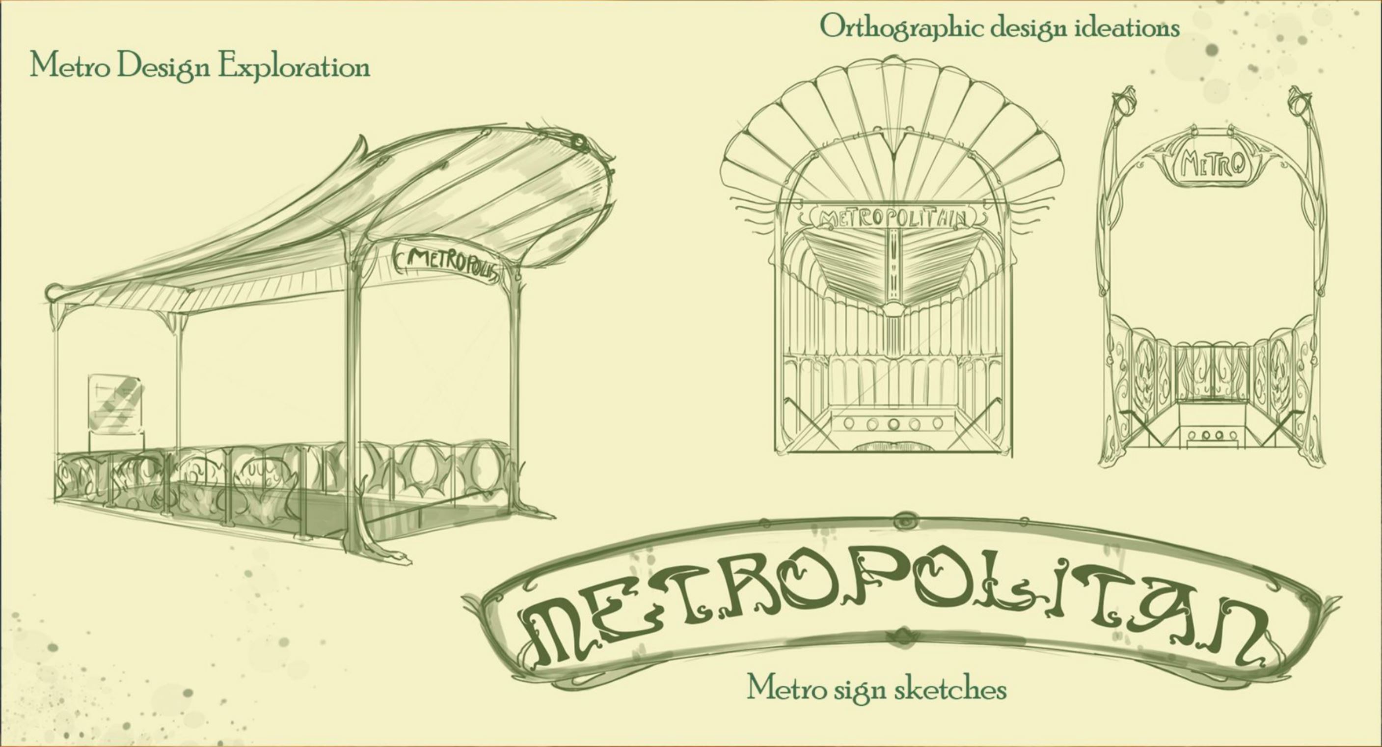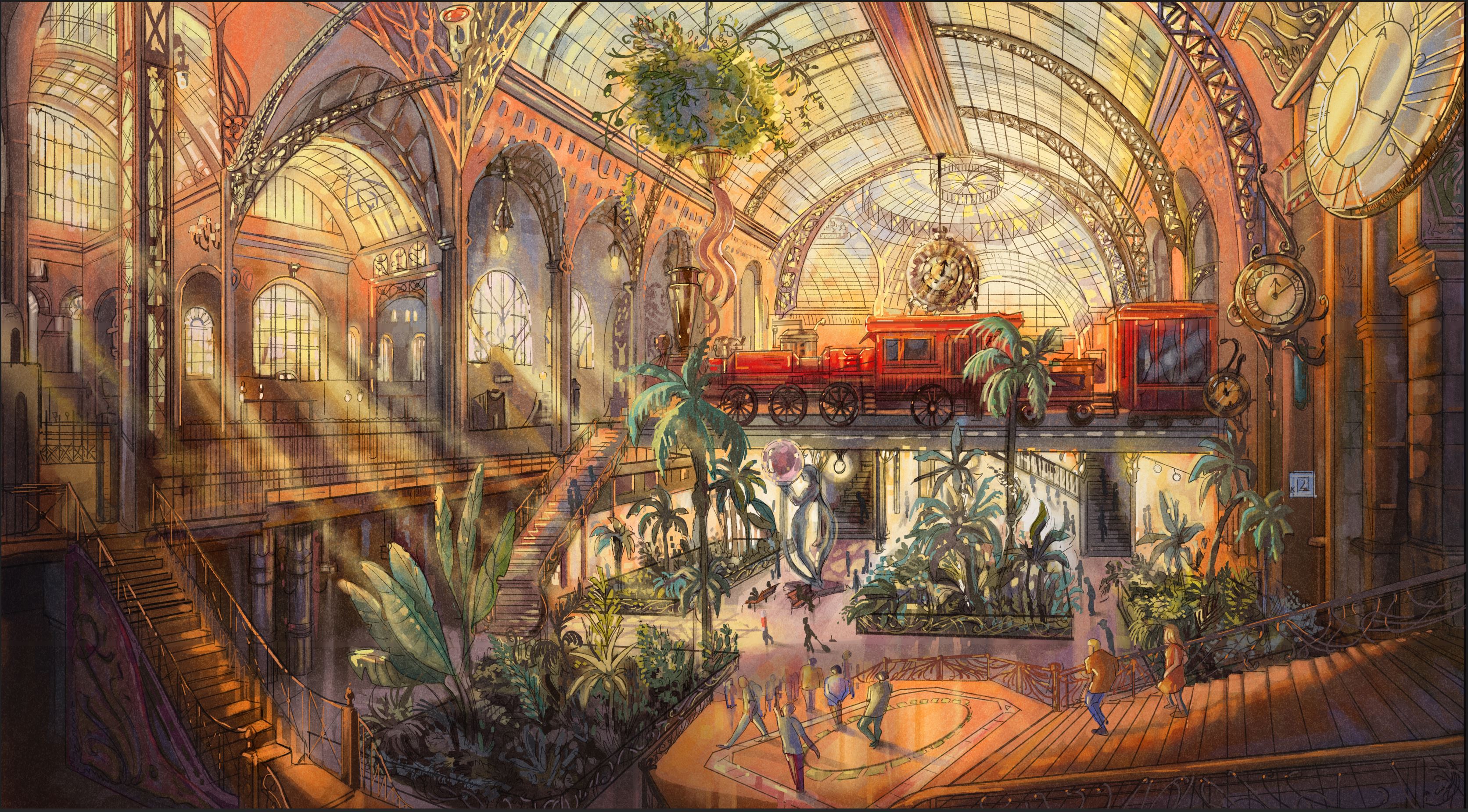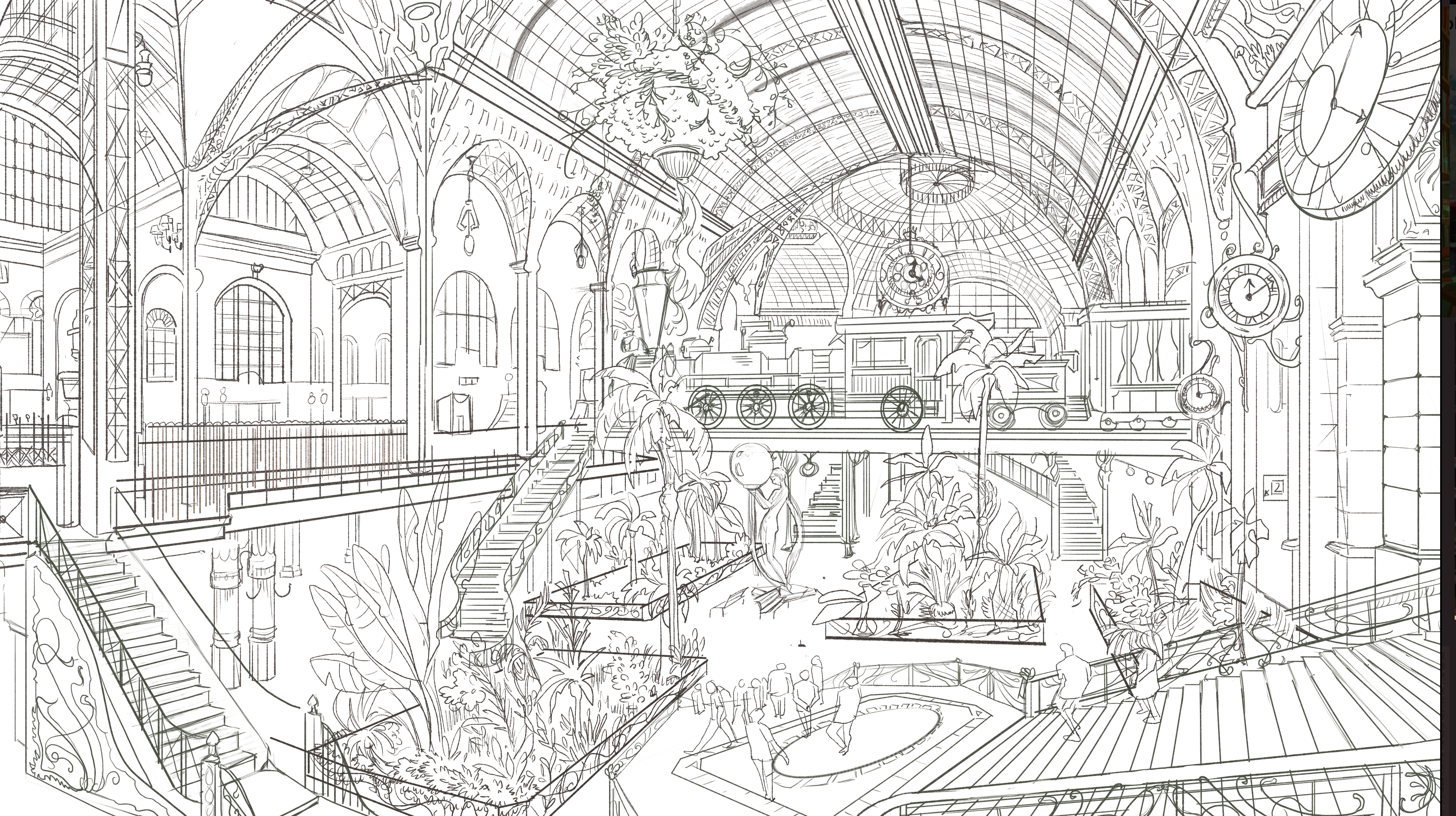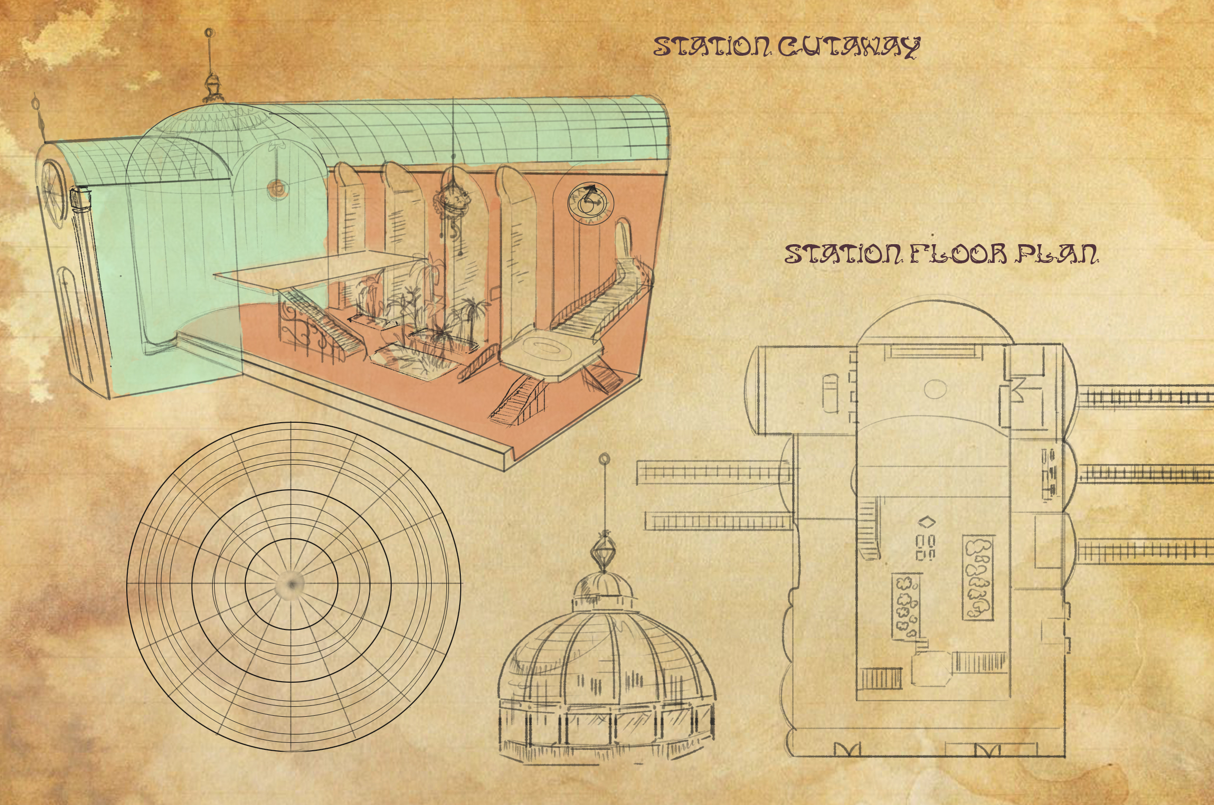 This is a Concept Art Project depicting the world building of an intimate train station in a vintage environment, for visual development.