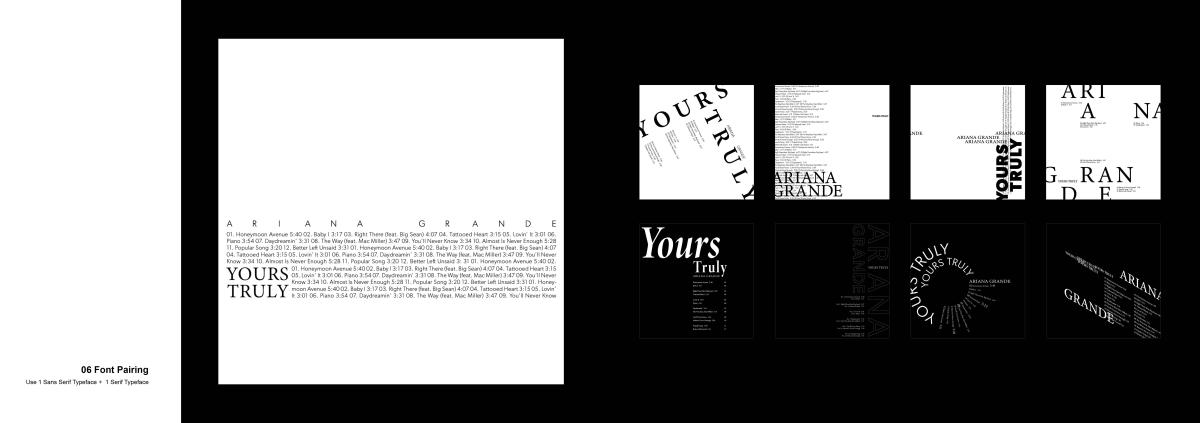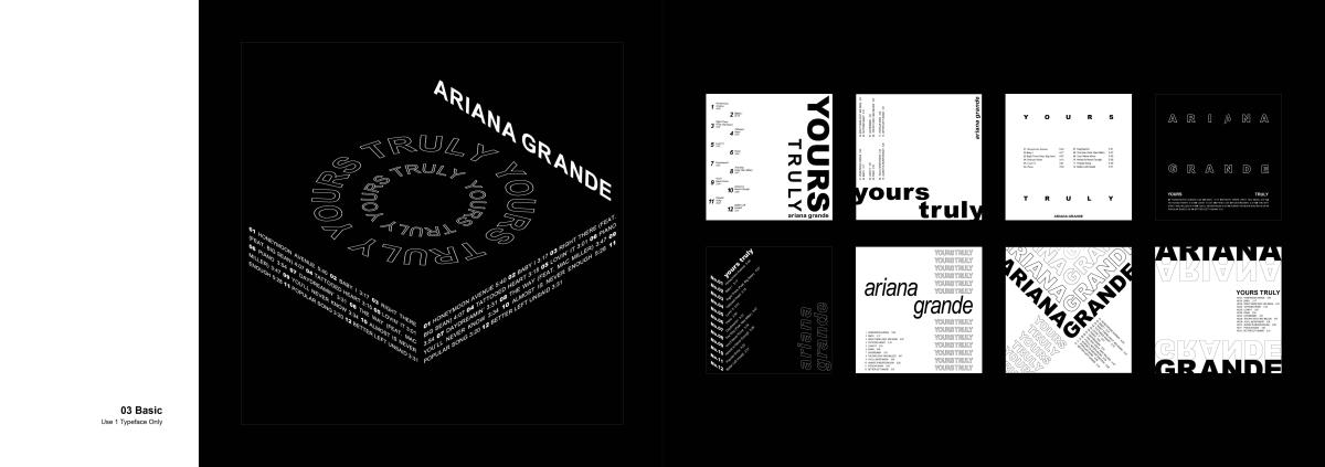 It is the page of my primary typeface information. I used Arial for most of my designs in this exercise. I liked the thickness and weight of the font. Especially, the soft curve on "R" makes "ARIANA GRANDE" and "YOURS TRULY" give a sense of smoothness.