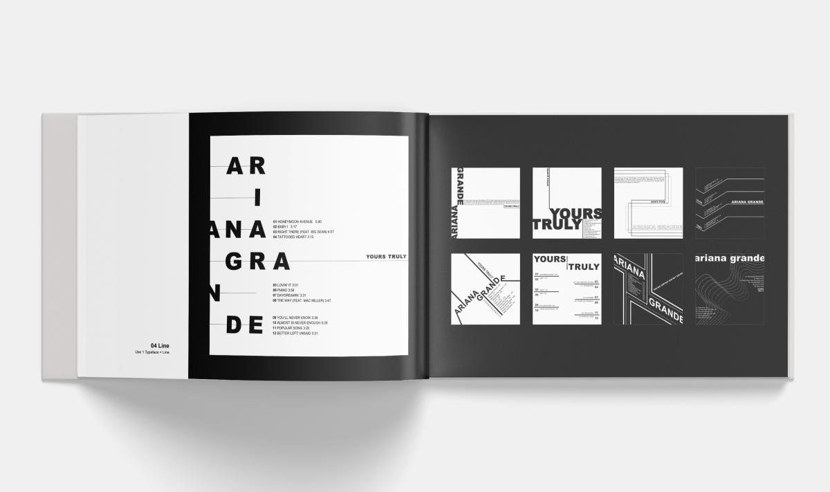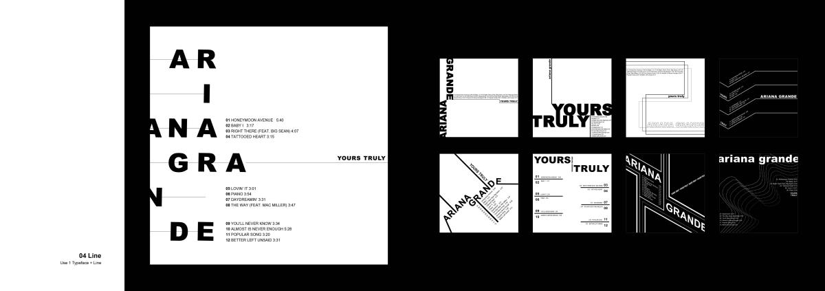 Every design contains lines as designing element. Each panel was designed by increasing the number of lines one by one. The design I chose used seven lines. Ariana Grande was separated and aligned on each line. I placed letters carefully so that there will be no error in reading them vertically with different words. By adding a line under the album's title, the negative space was used to complete the overall subtle and simple design.