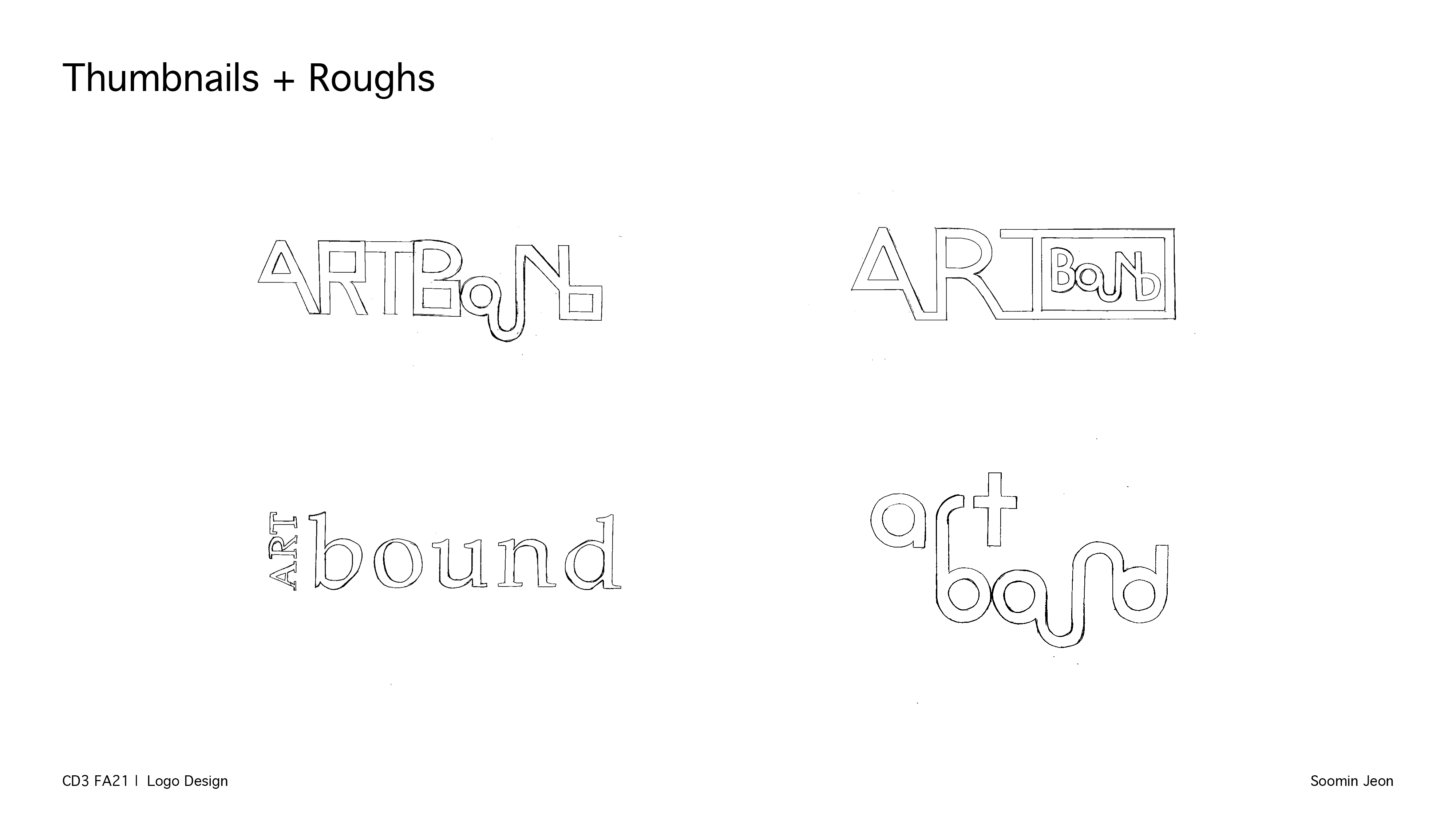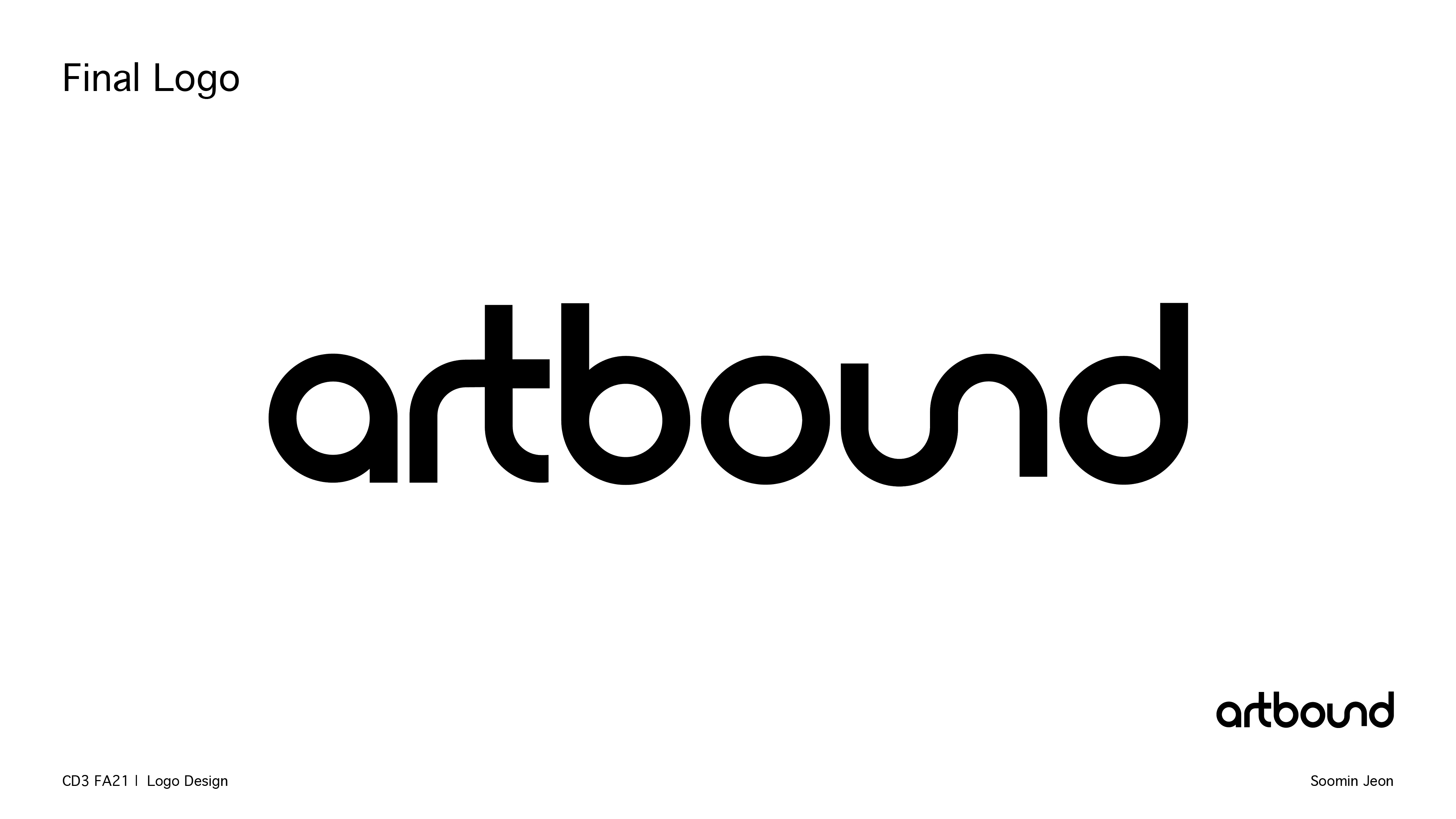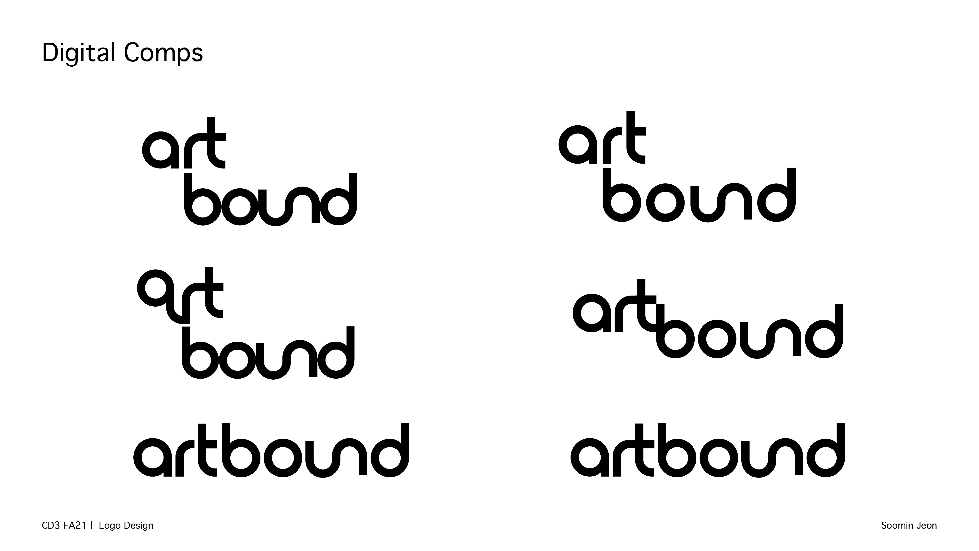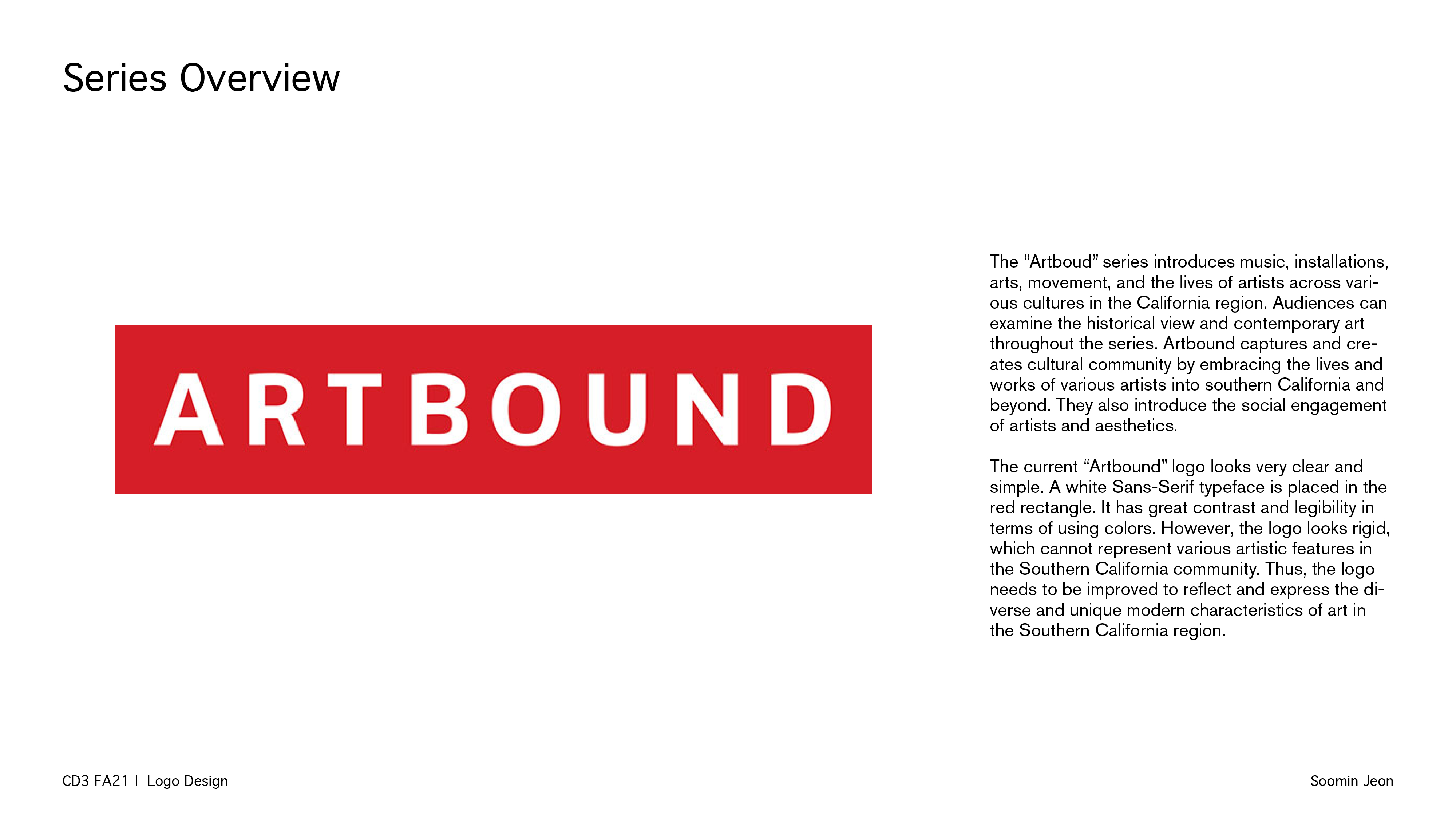 The main concept of my logo is using curve lines and ligature b/w letters. I thought that movement of lines could represent what Artbound pursues to show their cultural asset and specialty. The ligatures of each letter show their unity and free movement in terms of approaching and expressing the art pieces. The logo is expected to describe a composition where the public can look at various works and artists in southern California from multiple perspectives.