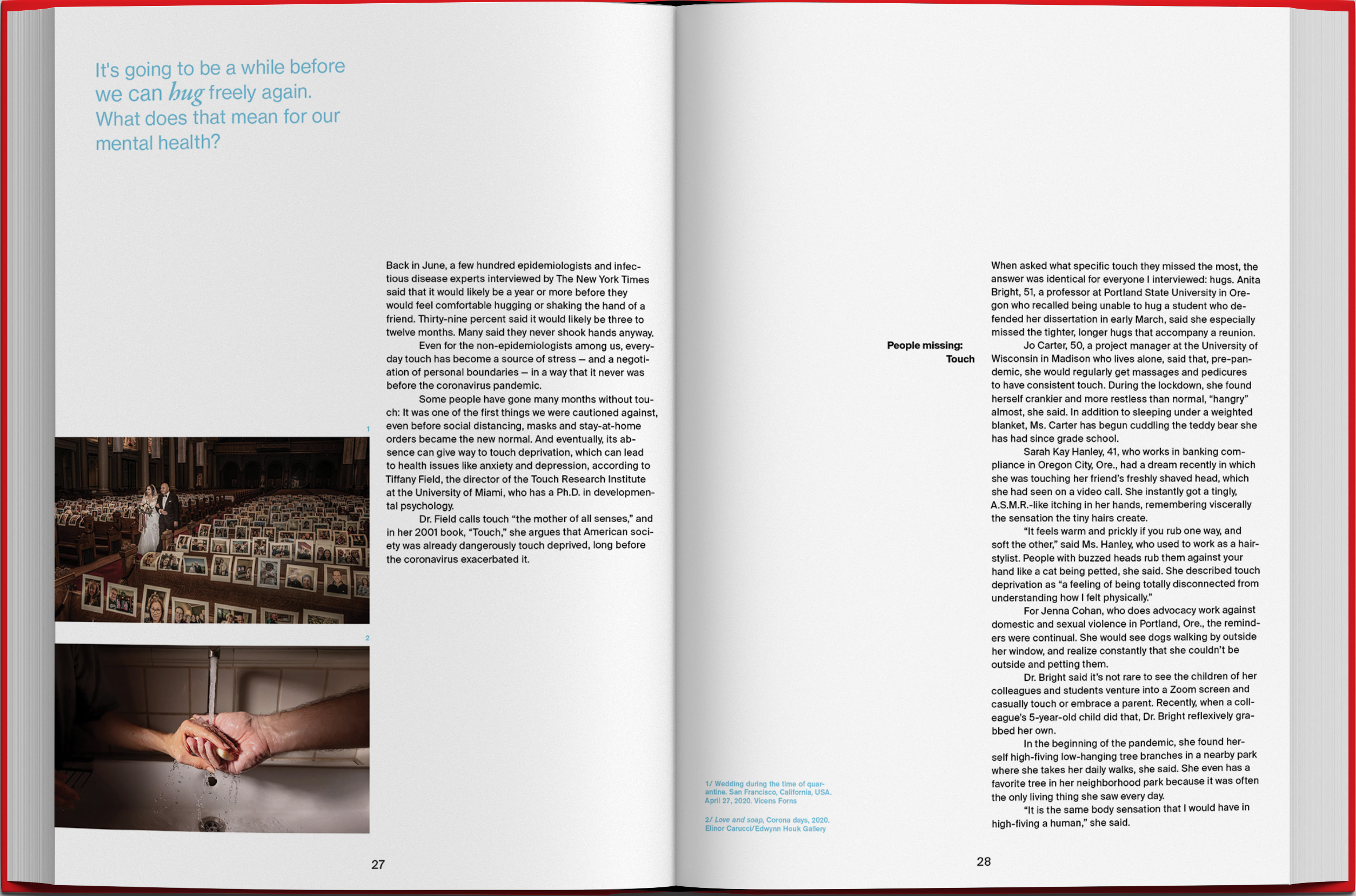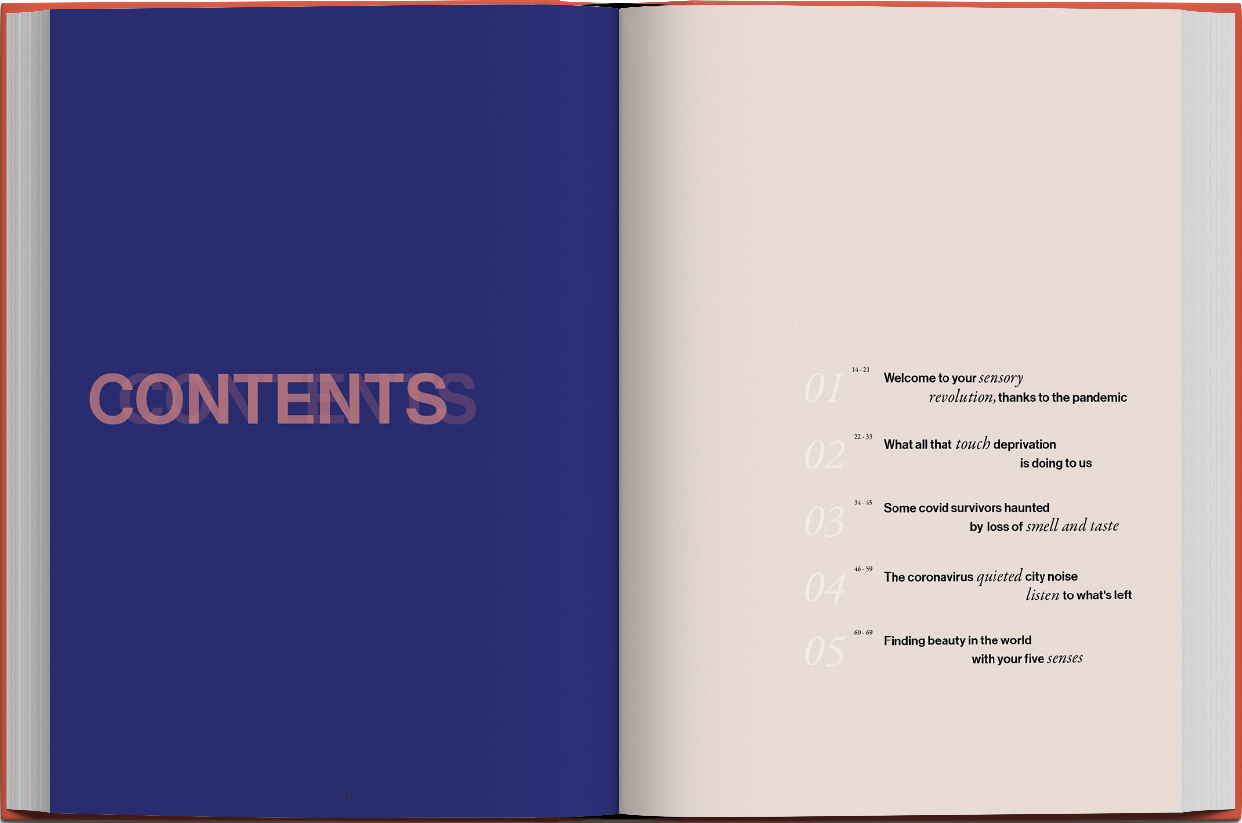 The pandemic has shifted our daily lives, and the function of our vision, hearing, smell, touch, and taste has changed or been damaged. After COVID, we have come to think again about our five senses that we have not paid much attention to. The project explores how COVID has brought about our sensory revolution and how we can be aware of and appreciate our five senses through an editorial design and a hypothetical exhibition.