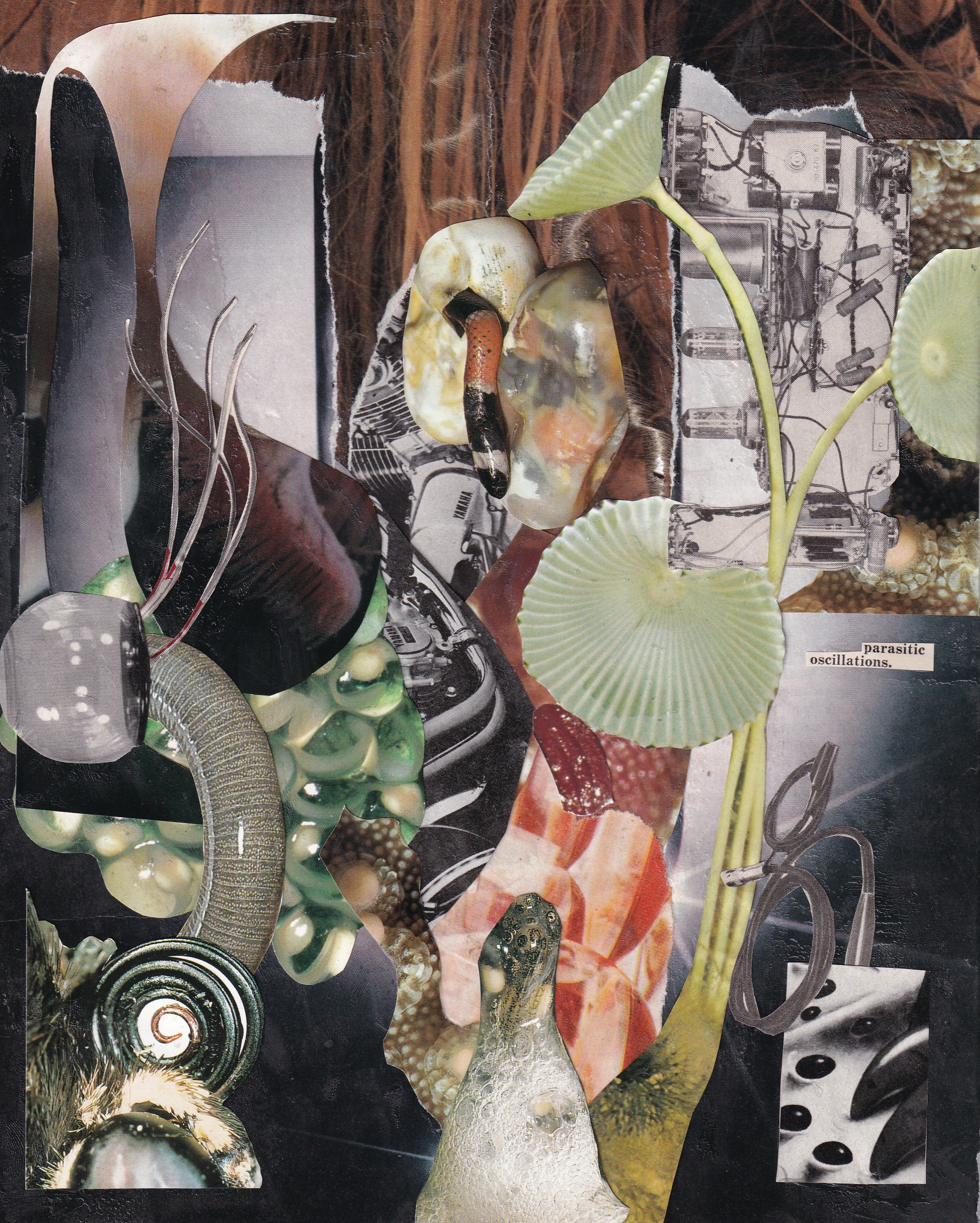 Parasitic oscillations 2024 Magazine cutouts on canvas 8 x 10 in.